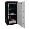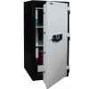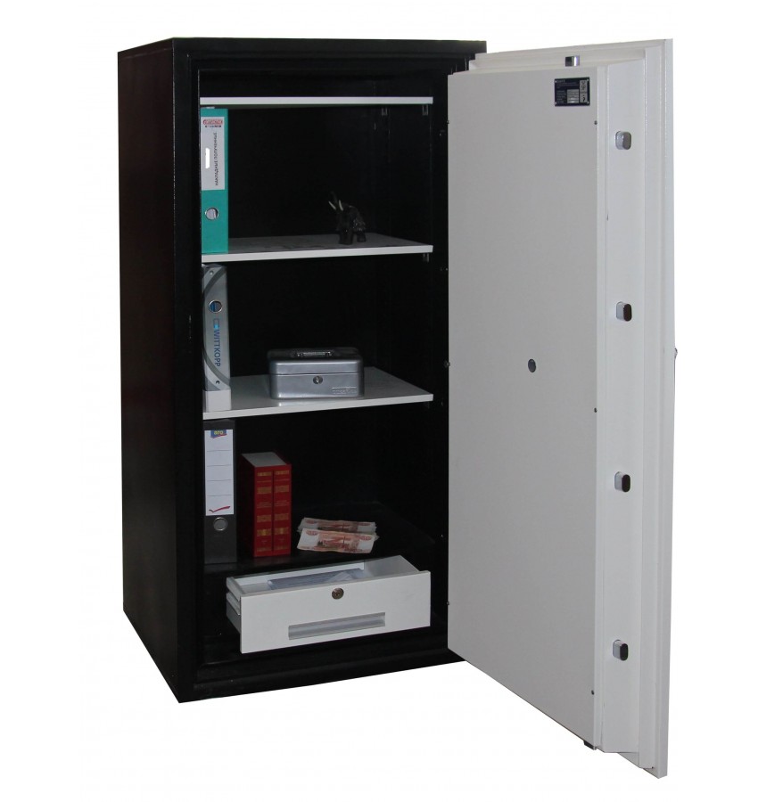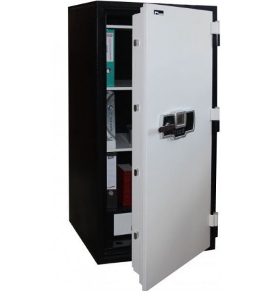 FR 1260 EL оборудован 2 полками и запираемым выдвижным ящиком, расположенным в нижней части сейфа. Шаг полок -3 см. Возможно разместить по 6 папок Корона на полке, общим количеством 18 папок. Электронный замок работает от 4 батареек АА, в случае отсутствия батареек сейф, можно будет открыть с помощью аварийного ключа, скважина аварийного ключа располагается за батарейками. В случае замены батареек код не стирается. Электронный замок оборудован дисплеем, на котором отображается дата и время.При совершении каких либо действий с замком происходит звуковое оповещение. Возможности замка: