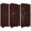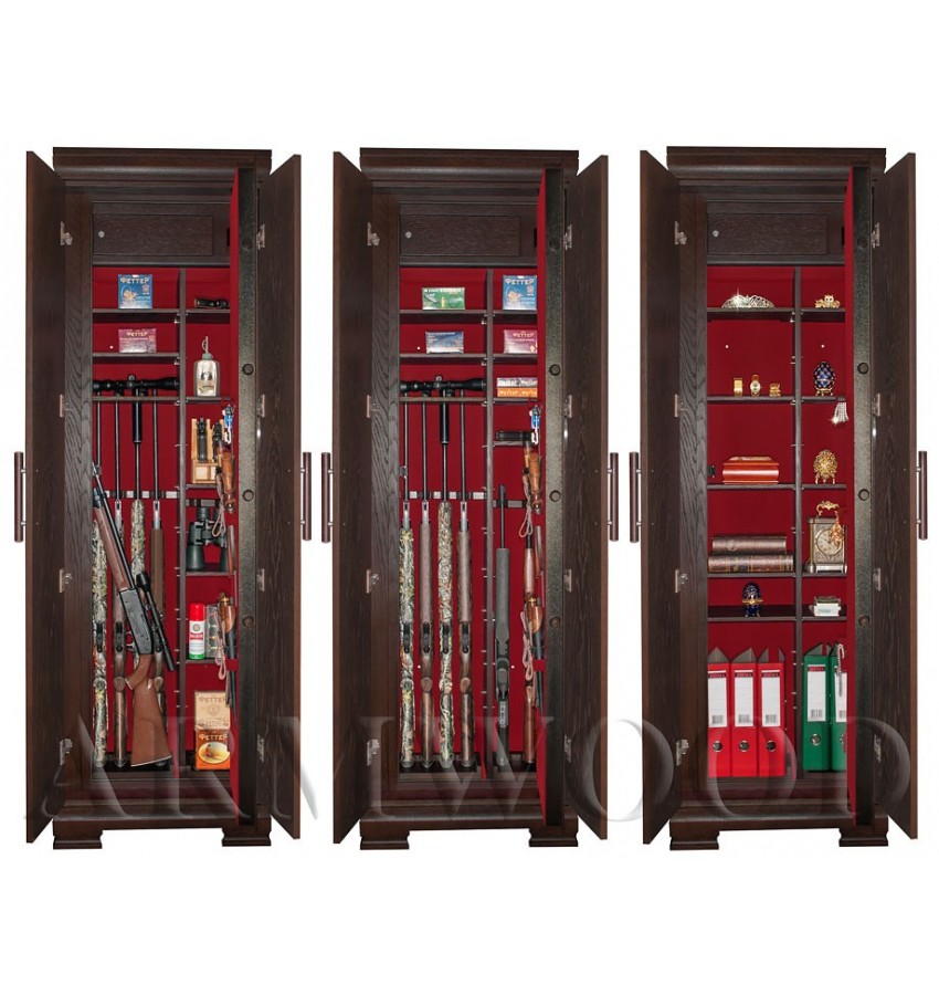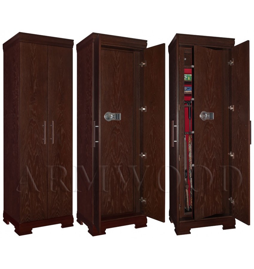 ОписаниеСейф в скрытом исполнении. Имеет две дополнительные наружные мебельные двери, за которыми скрыт непосредственно сам сейф. Снаружи изделие выглядит как деревянный мебельный шкаф. Сейфы полностью удовлетворяют требованиям МВД к хранению оружия. Наружная отделка - натуральное дерево. Универсальный сейф, может использоваться как оружейный сейф либо как личный (офисный) сейф. Замок Сейф оборудован высокосекретным сертифицированным электронным кодовым замком MAUER (Германия). Этот замок Вы можете использовать с одним пользовательским кодом либо с двумя кодами: код руководителя (мастер-код) и рабочий код. Подробная и понятная инструкция на русском языке прилагается. Питание электронного замка от стандартной батарейки. Долгий срок службы батарейки. Простая смена разряженной батарейки. Сейф имеет мощную вертикальную и горизонтальную ригельную систему с запиранием по всем сторонам. Защита Дверь сейфа имеет коробчатую конструкцию для дополнительного усиления. Петли внутренние из стали 6мм. Усиленный корпус. Внутреннее устройство Внутри сейфа запираемое (патронное) отделение и вертикальная перегородка, которая делит внутреннее пространство сейфа на два отделения. Внутри широкого отделения пять съёмных полок и съёмные деревянные ложементы на четыре ствола. Также в широком отделении имеется съёмный боковой роликовый ложемент-зажим (производства Германии) с регулируемой высотой установки (для хранения в широком отделении 5-го ствола, либо для дополнительной фиксации оружия с оптикой). Внутри узкого отделения пять коротких съёмных полок и съёмные деревянные ложементы на два ствола. Все полки с регулируемой высотой установки. По желанию заказчика возможна поставка с дополнительными полками. На внутренней поверхности двери сейфа имеются крючки, а так же держатели для удобного хранения ножей. Ружья можно хранить как в широком, так и в узком отделениях сейфа. Внутренняя отделка Сейфы ARMWOOD модификации FLOCK+ имеют престижную полную внутреннюю мягкую отделку флокированием бархатом (различных цветов по нашему каталогу), например на фото – флок бордо. Полная внутренняя мягкая отделка защищает Ваше оружие от контакта с металлом, царапин повреждений и т.п. Некоторые варианты флока представлены на дополнительном фото. В модификации FLOCK+ фасады внутренних запираемых отделений имеют отделку деревом. Внутренняя перегородка и полки также выполнены из дерева. Установка Предусмотрена возможность крепления сейфа к стене. По желанию заказчика возможна поставка в исполнении, предусматривающем так же крепление и к полу. Модификации В зависимости от типа внутренней отделки имеются пять модификаций этих оружейных сейфов. Модификация Primary (базовая) имеет деревянные ложементы, отделанные бархатом либо винилискожей либо ложементы «премиум». Модификации Lux и Lux+ имеют дополнительно к базовой - мягкую полную внутреннюю отделку винилискожей или бархатом. Различные варианты цвета бархата и винилискожи по нашему каталогу. Модификация Lux+ отличается от модификации Lux следующим: дополнительная отделка фасадов внутренних запираемых отделений деревом. Модификации Flock и Flock+ - имеют полную внутреннюю мягкую отделку флокированием бархатом (различных цветов по нашему каталогу) и ложементы «премиум». Модификация Flock+ отличается от модификации Flock с