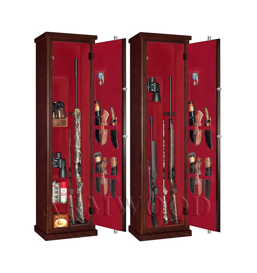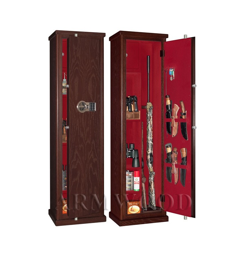 ОписаниеЭлитный оружейный сейф с отделкой натуральным деревом. Сейфы полностью удовлетворяют требованиям МВД к хранению оружия. Замок Сейф оборудован высокосекретным сертифицированным электронным кодовым замком. Этот замок Вы можете использовать с одним пользовательским кодом либо с двумя кодами: код руководителя (мастер-код) и рабочий код. Подробная и понятная инструкция на русском языке прилагается. Питание электронного замка от стандартной батарейки. Долгий срок службы батарейки. Простая смена разряженной батарейки. Сейф может поставляться с электронными замками различных типов. Уточните у Вашего менеджера при заказе тип электронного замка и дизайн кодовой панели. Сейф имеет мощную вертикальную и горизонтальную ригельную систему с запиранием по всем сторонам. Внутреннее устройство Внутри сейфа вертикальная перегородка, которая делит внутреннее пространство сейфа на два отделения. Внутри широкого отделения верхние и нижние деревянные ложементы на три ствола. Внутри узкого отделения вертикальнорасположенное внутреннее запираемое (патронное) отделение. Ниже запираемого отделения находятся три съёмные полки с регулируемой высотой установки. Если устанавливать не все полки, то на их месте можно хранить четвёртый и пятый ствол. На двери сейфа: два удобных держателя для ножей, а также крючки для шомполов, ключей и пр. Сейф имеет полную внутреннюю мягкую отделку флокированием бархатом (различных цветов по нашему каталогу). Например на фото в открытом виде флок – бордовый. Некоторые возможные варианты флока представлены на дополнительном фото. Полная внутренняя мягкая отделка защищает Ваше оружие от контакта с металлом, царапин, повреждений и т.п. Установка Предусмотрена возможность крепления сейфа к стене. По желанию заказчика возможна поставка в исполнении, предусматривающем также крепление к полу. Модификации Сейф может быть так же поставлен в базовой модификации Primary. По желанию заказчика возможно изменение размеров, конструкции, внутреннего устройства и т.п. Возможна замена верхних деревянных ложементов на ложементы других типов (роликовые ложементы-зажимы производства Германии, специальные ложементы для хранения оружия с крупной оптикой и т.п.). Дополнительная информация Имеются различные варианты отделки натуральным дубом сейфов серии Armwood (под различную мебель). Возможна поставка данного сейфа в исполнении универсальный сейф. В этом случае сейф поставляется с дополнительными полками и может использоваться не только как оружейный сейф, но и как личный и офисный сейф. ДоставкаСтоимость доставки по Москве в пределах МКАД: при заказе от 20 000 рублей бесплатно, менее 20000 руб - 1200 рублей Доставка возможна на 06.12.2025 или на 07.12.2025 Доставка по РФ и СНГ: по тарифам транспортных компаний Стоимость разгрузки: 900 руб СамовывозСамовывоз: со склада, после после подтверждения заказа ОплатаОплата: наличными при получении товара, безналичный расчет ( 100% предоплата) Сейф Armwood 524 EL Flock |