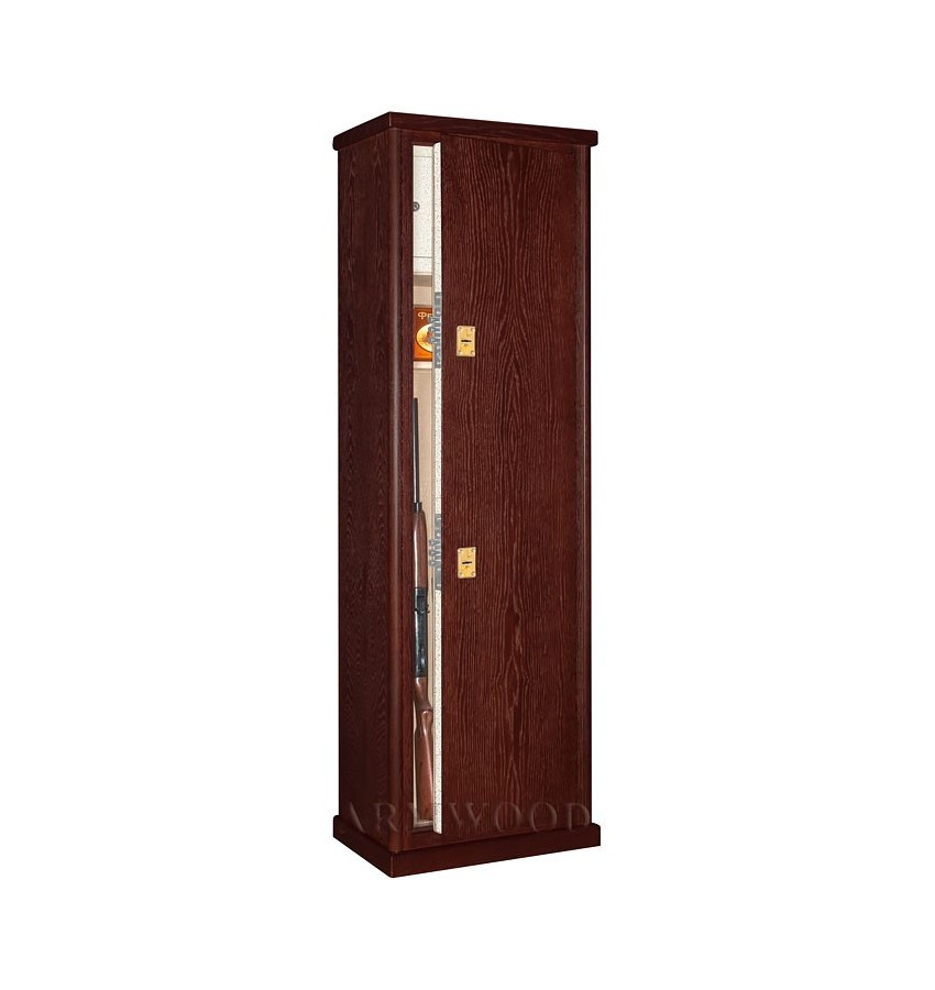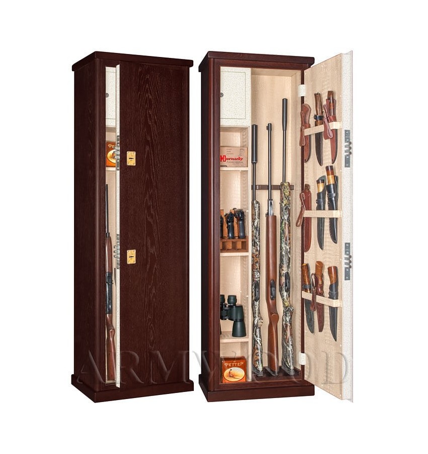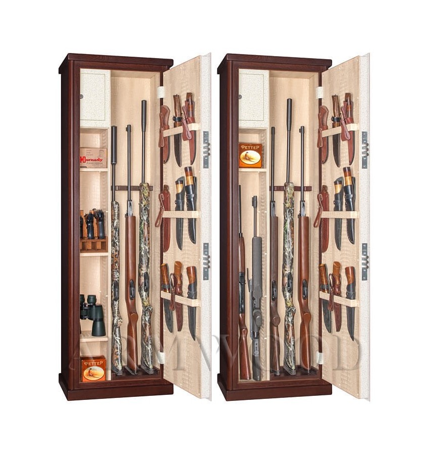 ОписаниеЭлитный оружейный сейф с отделкой натуральным деревом. Сейфы полностью удовлетворяют требованиям МВД к хранению оружия. Имеются различные варианты отделки натуральным деревом сейфов серии Armwood (под различную мебель). Некоторые варианты представлены на дополнительном фото. Возможна поставка данного сейфа в исполнении универсальный сейф. В этом случае сейф поставляется с дополнительными полками и может использоваться не только как оружейный сейф, но и как личный и офисный сейф. Замок Два сертифицированных трёхригельных ключевых замка 3 класса. Замки разработаны совместно с Cisa (Италия). По желанию заказчика возможна поставка сейфов с замками производства Германии: Mauer или Wittkopp. Защита Дверь сейфа имеет коробчатую конструкцию для дополнительного усиления. Петли внутренние из стали 6мм. Усиленный корпус. Внутреннее устройство Внутри сейфа вертикальная перегородка, которая делит внутреннее пространство сейфа на два отделения. Внутри широкого отделения верхние и нижние деревянные ложементы на три ствола. Внутри узкого отделения вертикальнорасположенное внутреннее запираемое (патронное) отделение. Ниже запираемого отделения находятся три съёмные полки с регулируемой высотой установки. Если устанавливать не все полки, то на их месте можно хранить четвёртый и пятый ствол. По желанию заказчика возможна установка дополнительного роликового ложемента, который легко устанавливается в любое нужное место сейфа (например этот ложемент можно использовать для более удобного хранения оружия с оптикой). Согласуйте это с Вашим менеджером. На двери сейфа три удобных держателя для ножей. Сейфы ARMWOOD модификации LUX имеют полную внутреннюю мягкую отделку искусственной кожей (различных цветов и рисунков по нашему каталогу). NEW! Поступила искусственная кожа, имитирующая кожу крокодилов, змей и т.п. Тоже различных цветов! На основном фото пример сейфа с внутренней отделкой «бежевый крокодил». Полная внутренняя мягкая отделка защищает Ваше оружие от контакта с металлом, царапин повреждений и т.п. Некоторые варианты искусственной кожи представлены на дополнительном фото. Установка Предусмотрена возможность крепления сейфа к стене. По желанию заказчика возможна поставка в исполнении, предусматривающем также крепление к полу. Модификации В зависимости от типа внутренней отделки имеются три модификации этих оружейных сейфов. Модификация Primary(базовая) имеет деревянные ложементы отделанные винилискожей либо ложементы «премиум». Модификация Lux имеет дополнительно к базовой мягкую полную внутреннюю отделку винилискожей. Различные варианты винилискожи по нашему каталогу. Модификация Flock имеет полную внутреннюю отделку флокированием бархатом (различных цветов по нашему каталогу), и ложементы «премиум». Дополнительная информация Имеются различные варианты отделки натуральным деревом сейфов серии Armwood (под различную мебель). Возможна поставка данного сейфа в исполнении универсальный сейф. В этом случае сейф поставляется с дополнительными полками и может использоваться не только как оружейный сейф, но и как личный и офисный сейф. ДоставкаСтоимость доставки по Москве в пределах МКАД: при заказе от 20 000 рублей бесплатно, менее 20000 руб - 1200 рублей Доставка возможна на 04.12.2025 или на 05.12.2025 Доставка по РФ и СНГ: по тарифам транспортных к
