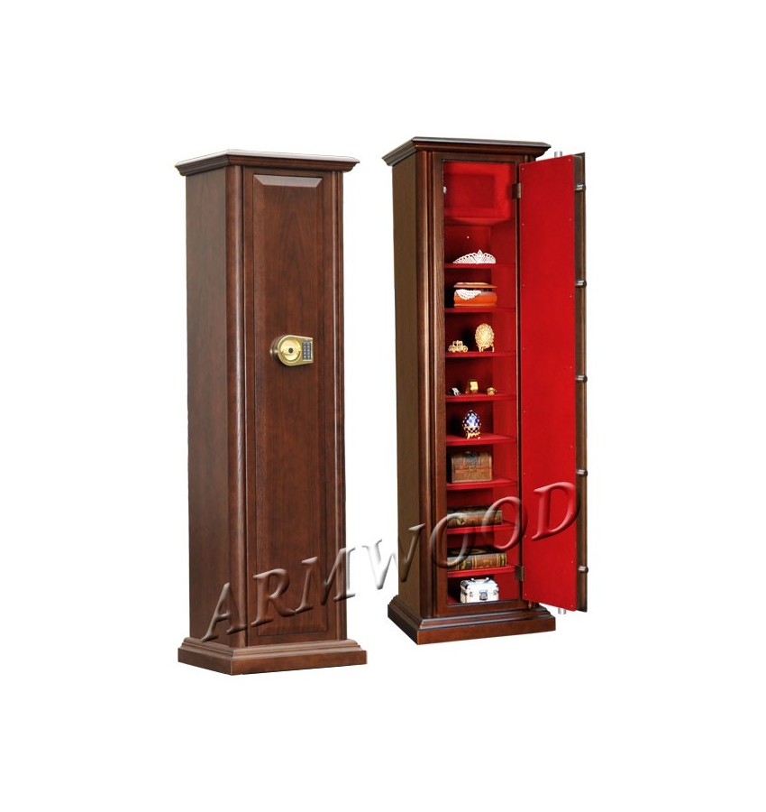 Элитный сейф с отделкой натуральным деревом. Замок Сейф оборудован высокосекретным сертифицированным электронным кодовым замком La Gard (США). Этот замок Вы можете использовать с одним пользовательским кодом либо с двумя кодами: код руководителя (мастер-код) и рабочий код. Подробная и понятная инструкция на русском языке прилагается. Питание электронного замка от стандартной батарейки. Долгий срок службы батарейки. Простая смена разряженной батарейки. Сейф имеет мощную вертикальную и горизонтальную ригельную систему с запиранием по всем сторонам. Защита Дверь сейфа имеет коробчатую конструкцию для дополнительного усиления. Петли внутренние из стали 6мм. Усиленный корпус. Внутреннее устройство Внутри сейфа запираемое отделение и 8 съемных полок с регулируемой высотой установки. Внутренняя отделка Сейфы ARMWOOD модификации FLOCK имеют престижную полную внутреннюю мягкую отделку флокированием бархатом (различных цветов по нашему каталогу), например на фото – флок бордо. Полная внутренняя мягкая отделка защищает Ваше оружие от контакта с металлом, царапин повреждений и т.п. Некоторые варианты флока представлены на дополнительном фото. Установка Предусмотрена возможность крепления сейфа к стене. По желанию заказчика возможна поставка в исполнении, предусматривающем также крепление к полу. Модификации В зависимости от типа внутренней отделки имеются четыре модификации этих сейфов. Модификация Primary – это базовая модификация. Модификации Lux и Lux+ имеют дополнительную мягкую полную внутреннюю отделку винилискожей или бархатом. Различные варианты цвета бархата и винилискожи по нашему каталогу. New! Поступила винилискожа, имитирующая кожу крокодилов, змей и т.п. Тоже различных цветов! Модификация Lux+ отличается от модификации Lux следующим: дополнительная отделка фасада внутреннего запираемого отделения деревом. Модификация Flock имеет полную внутреннюю мягкую отделку флокированием бархатом (различных цветов по нашему каталогу). На фотографии в открытом виде представлен сейф в модификации Flock (в данном случае флок - бордо). Полная внутренняя мягкая отделка защищает хранимые в сейфе ценные предметы от контакта с металлом, царапин, повреждений и т.п. Металлические детали сейфа имеют гигиенически безопасное износо- и коррозионно-устойчивое полимерно-порошковое покрытие на основе материалов производства Италии или Франции. Имеются покрытия различных цветов и структур: металлики, антики и д.р. По желанию заказчика возможно изменение размеров, конструкции, внутреннего устройства и т.п. По желанию заказчика возможна поставка сейфов с электронными замками Mauer (Германия) вместо La Gard (США). Для любого из этих замков Вы так же можете выбрать дизайн кодовой панели электронного замка: Chrom либо Gold. Кодовая панель Mauer Gold имеет покрытие золотом 24 карата (подтверждено европейским сертификатом). Дополнительная информация Имеются различные варианты отделки натуральным деревом сейфов серии Armwood (под различную мебель). Данные сейфы могут также поставляться в исполнении оружейный либо универсальный сейф с дополнительными съёмными ложементами.