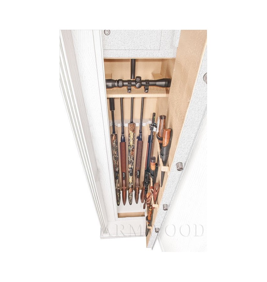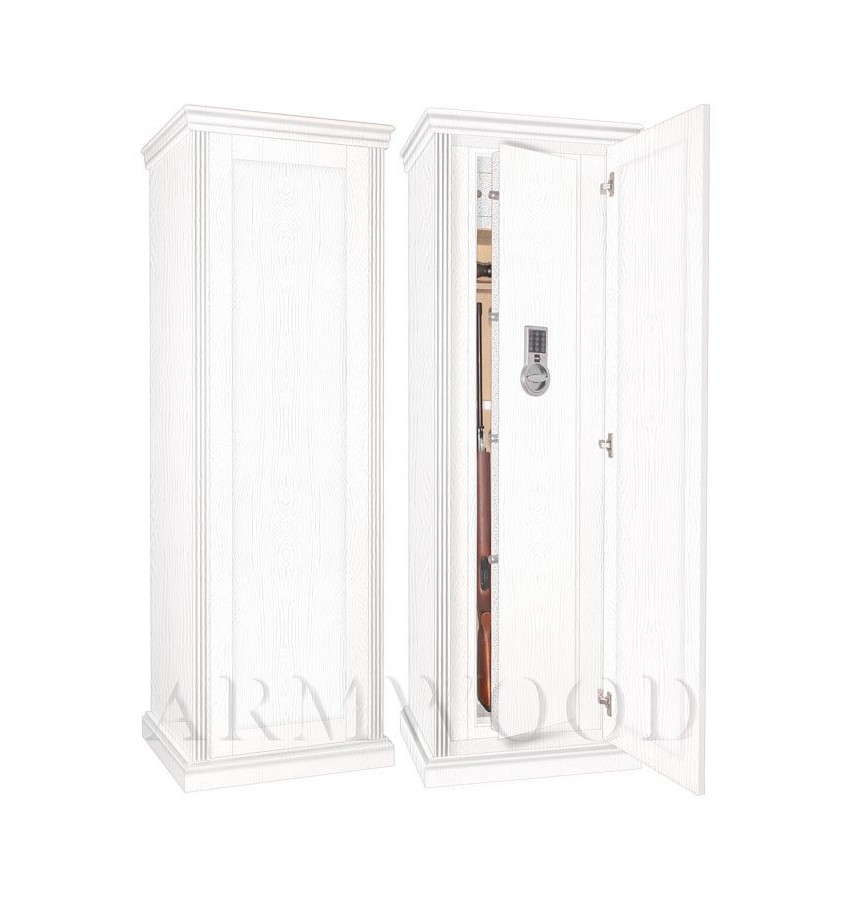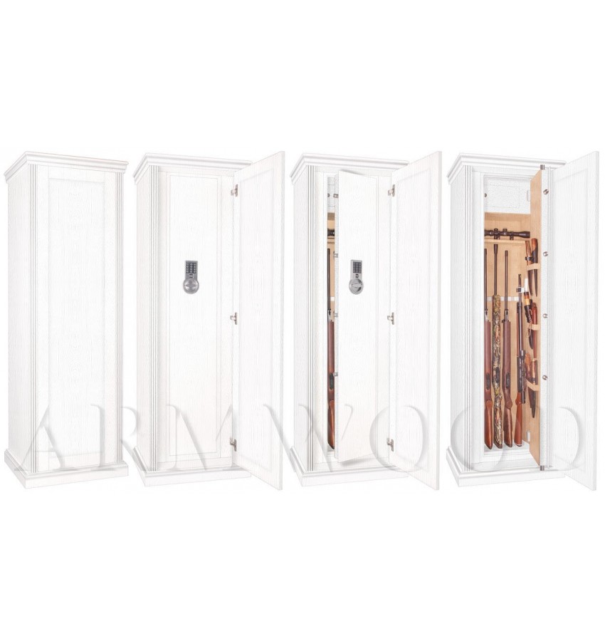 ОписаниеСейф в скрытом исполнении. Имеет дополнительную наружную мебельную дверь, за которой скрыт непосредственно сам сейф. Снаружи изделие выглядит как деревянный мебельный шкаф. Сейфы полностью удовлетворяют требованиям МВД к хранению оружия. Наружная отделка - натуральное окрашенное дерево (по каталогу RAL) с патинированием. Возможны различные цвета окраски и патинирования. Замок Сейф оборудован высокосекретным сертифицированным электронным кодовым замком MAUER (Германия). Этот замок Вы можете использовать с одним пользовательским кодом либо с двумя кодами: код руководителя (мастер-код) и рабочий код. Подробная и понятная инструкция на русском языке прилагается. Питание электронного замка от стандартной батарейки. Долгий срок службы батарейки. Простая смена разряженной батарейки. Сейф имеет мощную вертикальную и горизонтальную ригельную систему с запиранием по всем сторонам. Защита Дверь сейфа имеет коробчатую конструкцию для дополнительного усиления. Петли внутренние из стали 6мм. Усиленный корпус. Внутреннее устройство Внутри сейфа запираемое (патронное) отделение, съёмная полка и деревянные ложементы на пять стволов. Кроме того на одной из боковых стенок сейфа имеется съёмный роликовый ложемент-зажим (производства Германии) с регулируемой высотой установки, который используется для хранения шестого ствола либо для дополнительной фиксации оружия с оптикой. На внутренней поверхности двери сейфа имеются три держателя для удобного хранения ножей. По желанию заказчика возможна поставка с дополнительными полками. Внутренняя отделка Сейфы ARMWOOD модификации Lux имеют полную внутреннюю мягкую отделку искусственной кожей (различных цветов и рисунков по нашему каталогу). NEW! Поступила искусственная кожа, имитирующая кожу крокодилов, змей и т.п. Тоже различных цветов! На основном фото пример сейфа с внутренней отделкой «бежевый крокодил». Полная внутренняя мягкая отделка защищает Ваше оружие от контакта с металлом, царапин повреждений и т.п. Установка Предусмотрена возможность крепления сейфа к стене. По желанию заказчика возможна поставка в исполнении, предусматривающем также крепление и к полу. Модификации В зависимости от типа внутренней отделки имеются четыре модификации этих оружейных сейфов. Модификация Primary(базовая) имеет деревянные ложементы отделанные винилискожей либо ложементы «премиум». Модификации Lux и Lux+ имеют дополнительно к базовой - мягкую полную внутреннюю отделку винилискожей. Различные варианты цвета винилискожи по нашему каталогу. New! Поступила винилискожа, имитирующая кожу крокодилов, змей и т.п. Тоже различных цветов! Модификация Lux+ отличается от модификации Lux следующим: дополнительная отделка фасада внутреннего запираемого отделения деревом. Модификация Flock имеет полную внутреннюю отделку флокированием бархатом (различных цветов по нашему каталогу) и ложементы «премиум». Полная внутренняя мягкая отделка защищает Ваше оружие от контакта с металлом, царапин, повреждений и т.п. Металлические детали сейфа имеют гигиенически безопасное износо- и коррозионно-устойчивое полимерно-порошковое покрытие на основе материалов производства Италии или Франции. Имеются покрытия различных цветов и структур: металлики, антики и д.р. По желанию заказчика возможно изменение размеров, конструкции, 