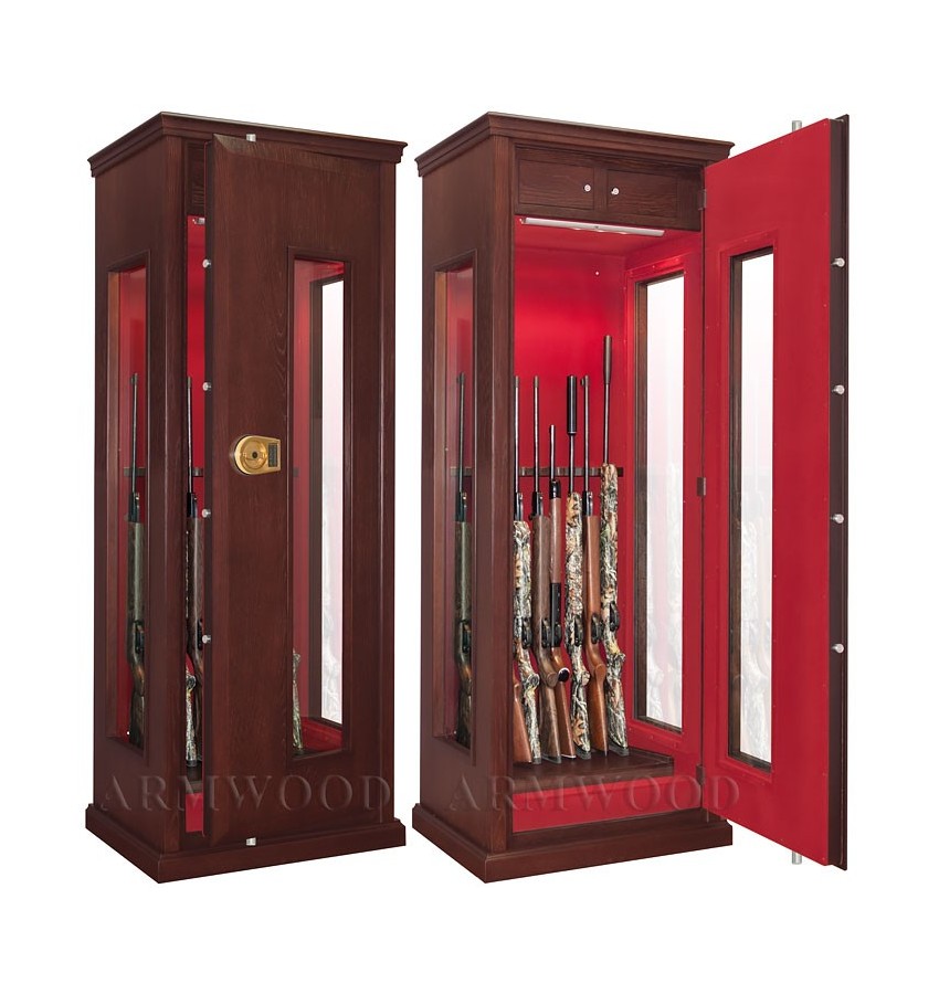 ОписаниеЭлитный оружейный сейф с отделкой натуральным деревом, бронестёклами и подсветкой. Сейф полностью удовлетворяет требованиям МВД к хранению оружия. Сейф имеет скрытый запираемый тайник. Замок Сейф оборудован высокосекретным сертифицированным электронным кодовым замком La Gard (США). Этот замок Вы можете использовать с одним пользовательским кодом либо с двумя кодами: код руководителя (мастер-код) и рабочий код. Подробная и понятная инструкция на русском языке прилагается. Питание электронного замка от стандартной батарейки. Долгий срок службы батарейки. Простая смена разряженной батарейки. Сейф имеет мощную вертикальную и горизонтальную ригельную систему с запиранием по всем сторонам. Защита Уникальное изделие - передний лист двери сейфа изготовлен из стали 6мм., но так же и весь фасад корпуса изготовлен из стали 6мм. Петли внутренние из стали 6мм. Усиленный корпус. Сейф оборудован 3-я бронестеклами (в двери и в обоих боковых стенах). Бронестёкла сертифицированы – 2-й класс пулестойкости. Внутреннее устройство Внутри сейфа два запираемых (патронных) отделения. Кроме того имеется ещё одно потайное отделение, запираемое сертифицированным трёхригельным сувальдным замком 2-го класса. Сейф оборудован удобными деревянными ложементами на 9 стволов. Сейф имеет электрическую светодиодную подсветку. Два режима работы подсветки: включение подсветки с помощью внешнего выключателя либо автоматическое включение подсветки при открывании двери сейфа (имеется датчик движения). Внутренняя отделка Сейф изготовлен в модификации FLOCK PLUS. Сейфы ARMWOOD в модификации FLOCK PLUS имеют престижную полную внутреннюю мягкую отделку флокированием бархатом (различных цветов по нашему каталогу), например на фото – флок бордо. Полная внутренняя мягкая отделка защищает Ваше оружие от контакта с металлом, царапин повреждений и т.п. В модификации FLOCK PLUS фасады внутренних запираемых отделений имеют отделку деревом. Некоторые варианты флока представлены на дополнительном фото. Установка Предусмотрена возможность крепления сейфа к стене. По желанию заказчика возможна поставка в исполнении, предусматривающем так же крепление и к полу. Модификации В зависимости от типа внутренней отделки имеются три модификации этих оружейных сейфов. Модификация Primary (базовая) – без дополнительной мягкой отделки поверх порошкового покрытия (различных цветов по выбору). Ложементы «премиум». Модификация Flock - имеет полную внутреннюю мягкую отделку флокированием бархатом (различных цветов по нашему каталогу). Ложементы «премиум». Модификация FLOCK PLUS отличается от модификации Flock следующим: дополнительная отделка фасадов внутренних запираемых отделений деревом. Металлические детали сейфа имеют гигиенически безопасное износо- и коррозионно-устойчивое полимерно-порошковое покрытие на основе материалов производства Италии или Франции. Имеются покрытия различных цветов и структур: металлики, антики и д.р. По желанию заказчика возможно изменение размеров, конструкции, внутреннего устройства (в т.ч. добавление полок) и т.п. Возможна замена верхних деревянных ложементов на ложементы других типов (роликовые ложементы-зажимы производства Германии, специальные ложементы для хранения оружия с крупной оптикой и т.п.). Возможна поставка таких сейфов с ключевыми замками Mauer (Гер