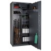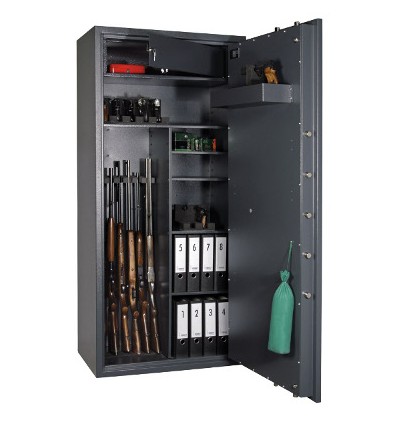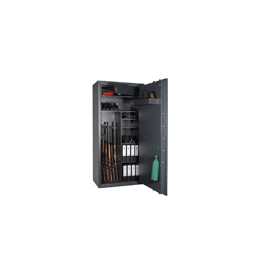 Сейфы Cervo обладают следующими особенностями: Повышенная устойчивость лицевой панели к инструментам взлома. Угол открытия двери - 180 °. Трехсторонняя ригельная система (диаметр ригелей 25 мм), блокирующаяся при попытке взлома. Замок защищен твердосплавной пластиной от высверливания, легкое открывание и запирание двери обеспечивается за счёт использования в конструкции сейфа удобной по форме ручки. Комплектация: 1 трейзер (высота трейзера 20мм). На внутреннем шкафчике (трейзере) для боеприпасов так же установлен замок. Предусмотрено крепление сейфа к полу. Цвет: RAL 7024 (серый графит) и RAL 7035 (светло-серый). Сейф Cervo 5 Kombi EL подходит для хранения оружия до 1496 мм в высоту.