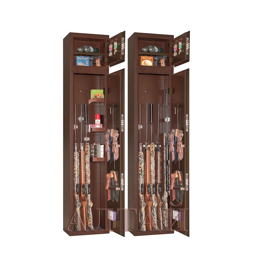ОписаниеДвухсекционный оружейный сейф. Полностью удовлетворяет требованиям МВД для физических и юридических лиц. Сейф имеет гигиенически безопасное износо- и коррозионно-устойчивое полимерно-порошковое покрытие на основе материалов производства Италии. Замок Сейф оборудован тремя сертифицированными трёхригельными замками второго класса. Дверь основной (нижней) секции сейфа оборудована двумя замками, дверь верхней секции оборудована одним замком. Защита Петли – внутренние. Двери сейфа имеют коробчатую конструкцию для дополнительного усиления. Внутреннее устройство Внутри верхней секции - съёмная полка. На внутренней поверхности двери верхней секции имеются крючки для хранения связок ключей и т.п. Внутри основной (нижней) секции сейфа имеются 3 съемные полки. Если устанавливать не все полки, то на их месте можно хранить дополнительные три ствола. На внутренней поверхности двери основной (нижней) секции сейфа имеются крючки для хранения шомполов и ключей, 2 рамки для хранения ножей и т.п., а так же удобный лоток. Дно сейфа отделано ковролином. Этот шкаф уже укомплектован 2 удобными мягкими ложементами, рассчитанными на хранение, соответственно, 3 и 2 стволов. Ложементы изготовлены из экологически чистого эластичного и влагостойкого полимерного материала, устойчивого к деформации и разрыву. Ложементы легко устанавливаются в любое нужное место сейфа при помощи специальной клеевой основы на обратной стороне, и надежно фиксируют оружие внутри сейфа. Установка Предусмотрена возможность крепления сейфа к стене. По желанию заказчика возможна так же поставка в исполнении, предусматривающем крепление и к полу. ДоставкаСтоимость доставки по Москве в пределах МКАД: при заказе от 20 000 рублей бесплатно, менее 20000 руб - 1200 рублей Доставка возможна на 06.12.2025 или на 07.12.2025 Доставка по РФ и СНГ: по тарифам транспортных компаний Стоимость разгрузки: 350 руб СамовывозСамовывоз: со склада, после после подтверждения заказа ОплатаОплата: наличными при получении товара, безналичный расчет ( 100% предоплата) Сейф Gunsafe Алтай |