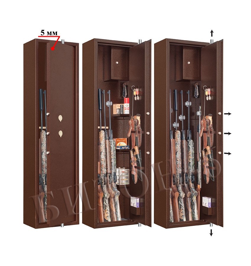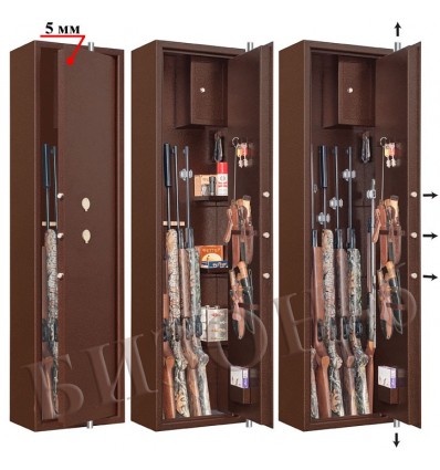 ОписаниеПолностью удовлетворяет требованиям МВД к хранению оружия физическими и юридическими лицами. Сейф имеет коррозионно- и износо-стойкое, гигиенически-безопасное полимерно-порошковое покрытие на основе материалов производства Италии. Имеются покрытия различных цветов и структур: металлики, антики и д.р. Различные варианты цветового дизайна, например: корпус и двери имеют одинаковое покрытие, либо корпус и двери имеют покрытия разного цвета – выбирайте. Замок Сейф оборудован двумя сертифицированными замками: замком четвёртого класса и замком второго класса. Сейф имеет мощную вертикально-горизонтальную ригельную систему с запиранием по всем сторонам. Защита Дверь сейфа имеет коробчатую конструкцию для дополнительного усиления. Передний лист двери сейфа изготовлен из стали толщиной 5мм. Корпус сейфа изготовлен из стали толщиной 3 мм. Петли - внутренние из стали 6мм. Каждый замок сейфа оборудован опломбирующим устройством. Внутреннее устройство Запираемое (патронное) отделение и 3 съёмные полки. На внутренней стороне корпуса имеется крючок для оружейно-охотничьей амуниции. На внутренней стороне двери сейфа имеются: лоток, 2 рамки для хранения ножей, крючки для хранения шомполов, ключей и т.п. Дно сейфа отделано ковролином. Установка Предусмотрена возможность крепления сейфа к стене. По желанию заказчика возможна так же поставка в исполнении, предусматривающем крепление и к полу. Модификации Дополнительно металлический шкаф может комплектоваться ложементами, каждый из которых легко устанавливается в любое нужное место. Имеются деревянные ложементы на любое количество стволов, роликовые ложементы-зажимы производства Германии и другие. Уточните это при заказе с Вашим менеджером. ДоставкаСтоимость доставки по Москве в пределах МКАД: при заказе от 20 000 рублей бесплатно, менее 20000 руб - 1200 рублей Доставка возможна на 15.12.2025 или на 16.12.2025 Доставка по РФ и СНГ: по тарифам транспортных компаний Стоимость разгрузки: 900 руб СамовывозСамовывоз: со склада, после после подтверждения заказа ОплатаОплата: наличными при получении товара, безналичный расчет ( 100% предоплата) Сейф Gunsafe Бизон-6 |