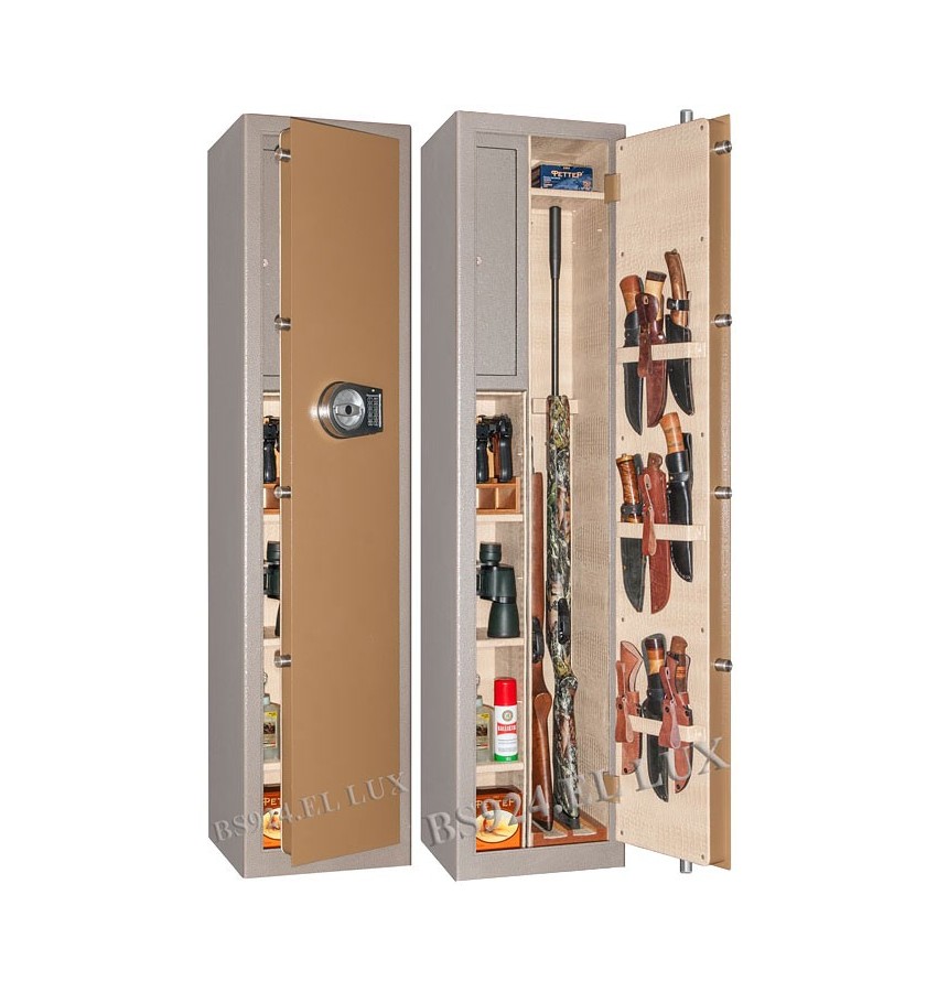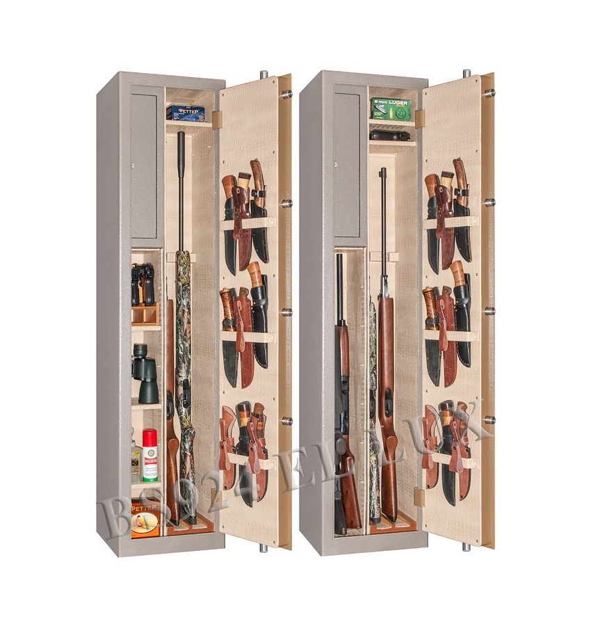 ОписаниеПолностью удовлетворяет требованиям МВД для физических и юридических лиц. Сейф имеет гигиенически безопасное износо- и коррозионно-устойчивое полимерно-порошковое покрытие на основе материалов производства Италии и Франции. Имеются покрытия различных цветов и структур: металлики, антики и д.р. Различные варианты цветового дизайна, например: корпус и двери имеют одинаковое покрытие, либо корпус и двери имеют покрытия разного цвета. Модель имеет полную внутреннюю мягкую отделку искусственной кожей. Полная внутренняя мягкая отделка защищает Ваше оружие от контакта с металлом, царапин, повреждений и т.п. Искусственная кожа имитирует кожу крокодилов, змей различных цветов! Замок Сейф оборудован высокосекретным сертифицированным электронным замком La Gard (США). Этот замок Вы можете использовать с одним пользовательским кодом либо с двумя кодами: код руководителя (мастер-код) и рабочий код. Оба кода программирует сам владелец сейфа. Подробная и понятная инструкция на русском языке прилагается. Сейф имеет мощные горизонтальную и вертикальную ригельные системы, с запиранием по всем сторонам. Защита Изготовлен из стали толщиной 3 и 4 мм. Петли - внутренние из стали 6мм. Двери сейфа имеют коробчатую конструкцию для дополнительного усиления. Внутреннее устройство Сейф имеет вертикально расположенное внутреннее запираемое (патронное) отделение с полкой внутри. Ниже запираемого отделения находятся посадочные места для полок. Посадочные места для полок имеются также и в верхней части правого отделения сейфа. Сейф укомплектован 4-я полками. Все полки - съёмные с регулируемой высотой установки. Если устанавливать не все полки в левом отделении сейфа, то на их месте можно хранить третий и четвёртый ствол. Сейф имеет нижние и верхние деревянные ложементы с отделкой искусственной кожей. По желанию заказчика возможна замена верхних деревянных ложементов на роликовые ложементы-зажимы производства Германии либо дополнительная комплектация такими ложементами (например для боковой фиксации оружия с оптикой). Внимание, роликовые ложементы приобретаются отдельно со скидкой. Ружья в сейфе можно хранить как по одну сторону от перегородки, так и по обе стороны от перегородки. Сейф имеет декоративную полную внутреннюю мягкую отделку искусственной кожей Сейф дополнительно может быть укомплектован пистолетными ложементами (деревянными либо пластиковыми). Внутренняя поверхность двери сейфа позволяет хранить на ней ножи, шомпола, связки ключей и т.п. Установка Предусмотрена возможность крепления сейфа к стене. По желанию заказчика возможна так же поставка в исполнении, предусматривающем крепление и к полу. Модификации Возможно изготовление модели с фасадом из стального листа толщиной 6мм, стоимость данной модификации выше на 20%. По желанию заказчика возможна установка комбинационных замков на внутреннее запираемое отделение. По желанию заказчика сейф дополнительно может быть оборудован опломбирующими устройствами. Существуют также модификации данного сейфа с дополнительным ключевым замком на наружной двери. По желанию заказчика возможно изменение размеров, толщины металла, внутреннего устройства и т.п. Имеются в продаже оригинальные антресоли к сейфам этой серии. При приобретении сейфа в комплекте с антресолью требуйте об