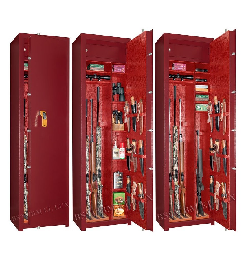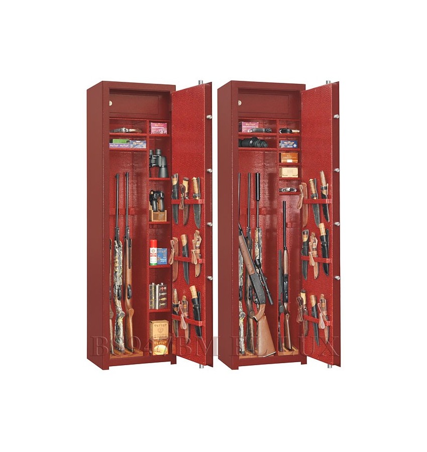 ОписаниеПолностью удовлетворяет требованиям МВД для физических и юридических лиц. Сейф имеет гигиенически безопасное износо- и коррозионно-устойчивое полимерно-порошковое покрытие на основе материалов производства Италии и Франции. Сейфы в специальном исполнении «BM» имеют декоративное бордовое полуглянцевое покрытие, которое хорошо сочетается практически с любой мебелью. Для сейфов в исполнении «BM» в базовом варианте используются кодовые панели «Gold-design» (как на фото). Замок Сейф оборудован высокосекретным сертифицированным электронным замком La Gard (США). Этот замок Вы можете использовать с одним пользовательским кодом либо с двумя кодами: код руководителя (мастер-код) и рабочий код. Оба кода программирует сам владелец сейфа. Подробная и понятная инструкция на русском языке прилагается. Сейф имеет мощные горизонтальную и вертикальную ригельные системы, с запиранием по всем сторонам. Защита Изготовлен из стали толщиной 3 и 4 мм. Петли – внутренние из стали 6мм. Дверь сейфа имеет коробчатую конструкцию для дополнительного усиления. Внутреннее устройство Сейф имеет внутреннее запираемое (патронное) отделение и вертикальную перегородку, которая делит внутреннее пространства сейфа на две области. Внутри широкой области две съёмные полки с регулируемой высотой установки, а также деревянные нижние и верхние фигурные ложементы на 4 ствола. Также в широкой области имеется роликовый ложемент-зажим (производства Германии) с регулируемой высотой установки. Этот ложемент может быть использован для хранения в широкой области пятого ствола либо для дополнительной боковой фиксации оружия с оптикой. Внутри узкой области пять съёмных полок с регулируемой высотой установки, а также деревянные нижние и верхние ложементы на 2 ствола. Все деревянные ложементы сейфа имеют отделку искусственной кожей или бархатом различных цветов. По желанию заказчика возможна замена верхних деревянных ложементов на роликовые ложементы-зажимы производства Германии либо дополнительная комплектация сейфа такими ложементами. Ружья в сейфе можно хранить как в широкой, так и в узкой области. Сейф дополнительно может быть укомплектован пистолетными ложементами (деревянными либо пластиковыми). Внутренняя поверхность двери сейфа позволяет хранить на ней ножи и т.п. Сейф имеет декоративную полную внутреннюю мягкую отделку искусственной кожей «бордовый питон». Полная внутренняя мягкая отделка защищает Ваше оружие от контакта с металлом, царапин, повреждений и т.п. Установка Предусмотрена возможность крепления сейфа к стене. По желанию заказчика возможна поставка в исполнении, предусматривающем также крепление и к полу. Модификации Высота хранимых стволов 1440 либо 1655мм., в зависимости от модификации - уточняйте это при заказе. По желанию заказчика возможна поставка данного сейфа с внутренней отделкой других цветов и рисунков по нашему каталогу. New! Поступила искусственная кожа, имитирующая кожу крокодилов, змей и т.п. Тоже различных цветов! По желанию заказчика возможна поставка сейфа с покрытиями других цветов и структур (металики, антики и др.), а также поставка с кодовой панелью «Chrom» вместо «Gold-design». По желанию заказчика возможна поставка сейфов с электронными замками Mauer (Германия) вместо La Gard (США). Для любого из этих замков Вы так же можете выбрать 