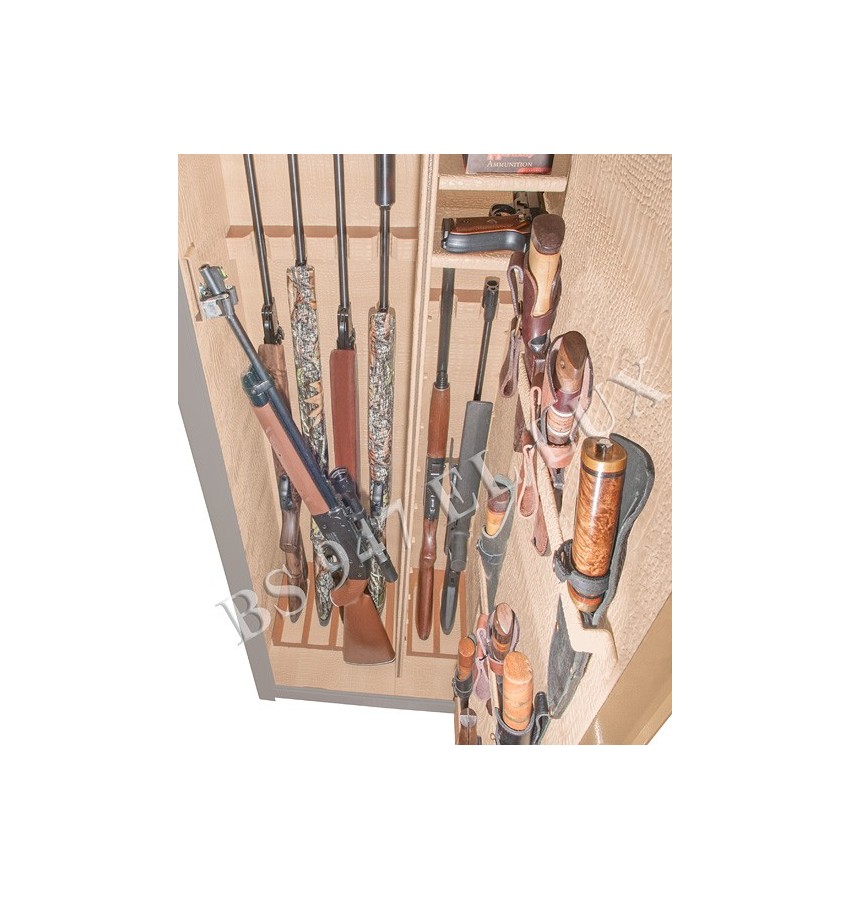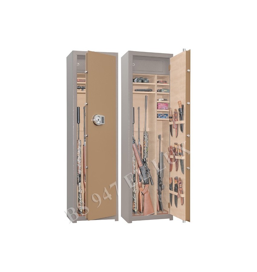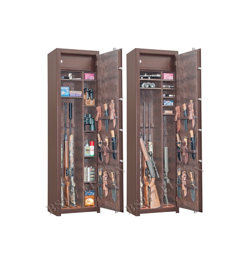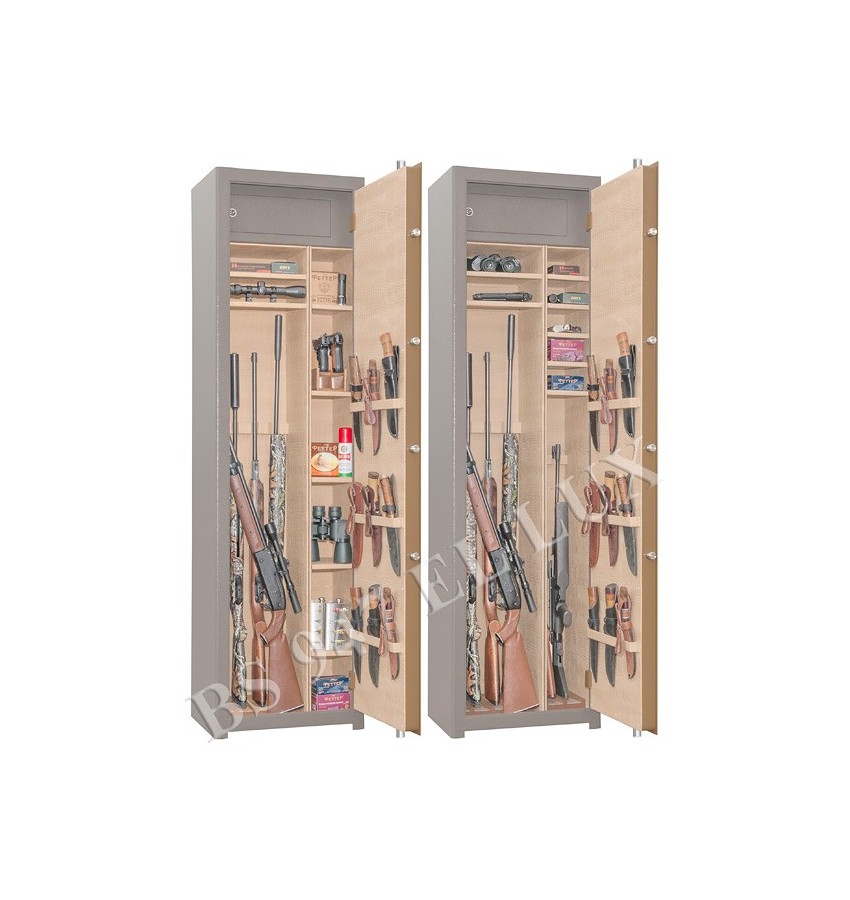 ОписаниеПолностью удовлетворяет требованиям МВД для физических и юридических лиц. Сейф имеет гигиенически безопасное износо- и коррозионно-устойчивое полимерно-порошковое покрытие на основе материалов производства Италии и Франции. Имеются покрытия различных цветов и структур: металлики, антики и д.р. Различные варианты цветового дизайна, например: корпус и двери имеют одинаковое покрытие, либо корпус и двери имеют покрытия разного цвета – выбирайте. Модель имеет полную внутреннюю мягкую отделку искусственной кожей. Полная внутренняя мягкая отделка защищает Ваше оружие от контакта с металлом, царапин, повреждений и т.п. Искусственная кожа имитирует кожу крокодилов, змей различных цветов! Замок Сейф оборудован высокосекретным сертифицированным электронным замком La Gard (США). Этот замок Вы можете использовать с одним пользовательским кодом либо с двумя кодами: код руководителя (мастер-код) и рабочий код. Оба кода программирует сам владелец сейфа. Подробная и понятная инструкция на русском языке прилагается. Сейф имеет мощные горизонтальную и вертикальную ригельные системы, с запиранием по всем сторонам. Защита Изготовлен из стали толщиной 3 и 4 мм. Петли – внутренние из стали 6мм. Дверь сейфа имеет коробчатую конструкцию для дополнительного усиления. Внутреннее устройство Сейф имеет внутреннее запираемое (патронное) отделение и вертикальную перегородку, которая делит внутреннее пространства сейфа на две области. Внутри широкой области две съёмные полки с регулируемой высотой установки, а также деревянные нижние и верхние фигурные ложементы на 4 ствола. Также в широкой области имеется роликовый ложемент-зажим (производства Германии) с регулируемой высотой установки. Этот ложемент может быть использован для хранения в широкой области пятого ствола либо для дополнительной боковой фиксации оружия с оптикой. Внутри узкой области пять съёмных полок с регулируемой высотой установки, а также деревянные нижние и верхние ложементы на 2 ствола. Все деревянные ложементы сейфа имеют отделку искусственной кожей или бархатом различных цветов. По желанию заказчика возможна замена верхних деревянных ложементов на роликовые ложементы-зажимы производства Германии либо дополнительная комплектация сейфа такими ложементами. Ружья в сейфе можно хранить как в широкой, так и в узкой области. Сейф дополнительно может быть укомплектован пистолетными ложементами (деревянными либо пластиковыми). Внутренняя поверхность двери сейфа позволяет хранить на ней ножи, шомпола, связки ключей и т.п. Установка Предусмотрена возможность крепления сейфа к стене. По желанию заказчика возможна поставка в исполнении, предусматривающем также крепление и к полу. Модификации Высота хранимых стволов 1440 либо 1655мм., в зависимости от модификации - уточняйте это при заказе. Возможно изготовление модели с фасадом из стального листа толщиной 6мм, стоимость данной модификации выше на 20%. По желанию заказчика возможна установка комбинационных замков на внутреннее запираемое отделение. По желанию заказчика сейф дополнительно может быть оборудован опломбирующими устройствами. Существуют также модификации данного сейфа с дополнительным ключевым замком на наружной двери. По желанию заказчика возможно изменение размеров, толщины металла, внутреннего устро
