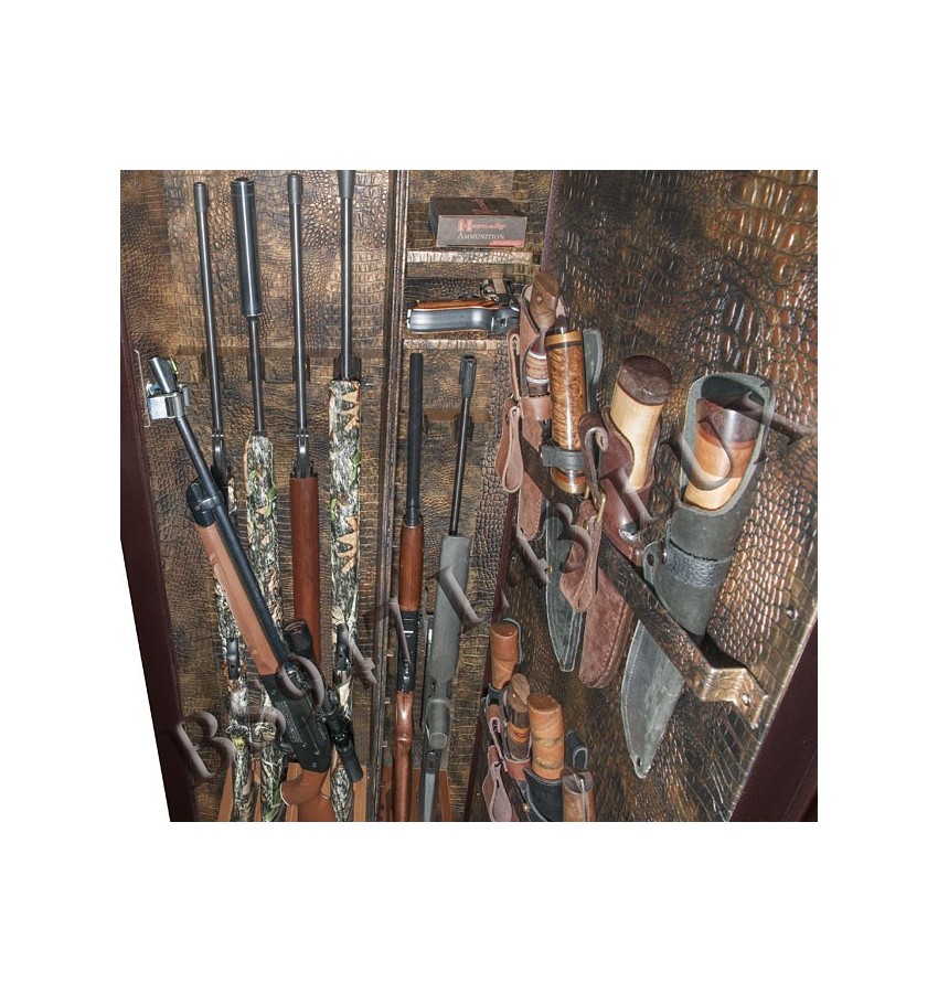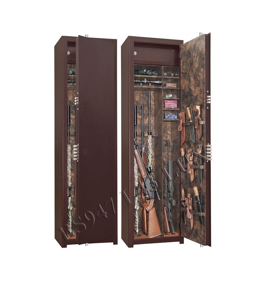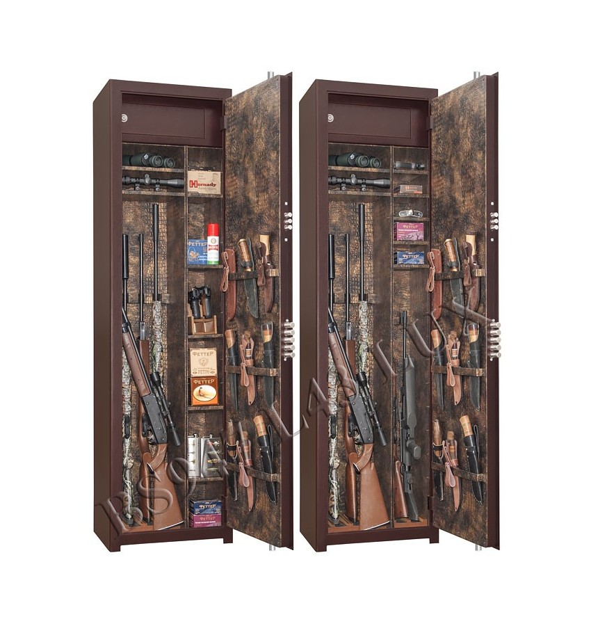 ОписаниеПолностью удовлетворяет требованиям МВД для физических и юридических лиц. Сейф имеет гигиенически безопасное износо- и коррозионно-устойчивое полимерно-порошковое покрытие на основе материалов производства Италии и Франции. Имеются покрытия различных цветов и структур: металлики, антики и д.р. Различные варианты цветового дизайна, например: корпус и двери имеют одинаковое покрытие, либо корпус и двери имеют покрытия разного цвета – выбирайте. Модель имеет полную внутреннюю мягкую отделку искусственной кожей. Полная внутренняя мягкая отделка защищает Ваше оружие от контакта с металлом, царапин, повреждений и т.п. Искусственная кожа имитирует кожу крокодилов, змей различных цветов! Замок Сейф оборудован двумя сертифицированными ключевыми замками: пятиригельный замок 4-го класса!!! повышенной секретности (1,5 миллиона комбинаций) и взломостойкости плюс трёхригельный замок 3 класса. Замки произведены совместно с Cisa (Италия). Также сейф оборудован вертикальной ригельной системой с запиранием по всем сторонам. Защита Изготовлен из стали толщиной 3 и 4 мм. Петли – внутренние из стали 6мм. Дверь сейфа имеет коробчатую конструкцию для дополнительного усиления. Внутреннее устройство Сейф имеет внутреннее запираемое (патронное) отделение и вертикальную перегородку, которая делит внутреннее пространства сейфа на две области. Внутри широкой области две съёмные полки с регулируемой высотой установки, а также деревянные нижние и верхние фигурные ложементы на 4 ствола. Также в широкой области имеется роликовый ложемент-зажим (производства Германии) с регулируемой высотой установки. Этот ложемент может быть использован для хранения в широкой области пятого ствола либо для дополнительной боковой фиксации оружия с оптикой. Внутри узкой области пять съёмных полок с регулируемой высотой установки, а также деревянные нижние и верхние ложементы на 2 ствола. Все деревянные ложементы сейфа имеют отделку искусственной кожей или бархатом различных цветов. По желанию заказчика возможна замена верхних деревянных ложементов на роликовые ложементы-зажимы производства Германии либо дополнительная комплектация сейфа такими ложементами. Ружья в сейфе можно хранить как в широкой, так и в узкой области. Сейф дополнительно может быть укомплектован пистолетными ложементами (деревянными либо пластиковыми). Внутренняя поверхность двери сейфа позволяет хранить на ней ножи, шомпола, связки ключей и т.п. Установка Предусмотрена возможность крепления сейфа к стене. По желанию заказчика возможна поставка в исполнении, предусматривающем также крепление и к полу. Модификации Высота хранимых стволов 1440 либо 1655мм., в зависимости от модификации - уточняйте это при заказе. Возможно изготовление модели с фасадом из стального листа толщиной 6мм, стоимость данной модификации выше на 20%. По желанию заказчика сейф дополнительно может быть оборудован опломбирующими устройствами. По желанию заказчика возможно изменение размеров, толщины металла, внутреннего устройства и т.п. Имеются в продаже оригинальные антресоли к сейфам этой серии. При приобретении сейфа в комплекте с антресолью требуйте обязательную скидку. ДоставкаСтоимость доставки по Москве в пределах МКАД: при заказе от 20 000 рублей бесплатно, менее 20000 руб - 1200 рублей Доставка возможна на 06