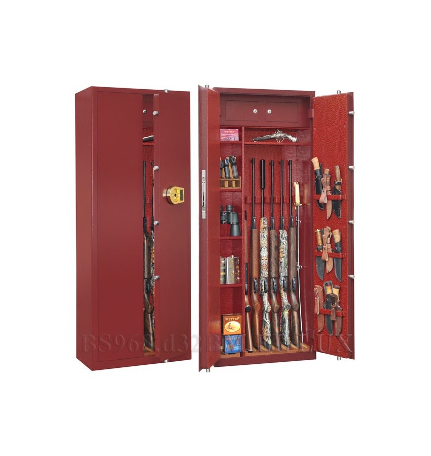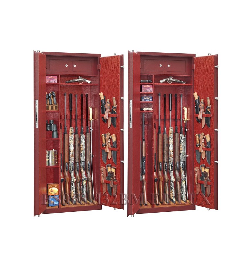 ОписаниеПолностью удовлетворяет требованиям МВД для физических и юридических лиц. Сейф имеет гигиенически безопасное износо- и коррозионно-устойчивое полимерно-порошковое покрытие на основе материалов производства Италии и Франции. Сейфы в специальном исполнении «BM» имеют декоративное бордовое полуглянцевое покрытие, которое хорошо сочетается практически с любой мебелью. Для сейфов в исполнении «BM» в базовом варианте используются кодовые панели «Gold-design» (как на фото). Замок Сейф оборудован высокосекретным сертифицированным электронным замком La Gard (США). Этот замок Вы можете использовать с одним пользовательским кодом либо с двумя кодами: код руководителя (мастер-код) и рабочий код. Оба кода программирует сам владелец сейфа. Подробная и понятная инструкция на русском языке прилагается. Сейф имеет мощные ригельные системы: горизонтальную и две вертикальные (на каждой двери) - с запиранием по всем сторонам. Внутреннее устройство Сейф имеет два внутренних запираемых (патронных) отделения и вертикальную перегородку, которая делит внутреннее пространства сейфа на две области. Внутри широкой области съёмная полка с регулируемой высотой установки, а также нижние и верхние фигурные ложементы на 6 стволов. Внутри узкой области четыре съёмные полки с регулируемой высотой установки, а также нижние и верхние ложементы на 2 ствола. Если устанавливать не все полки в узкой области, то на их месте можно хранить дополнительные стволы. Все ложементы сейфа - деревянные с отделкой искусственной кожей. По желанию заказчика возможна замена верхних деревянных ложементов на роликовые ложементы-зажимы производства Германии либо дополнительная комплектация такими ложементами (например для боковой фиксации оружия с оптикой). Внимание, роликовые ложементы приобретаются отдельно со скидкой. Ружья в сейфе можно хранить как в широкой, так и в узкой области. Сейф дополнительно может быть укомплектован пистолетными ложементами (деревянными либо пластиковыми). Внутренняя поверхность двери сейфа позволяет хранить на ней ножи и т.п. Сейф имеет декоративную полную внутреннюю мягкую отделку искусственной кожей «бордовый питон». Полная внутренняя мягкая отделка защищает Ваше оружие от контакта с металлом, царапин, повреждений и т.п. Установка Предусмотрена возможность крепления сейфа к стене. По желанию заказчика возможна поставка в исполнении, предусматривающем также крепление и к полу. Модификации Высота хранимых стволов 1330 либо 1525мм., в зависимости от модификации - уточняйте это при заказе. По желанию заказчика возможна поставка данного сейфа с внутренней отделкой других цветов и рисунков по нашему каталогу. New! Поступила искусственная кожа, имитирующая кожу крокодилов, змей и т.п. Тоже различных цветов! По желанию заказчика возможна поставка сейфа с покрытиями других цветов и структур (металики, антики и др.), а также поставка с кодовой панелью «Chrom» вместо «Gold-design». По желанию заказчика возможна поставка сейфов с электронными замками Mauer (Германия) вместо La Gard (США). Для любого из этих замков Вы так же можете выбрать дизайн кодовой панели электронного замка: Chrom либо Gold. Кодовая панель Mauer Gold имеет покрытие золотом 24 карата (подтверждено европейским сертификатом). По желанию заказчика сейф дополнительно может быть оборудован опломбирующими у