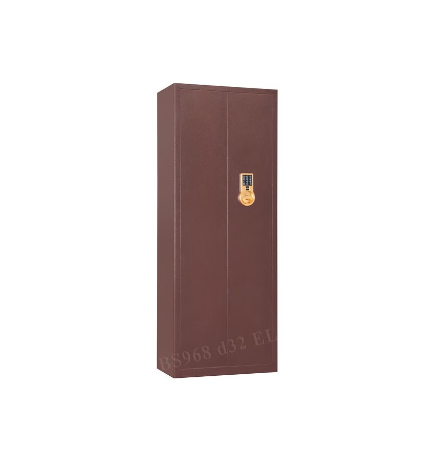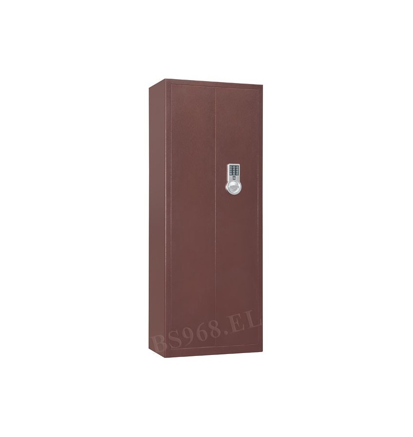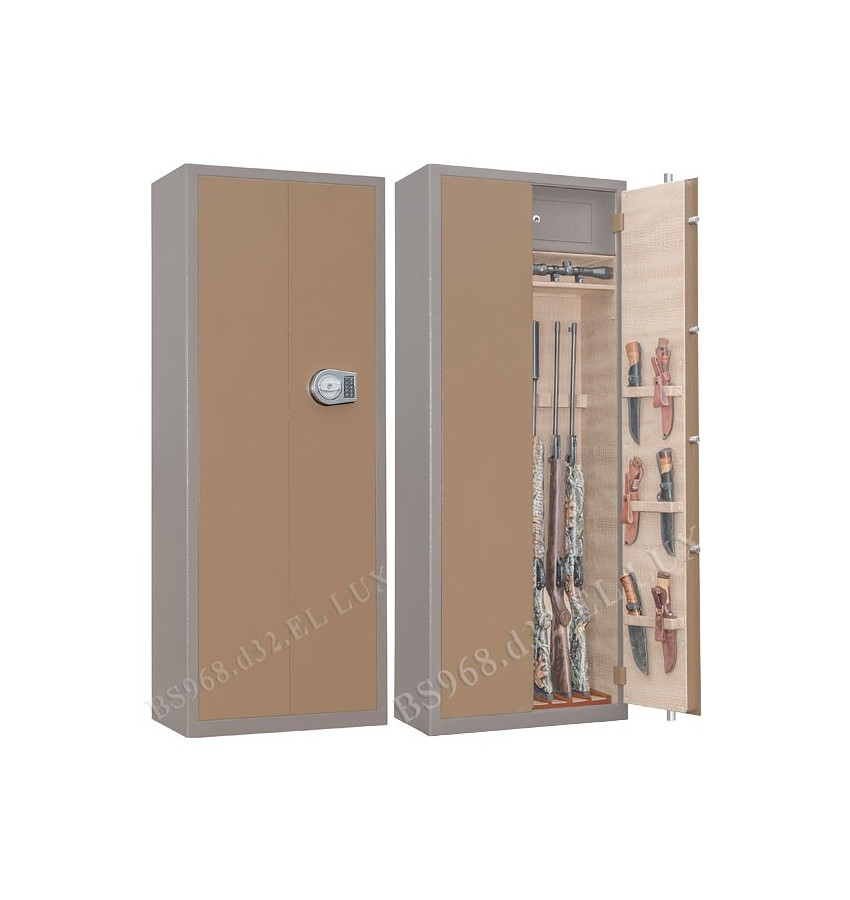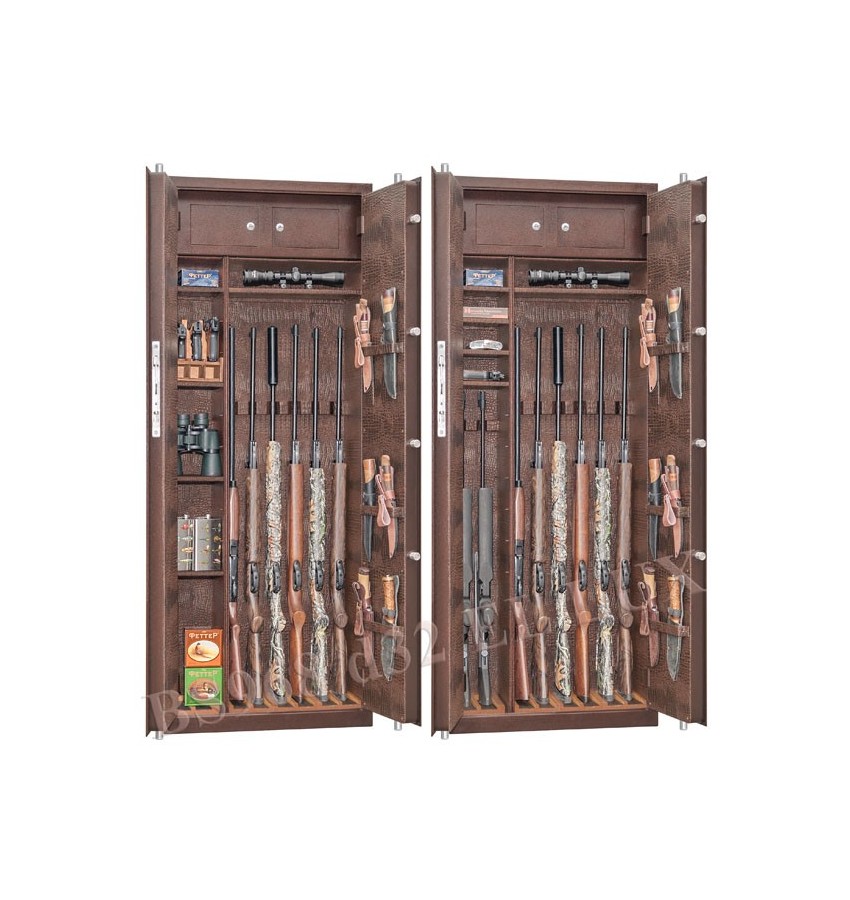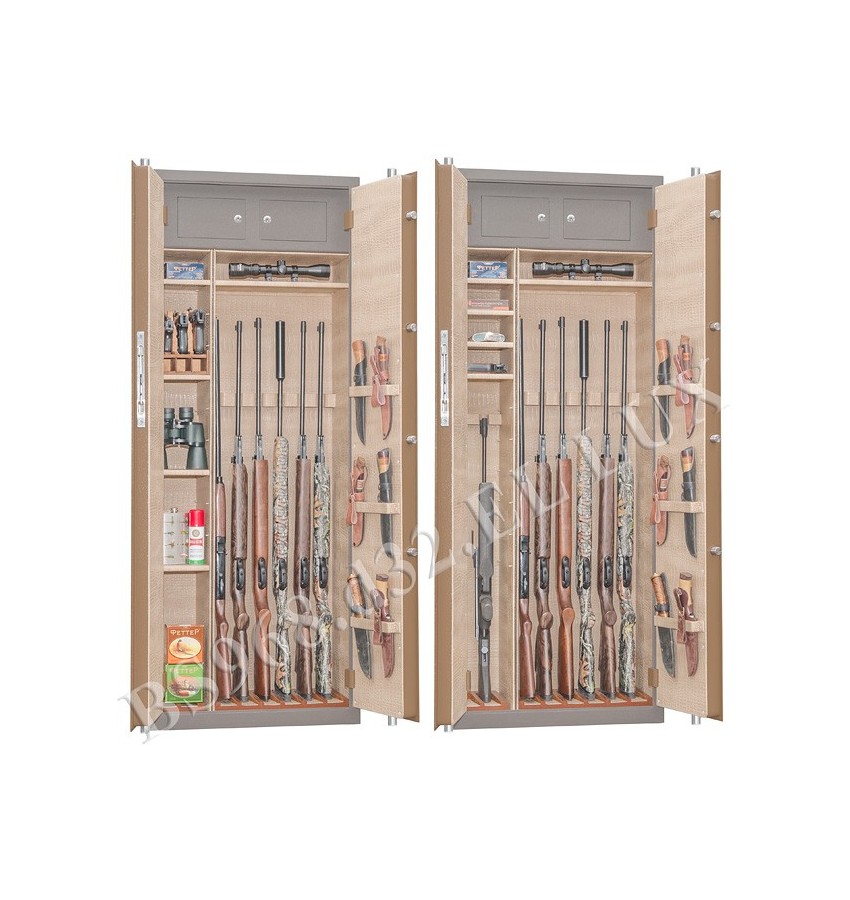 ОписаниеПолностью удовлетворяет требованиям МВД для физических и юридических лиц. Сейф имеет гигиенически безопасное износо- и коррозионно-устойчивое полимерно-порошковое покрытие на основе материалов производства Италии и Франции. Имеются покрытия различных цветов и структур: металлики, антики и д.р. Различные варианты цветового дизайна, например: корпус и двери имеют одинаковое покрытие, либо корпус и двери имеют покрытия разного цвета – выбирайте. Модель имеет полную внутреннюю мягкую отделку искусственной кожей. Полная внутренняя мягкая отделка защищает Ваше оружие от контакта с металлом, царапин, повреждений и т.п. Искусственная кожа имитирует кожу крокодилов, змей различных цветов! Замок Сейф оборудован высокосекретным сертифицированным электронным замком La Gard (США). Этот замок Вы можете использовать с одним пользовательским кодом либо с двумя кодами: код руководителя (мастер-код) и рабочий код. Оба кода программирует сам владелец сейфа. Подробная и понятная инструкция на русском языке прилагается. Сейф имеет мощные ригельные системы: горизонтальную и две вертикальные (на каждой двери) - с запиранием по всем сторонам. Защита Изготовлен из стали толщиной 3 и 4 мм. Петли – внутренние из стали 6мм. Дверь сейфа имеет коробчатую конструкцию для дополнительного усиления. Внутреннее устройство Сейф имеет два внутренних запираемых (патронных) отделения и вертикальную перегородку, которая делит внутреннее пространства сейфа на две области. Внутри широкой области съёмная полка с регулируемой высотой установки, а также нижние и верхние фигурные ложементы на 6 стволов. Внутри узкой области четыре съёмные полки с регулируемой высотой установки, а также нижние и верхние ложементы на 2 ствола. Все ложементы - деревянные с отделкой искусственной кожей или бархатом различных цветов. По желанию заказчика возможна замена верхних деревянных ложементов на роликовые ложементы-зажимы производства Германии либо дополнительная комплектация такими ложементами (например для боковой фиксации оружия с оптикой). Внимание, роликовые ложементы приобретаются отдельно со скидкой. Ружья в сейфе можно хранить как в широкой, так и в узкой области. Сейф дополнительно может быть укомплектован пистолетными ложементами (деревянными либо пластиковыми). Внутренняя поверхность двери сейфа позволяет хранить на ней ножи, шомпола, связки ключей и т.п. Установка Предусмотрена возможность крепления сейфа к стене. По желанию заказчика возможна поставка в исполнении, предусматривающем также крепление и к полу. Модификации Высота хранимых стволов 1330 либо 1525мм., в зависимости от модификации - уточняйте это при заказе. Возможно изготовление модели с фасадом из стального листа толщиной 6мм, стоимость данной модификации выше на 20%. По желанию заказчика возможна установка комбинационных замков на внутренние запираемые отделения. По желанию заказчика сейф дополнительно может быть оборудован опломбирующими устройствами. Существуют также модификации данного сейфа с дополнительным ключевым замком на наружной двери. По желанию заказчика возможно изменение размеров, толщины металла, внутреннего устройства и т.п. Имеются в продаже оригинальные антресоли к сейфам этой серии. При приобретении сейфа в комплекте с антресолью требуйте обязательную скидку. Дос