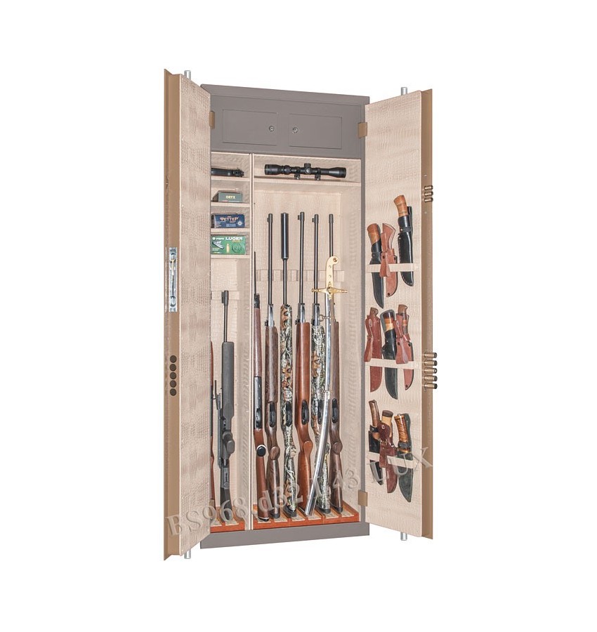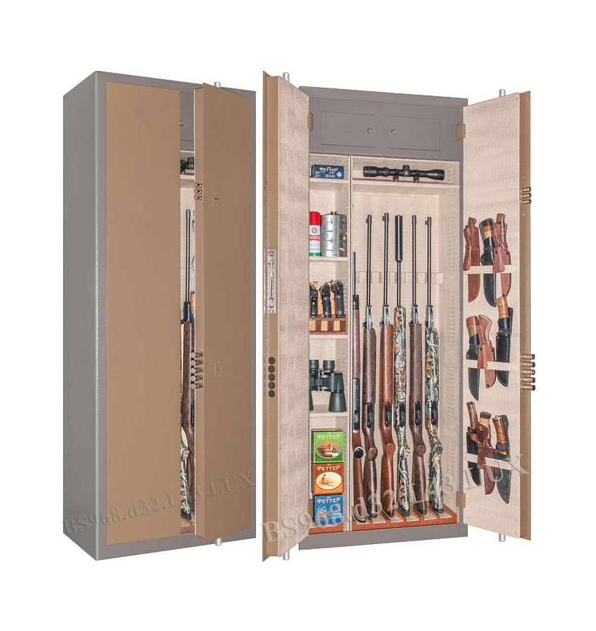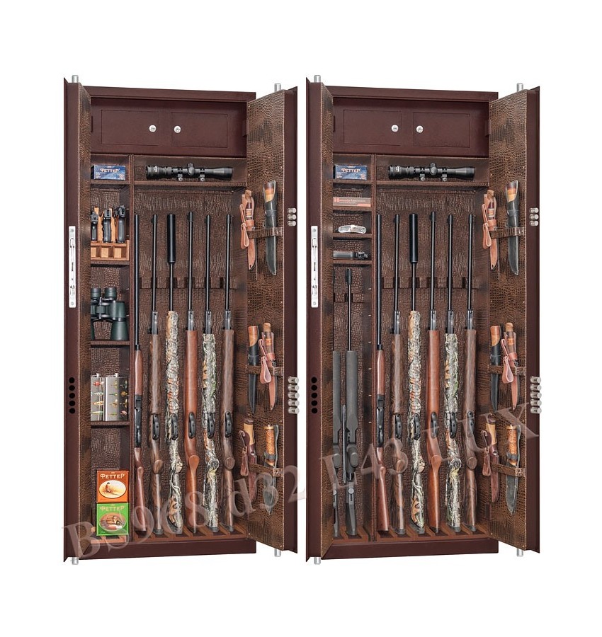 ОписаниеПолностью удовлетворяет требованиям МВД для физических и юридических лиц. Сейф имеет гигиенически безопасное износо- и коррозионно-устойчивое полимерно-порошковое покрытие на основе материалов производства Италии и Франции. Имеются покрытия различных цветов и структур: металлики, антики и д.р. Различные варианты цветового дизайна, например: корпус и двери имеют одинаковое покрытие, либо корпус и двери имеют покрытия разного цвета – выбирайте. Модель имеет полную внутреннюю мягкую отделку искусственной кожей. Полная внутренняя мягкая отделка защищает Ваше оружие от контакта с металлом, царапин, повреждений и т.п. Искусственная кожа имитирует кожу крокодилов, змей различных цветов! Замок Сейф оборудован двумя сертифицированными ключевыми замками: пятиригельный замок 4-го класса!!! повышенной секретности (1,5 миллиона комбинаций) и взломостойкости плюс трёхригельный замок 3 класса. Замки произведены совместно с Cisa (Италия). Также сейф оборудован двумя вертикальными (на каждой двери) ригельными системами с запиранием по всем сторонам. Защита Изготовлен из стали толщиной 3 и 4 мм. Петли – внутренние из стали 6мм. Дверь сейфа имеет коробчатую конструкцию для дополнительного усиления. Внутреннее устройство Сейф имеет два внутренних запираемых (патронных) отделения и вертикальную перегородку, которая делит внутреннее пространства сейфа на две области. Внутри широкой области съёмная полка с регулируемой высотой установки, а также нижние и верхние фигурные ложементы на 6 стволов. Внутри узкой области четыре съёмные полки с регулируемой высотой установки, а также нижние и верхние ложементы на 2 ствола. Все ложементы - деревянные с отделкой искусственной кожей или бархатом различных цветов. По желанию заказчика возможна замена верхних деревянных ложементов на роликовые ложементы-зажимы производства Германии либо дополнительная комплектация такими ложементами (например для боковой фиксации оружия с оптикой). Внимание, роликовые ложементы приобретаются отдельно со скидкой. Ружья в сейфе можно хранить как в широкой, так и в узкой области. Сейф дополнительно может быть укомплектован пистолетными ложементами (деревянными либо пластиковыми). Внутренняя поверхность двери сейфа позволяет хранить на ней ножи, шомпола, связки ключей и т.п. Установка Предусмотрена возможность крепления сейфа к стене. По желанию заказчика возможна поставка в исполнении, предусматривающем также крепление и к полу. Модификации Высота хранимых стволов 1330 либо 1525мм., в зависимости от модификации - уточняйте это при заказе. Возможно изготовление модели с фасадом из стального листа толщиной 6мм, стоимость данной модификации выше на 20%. По желанию заказчика сейф дополнительно может быть оборудован опломбирующими устройствами. По желанию заказчика возможно изменение размеров, толщины металла, внутреннего устройства и т.п. Имеются в продаже оригинальные антресоли к сейфам этой серии. При приобретении сейфа в комплекте с антресолью требуйте обязательную скидку. ДоставкаСтоимость доставки по Москве в пределах МКАД: при заказе от 20 000 рублей бесплатно, менее 20000 руб - 1200 рублей Доставка возможна на 06.12.2025 или на 07.12.2025 Доставка по РФ и СНГ: по тарифам транспортных компаний Стоимость разгрузки: 1890 руб СамовывозСамовывоз: со склада, после после подтверж