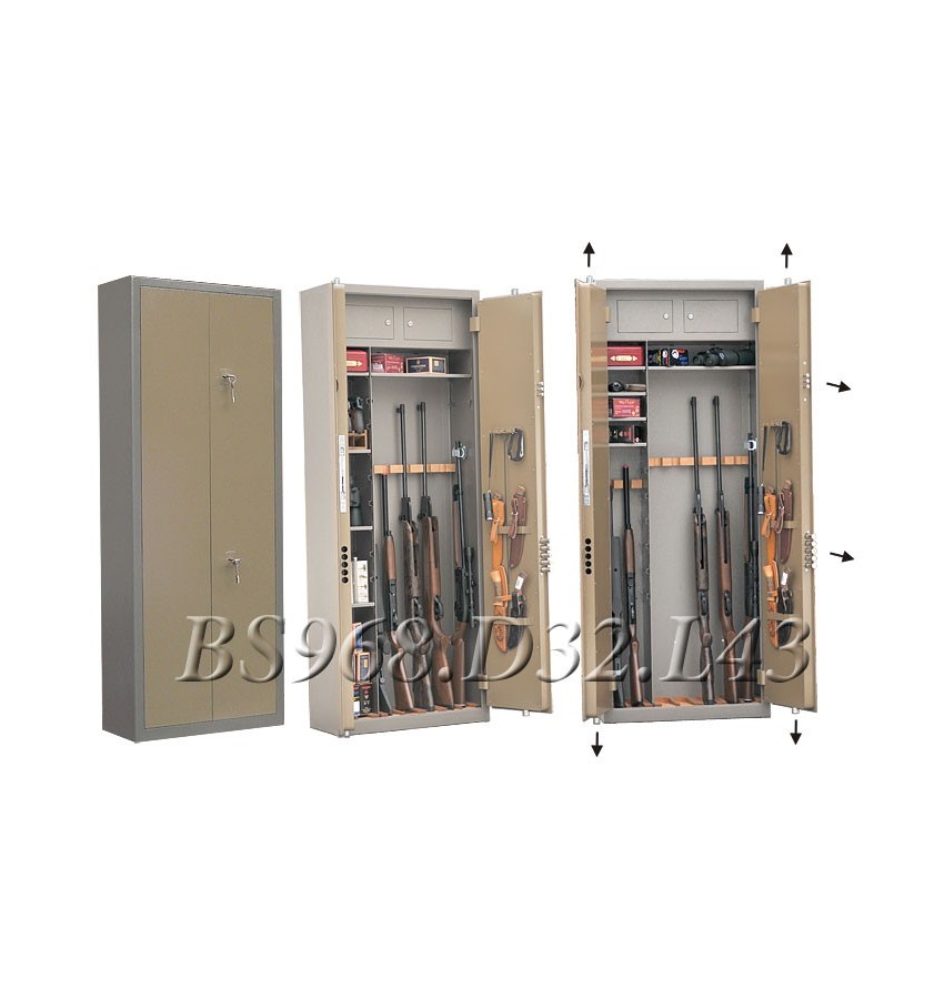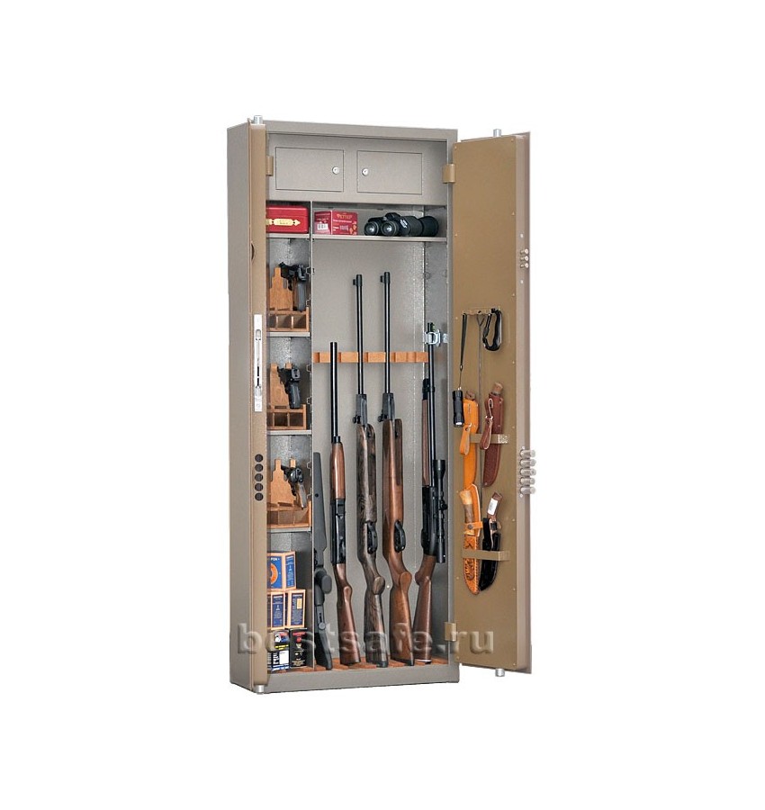 ОписаниеПолностью удовлетворяет требованиям МВД для физических и юридических лиц. Сейф имеет гигиенически безопасное износо- и коррозионно-устойчивое полимерно-порошковое покрытие на основе материалов производства Италии и Франции. Имеются покрытия различных цветов и структур: металлики, антики и д.р. Различные варианты цветового дизайна, например: корпус и двери имеют одинаковое покрытие, либо корпус и двери имеют покрытия разного цвета – выбирайте. Замок Сейф оборудован двумя сертифицированными ключевыми замками: пятиригельный замок 4-го класса!!! повышенной секретности (1,5 миллиона комбинаций) и взломостойкости плюс трёхригельный замок 3 класса. Замки произведены совместно с Cisa (Италия). Также сейф оборудован двумя вертикальными (на каждой двери) ригельными системами с запиранием по всем сторонам. Защита Изготовлен из стали толщиной 3 и 4 мм. Петли – внутренние из стали 6мм. Дверь сейфа имеет коробчатую конструкцию для дополнительного усиления. Внутреннее устройство Сейф имеет два внутренних запираемых (патронных) отделения и вертикальную перегородку, которая делит внутреннее пространства сейфа на две области. Внутри широкой области съёмная полка с регулируемой высотой установки, а также нижние и верхние фигурные ложементы на 6 стволов. Внутри узкой области четыре съёмные полки с регулируемой высотой установки, а также нижние и верхние ложементы на 2 ствола. Все ложементы - деревянные с отделкой искусственной кожей или бархатом различных цветов. По желанию заказчика возможна замена верхних деревянных ложементов на роликовые ложементы-зажимы производства Германии либо дополнительная комплектация такими ложементами (например для боковой фиксации оружия с оптикой). Внимание, роликовые ложементы приобретаются отдельно со скидкой. Ружья в сейфе можно хранить как в широкой, так и в узкой области. Сейф дополнительно может быть укомплектован пистолетными ложементами (деревянными либо пластиковыми). Внутренняя поверхность двери сейфа позволяет хранить на ней ножи, шомпола, связки ключей и т.п. Установка Предусмотрена возможность крепления сейфа к стене. По желанию заказчика возможна поставка в исполнении, предусматривающем также крепление и к полу. Модификации Высота хранимых стволов 1330 либо 1525мм., в зависимости от модификации - уточняйте это при заказе. Возможно изготовление модели с фасадом из стального листа толщиной 6мм, стоимость данной модификации выше на 20%. Существует также модель BS968.d32.L43.Lux, имеющая дополнительно полную внутреннюю мягкую отделку бархатом либо искусственной кожей различных цветов по нашему каталогу. Стоимость такой модели выше на 15%. Полная внутренняя мягкая отделка защищает Ваше оружие от контакта с металлом, царапин, повреждений и т.п. New! Поступила искусственная кожа, имитирующая кожу крокодилов, змей и т.п. Тоже различных цветов! По желанию заказчика сейф дополнительно может быть оборудован опломбирующими устройствами. По желанию заказчика возможно изменение размеров, толщины металла, внутреннего устройства и т.п. Имеются в продаже оригинальные антресоли к сейфам этой серии. При приобретении сейфа в комплекте с антресолью требуйте обязательную скидку. ДоставкаСтоимость доставки по Москве в пределах МКАД: при заказе от 20 000 рублей бесплатно, менее 20000 руб - 1200 рублей Доставка возможна 