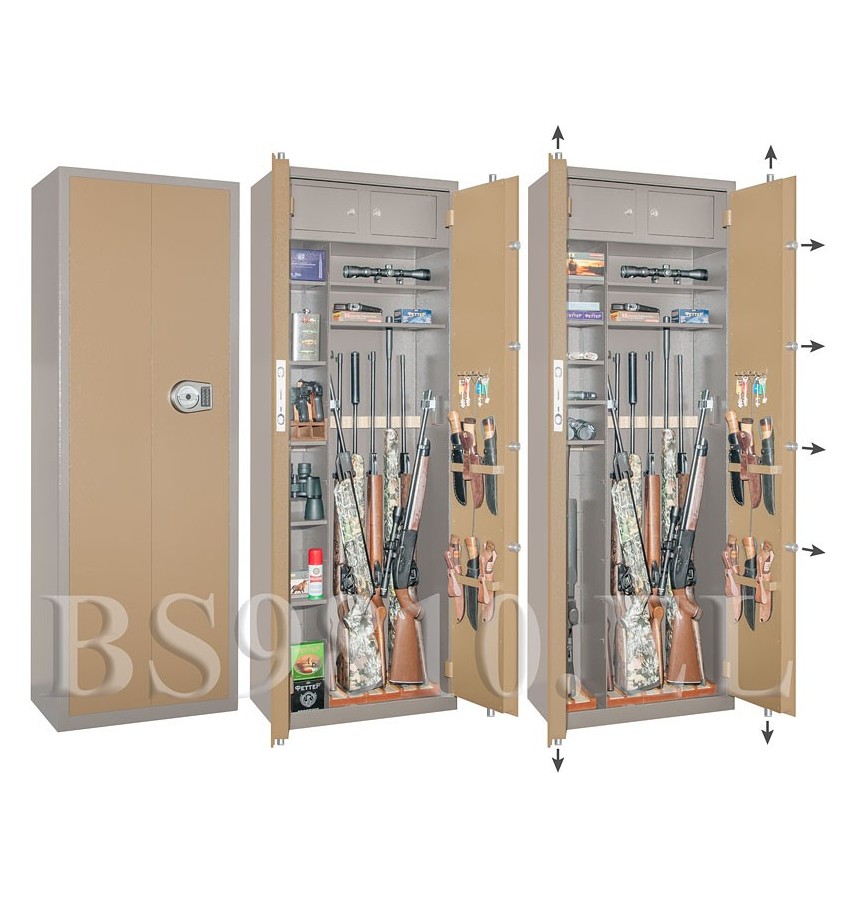 ОписаниеПолностью удовлетворяет требованиям МВД для физических и юридических лиц. Сейф имеет гигиенически безопасное износо- и коррозионно-устойчивое полимерно-порошковое покрытие на основе материалов производства Италии и Франции. Имеются покрытия различных цветов и структур: металлики, антики и д.р. Различные варианты цветового дизайна, например: корпус и двери имеют одинаковое покрытие, либо корпус и двери имеют покрытия разного цвета – выбирайте. Замок Сейф оборудован высокосекретным сертифицированным электронным замком La Gard (США). Этот замок Вы можете использовать с одним пользовательским кодом либо с двумя кодами: код руководителя (мастер-код) и рабочий код. Оба кода программирует сам владелец сейфа. Подробная и понятная инструкция на русском языке прилагается. Сейф имеет мощные ригельные системы: горизонтальную и две вертикальные (на каждой двери) - с запиранием по всем сторонам. Защита Изготовлен из стали толщиной 3 и 4 мм. Петли – внутренние из стали 6мм. Дверь сейфа имеет коробчатую конструкцию для дополнительного усиления. Внутреннее устройство Сейф имеет два внутренних запираемых (патронных) отделения и вертикальную перегородку, которая делит внутреннее пространства сейфа на две области. Внутри широкой области 2 съёмные полки с регулируемой высотой установки, а также нижние и верхние деревянные (c отделкой искусственной кожей) фигурные ложементы на 6 стволов. Также в широкой области имеются 2 роликовых ложемента-зажима (производства Германии) с регулируемой высотой установки. Эти ложементы могут быть использованы для хранения в широкой области седьмого и восьмого стволов либо для дополнительной боковой фиксации оружия с оптикой. Внутри узкой области 5 съёмных полок с регулируемой высотой установки, а также нижние и верхние деревянные (c отделкой искусственной кожей) ложементы на 2 ствола. По желанию заказчика возможна замена верхних деревянных ложементов на роликовые ложементы-зажимы производства Германии либо дополнительная комплектация такими ложементами (например для боковой фиксации оружия с оптикой). Ружья в сейфе можно хранить как в широкой, так и в узкой области. Сейф дополнительно может быть укомплектован пистолетными ложементами (деревянными либо пластиковыми). Внутренняя поверхность одной из дверей сейфа позволяет хранить на ней ножи, шомпола, связки ключей и т.п. Модификации Высота хранимых стволов 1445 либо 1640мм, в зависимости от модификации - уточняйте это при заказе. Возможно изготовление модели с фасадом из стального листа толщиной 6мм, стоимость данной модификации выше на 20%. Существует также модель BS9810EL.Lux, имеющая дополнительно полную внутреннюю мягкую отделку бархатом либо искусственной кожей различных цветов по нашему каталогу. Стоимость такой модели выше на 15%. Полная внутренняя мягкая отделка защищает Ваше оружие от контакта с металлом, царапин, повреждений и т.п. New! Поступила искусственная кожа, имитирующая кожу крокодилов, змей и т.п. Тоже различных цветов! По желанию заказчика возможна установка комбинационных замков на внутренние запираемые отделения. По желанию заказчика сейф дополнительно может быть оборудован опломбирующими устройствами. Существуют также модификации данного сейфа с дополнительным ключевым замком на наружной двери. По желанию заказчика возможно изме