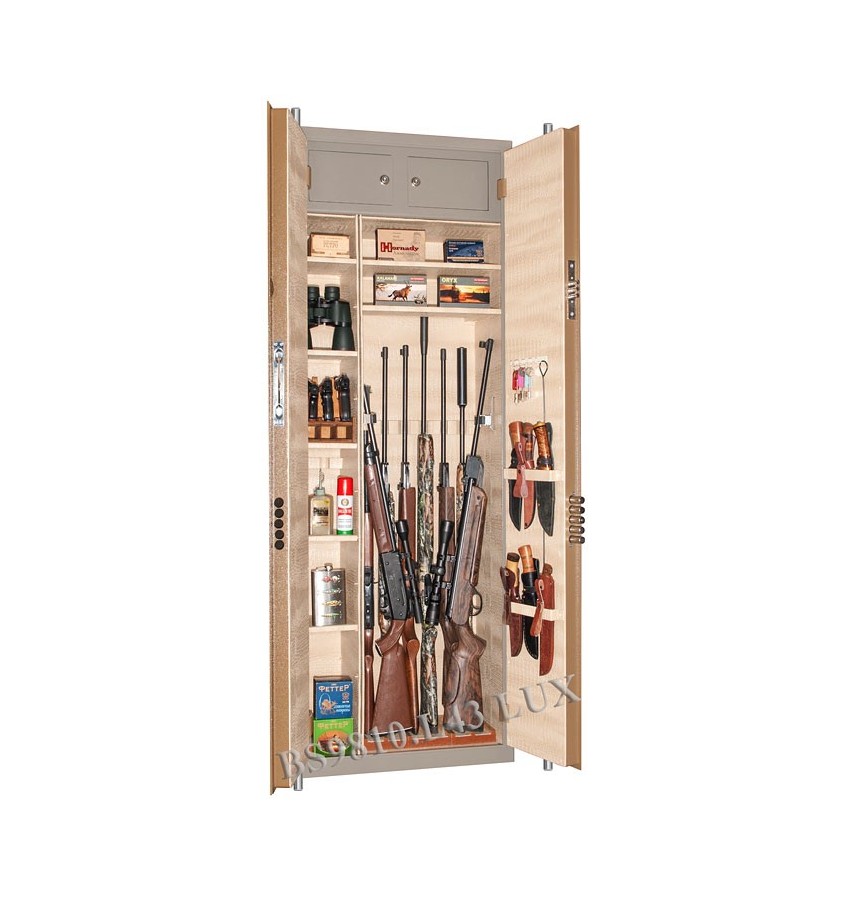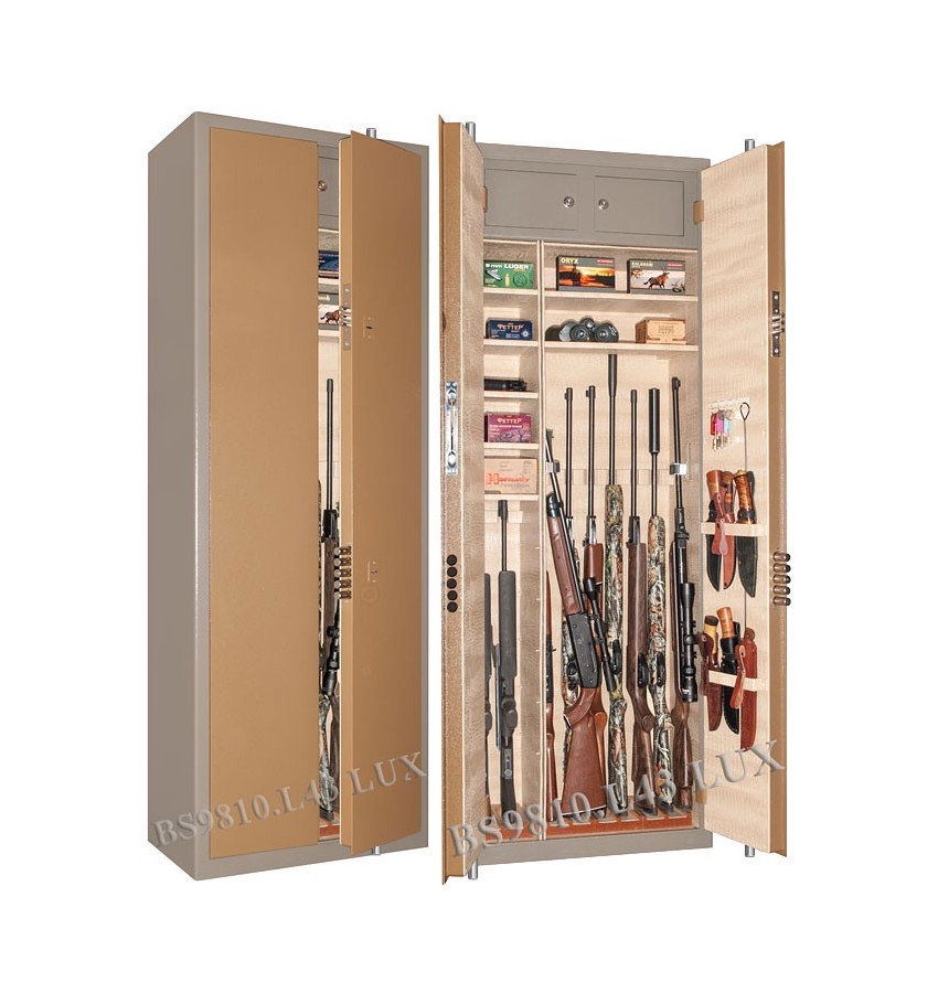 ОписаниеПолностью удовлетворяет требованиям МВД для физических и юридических лиц. Сейф имеет гигиенически безопасное износо- и коррозионно-устойчивое полимерное порошковое покрытие на основе материалов производства Италии и Франции. Имеются покрытия различных цветов и структур: металики, антики и д.р. Различные варианты цветового дизайна, например: корпус и двери имеют одинаковое покрытие, либо корпус и двери имеют покрытия разного цвета. Модель имеет полную внутреннюю мягкую отделку искусственной кожей. Полная внутренняя мягкая отделка защищает Ваше оружие от контакта с металлом, царапин, повреждений и т.п. Искусственная кожа имитирует кожу крокодилов, змей различных цветов! Замок Сейф оборудован двумя сертифицированными ключевыми замками: пятиригельный замок 4-го класса!!! повышенной секретности (1,5 миллиона комбинаций) и взломостойкости плюс трёхригельный замок 3 класса. Замки произведены совместно с Cisa (Италия). Также сейф оборудован двумя вертикальными (на каждой двери) ригельными системами с запиранием по всем сторонам. Защита Изготовлен из стали толщиной 3 и 4 мм. Петли – внутренние из стали 6мм. Дверь сейфа имеет коробчатую конструкцию для дополнительного усиления. Внутреннее устройство Сейф имеет два внутренних запираемых (патронных) отделения и вертикальную перегородку, которая делит внутреннее пространства сейфа на две области. Внутри широкой области 2 съёмные полки с регулируемой высотой установки, а также нижние и верхние деревянные (c отделкой искусственной кожей) фигурные ложементы на 6 стволов. Также в широкой области имеются 2 роликовых ложемента-зажима (производства Германии) с регулируемой высотой установки. Эти ложементы могут быть использованы для хранения в широкой области седьмого и восьмого стволов либо для дополнительной боковой фиксации оружия с оптикой. Внутри узкой области 5 съёмных полок с регулируемой высотой установки, а также нижние и верхние деревянные (c отделкой искусственной кожей) ложементы на 2 ствола. По желанию заказчика возможна замена верхних деревянных ложементов на роликовые ложементы-зажимы производства Германии либо дополнительная комплектация такими ложементами (например для боковой фиксации оружия с оптикой). Ружья в сейфе можно хранить как в широкой, так и в узкой области. Сейф дополнительно может быть укомплектован пистолетными ложементами (деревянными либо пластиковыми). Внутренняя поверхность одной из дверей сейфа позволяет хранить на ней ножи, шомпола, связки ключей и т.п. Сейф имеет декоративную полную внутреннюю мягкую отделку искусственной кожей. Полная внутренняя мягкая отделка защищает Ваше оружие от контакта с металлом, царапин, повреждений и т.п. Модификации Высота хранимых стволов 1445 либо 1640мм., в зависимости от модификации - уточняйте это при заказе. Возможно изготовление модели с фасадом из стального листа толщиной 6мм, стоимость данной модификации выше на 20%. По желанию заказчика сейф дополнительно может быть оборудован опломбирующими устройствами. По желанию заказчика возможно изменение размеров, толщины металла, внутреннего устройства и т.п. ДоставкаСтоимость доставки по Москве в пределах МКАД: при заказе от 20 000 рублей бесплатно, менее 20000 руб - 1200 рублей Доставка возможна на 06.12.2025 или на 07.12.2025 Доставка по РФ и СНГ: по тарифам транспортных ком