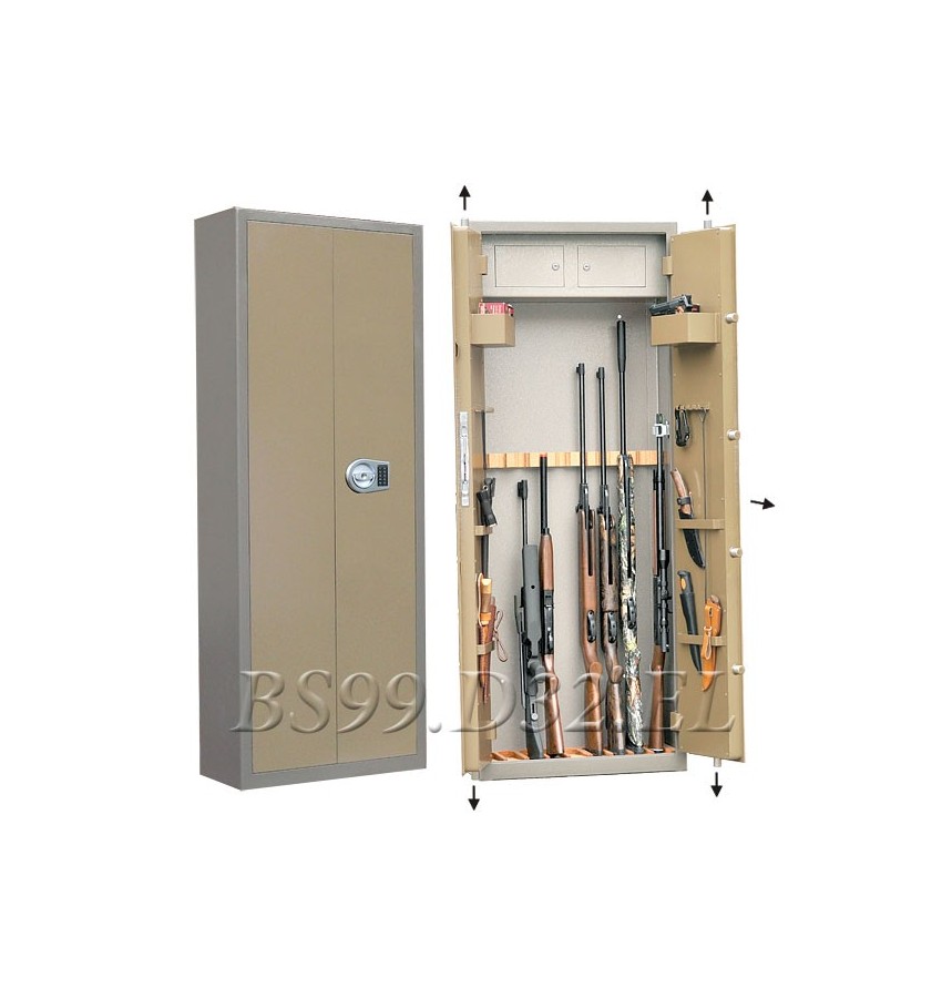 ОписаниеПолностью удовлетворяет требованиям МВД для физических и юридических лиц. Сейф имеет гигиенически безопасное износо- и коррозионно-устойчивое полимерно-порошковое покрытие на основе материалов производства Италии и Франции. Имеются покрытия различных цветов и структур: металлики, антики и д.р. Различные варианты цветового дизайна, например: корпус и двери имеют одинаковое покрытие, либо корпус и двери имеют покрытия разного цвета – выбирайте. Замок Сейф оборудован высокосекретным сертифицированным электронным замком La Gard (США). Этот замок Вы можете использовать с одним пользовательским кодом либо с двумя кодами: код руководителя (мастер-код) и рабочий код. Оба кода программирует сам владелец сейфа. Подробная и понятная инструкция на русском языке прилагается. Сейф имеет мощные ригельные системы: горизонтальную и две вертикальные (на каждой двери) - с запиранием по всем сторонам. Защита Изготовлен из стали толщиной 3 и 4 мм. Петли – внутренние из стали 6мм. Дверь сейфа имеет коробчатую конструкцию для дополнительного усиления. Внутреннее устройство Сейф имеет два внутренних запираемых (патронных) отделения а также нижние и верхние фигурные ложементы на 9 стволов. Все ложементы - деревянные с отделкой искусственной кожей или бархатом различных цветов. По желанию заказчика возможна замена верхних деревянных ложементов на роликовые ложементы-зажимы производства Германии либо дополнительная комплектация такими ложементами (например для боковой фиксации оружия с оптикой). Внимание, роликовые ложементы приобретаются отдельно со скидкой. На внутренней поверхности каждой двери сейфа имеется лоток (для хранения коробок с патронами и т.п.), крючки для хранения шомполов и ключей и две рамки для хранения ножей. Все вышеперечисленные элементы не внутренних поверхностях дверей – съёмные. Установка Предусмотрена возможность крепления сейфа к стене. По желанию заказчика возможна поставка в исполнении, предусматривающем также крепление и к полу. Модификации Высота хранимых стволов 1330 либо 1525мм., в зависимости от модификации - уточняйте это при заказе. Возможно изготовление модели с фасадом из стального листа толщиной 6мм, стоимость данной модификации выше на 20%. Существует также модель BS99.d32.EL.Lux, имеющая дополнительно полную внутреннюю мягкую отделку бархатом либо искусственной кожей различных цветов по нашему каталогу. Стоимость такой модели выше на 15%. Полная внутренняя мягкая отделка защищает Ваше оружие от контакта с металлом, царапин, повреждений и т.п. New! Поступила искусственная кожа, имитирующая кожу крокодилов, змей и т.п. Тоже различных цветов! По желанию заказчика возможна установка комбинационных замков на внутренние запираемые отделения. По желанию заказчика сейф дополнительно может быть оборудован опломбирующими устройствами. Существуют также модификации данного сейфа с дополнительным ключевым замком на наружной двери. По желанию заказчика возможно изменение размеров, толщины металла, внутреннего устройства и т.п. Имеются в продаже оригинальные антресоли к сейфам этой серии. При приобретении сейфа в комплекте с антресолью требуйте обязательную скидку. ДоставкаСтоимость доставки по Москве в пределах МКАД: при заказе от 20 000 рублей бесплатно, менее 20000 руб - 1200 рублей Доставка возможна на 06.12.2025 или на 0