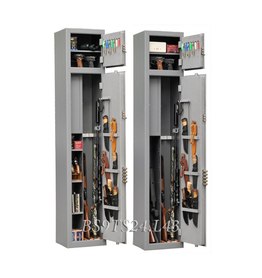ОписаниеДвухсекционный оружейный сейф. Полностью удовлетворяет требованиям МВД для физических и юридических лиц. Сейф имеет гигиенически безопасное износо- и коррозионно-устойчивое полимерно-порошковое покрытие на основе материалов производства Италии и Франции. Имеются покрытия различных цветов и структур: металлики, антики и д.р. Различные варианты цветового дизайна, например: корпус и двери имеют одинаковое покрытие, либо корпус и двери имеют покрытия разного цвета - выбирайте. Замок Замки произведены совместно с Cisa (Италия). Дверь нижней секции сейфа оборудована двумя сертифицированными ключевыми замками: пятиригельный замок 4-го класса!!! повышенной секретности (1,5 миллиона комбинаций) и взломостойкости плюс трёхригельный замок 3 класса. Также имеется вертикальная ригельная система с запиранием по всем сторонам. Дверь верхней секции сейфа оборудована трёхригельным замоком 3 класса. Защита Изготовлен из стали толщиной 3 и 4 мм. Петли – внутренние из стали 6мм. Дверь сейфа имеет коробчатую конструкцию для дополнительного усиления. Внутреннее устройство Внутри нижней секции сейфа имеется вертикальнорасположенное внутреннее запираемое (патронное) отделение с полкой внутри. Ниже запираемого отделения находятся три съёмные полки с регулируемой высотой установки. Если устанавливать не все полки, то на их месте можно хранить третий и четвёртый ствол. Так же имеются нижние и верхние деревянные ложементы с отделкой искусственной кожей или бархатом различных цветов. По желанию заказчика возможна замена верхних деревянных ложементов на роликовые ложементы-зажимы производства Германии либо дополнительная комплектация такими ложементами (например для боковой фиксации оптики). Внимание, роликовые ложементы приобретаются отдельно со скидкой. Ружья в сейфе можно хранить как по одну сторону от перегородки, так и по обе стороны от перегородки. Сейф дополнительно может быть укомплектован пистолетными ложементами (деревянными либо пластиковыми). Внутренняя поверхность двери нижней секции сейфа позволяет хранить на ней ножи, шомпола, связки ключей и т.п. Внутри верхней секции сейфа - съёмная полка. На внутренней поверхности двери верхней секции имеются крючки для хранения связок ключей и т.п. Установка Предусмотрена возможность крепления сейфа к стене. По желанию заказчика возможна поставка в исполнении, предусматривающем также крепление и к полу. Модификации Возможно изготовление модели с фасадом из стального листа толщиной 6мм, стоимость данной модификации выше на 20%. Существует также модель BS9TS24.L43.Lux, имеющая дополнительно полную внутреннюю мягкую отделку бархатом либо искусственной кожей различных цветов по нашему каталогу. Стоимость такой модели выше на 15%. Полная внутренняя мягкая отделка защищает Ваше оружие от контакта с металлом, царапин, повреждений и т.п. New! Поступила искусственная кожа, имитирующая кожу крокодилов, змей и т.п. Тоже различных цветов! По желанию заказчика сейф дополнительно может быть оборудован опломбирующими устройствами. По желанию заказчика возможно изменение размеров, толщины металла, внутреннего устройства и т.п. ДоставкаСтоимость доставки по Москве в пределах МКАД: при заказе от 20 000 рублей бесплатно, менее 20000 руб - 1200 рублей Доставка возможна на 06.12.2025 или на 07.12.2025 Доставка по РФ и СНГ