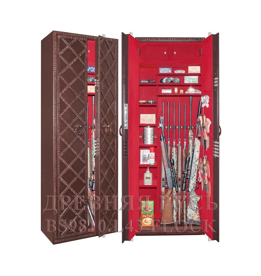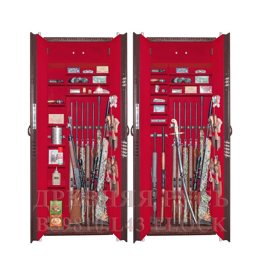 ОписаниеПолностью удовлетворяют требованиям МВД для физических и юридических лиц. Сейф имеет гигиенически безопасное износо- и коррозионно-устойчивое полимерно-порошковое покрытие на основе материалов производства Италии и Франции. Имеются покрытия различных цветов и структур: металлики, антики и д.р. Возможно патинирование различных цветов. Размеры даны с учётом выступающей фурнитуры. Замок Сейф оборудован двумя сертифицированными ключевыми замками: пятиригельный замок 4-го класса!!! повышенной секретности (1,5 миллиона комбинаций) и взломостойкости плюс трёхригельный замок 3 класса. Замки произведены совместно с Cisa (Италия). По желанию заказчика возможна поставка сейфов с замками производства Германии: Mauer или Wittkopp. Сейф имеет две мощные вертикальные (для каждой двери) и горизонтальную ригельные системы с запиранием по всем сторонам. Защита Изготовлен из стали толщиной 3 и 4 мм. Петли – внутренние из стали 6мм. Двери сейфа имеют коробчатую конструкцию для дополнительного усиления. Усиленный корпус. Данная кованная инкрустация выполнена в виде мощных стальных полос. Такая инкрустация кроме декоративной функции служит также для дополнительного усиления дверей и фасада корпуса сейфа. Внутреннее устройство Сейф имеет два внутренних запираемых (патронных) отделения и вертикальную перегородку, которая делит внутреннее пространства сейфа на две области. Внутри широкой области 3 съёмные полки с регулируемой высотой установки, а также нижние и верхние деревянные фигурные ложементы на 6 стволов. Также в широкой области имеются 2 роликовых ложемента-зажима (производства Германии) с регулируемой высотой установки. Эти ложементы могут быть использованы для хранения в широкой области седьмого и восьмого стволов либо для дополнительной боковой фиксации оружия с оптикой. Внутри узкой области 6 съёмных полок с регулируемой высотой установки, а также нижние и верхние деревянные ложементы на 2 ствола. По желанию заказчика возможна замена верхних деревянных ложементов на роликовые ложементы-зажимы производства Германии либо дополнительная комплектация такими ложементами (например для боковой фиксации оружия с оптикой). Ружья в сейфе можно хранить как в широкой, так и в узкой области. Сейф дополнительно может быть укомплектован пистолетными ложементами (деревянными либо пластиковыми). Внутренняя поверхность одной из дверей сейфа позволяет хранить на ней ножи, шомпола, связки ключей и т.п. Установка Предусмотрена возможность крепления оружейного шкафа к стене. Кроме того возможна поставка в исполнении, предусматривающем возможность крепления также и к полу. Уточните это с Вашим менеджером. Модификации В зависимости от типа внутренней отделки имеются три модификации этих оружейных сейфов. Модификация Primary имеет деревянные ложементы отделанные бархатом либо искусственной кожей. Модификация Lux имеет дополнительную мягкую полную внутреннюю отделку бархатом или искусственной кожей. Различные варианты цвета бархата и искусственной кожи по нашему каталогу. Модификация Flock имеет полную внутреннюю мягкую отделку флокированием бархатом (различных цветов по нашему каталогу), а также другие (премиум) ложементы. На фотографиях в открытом виде приведён пример сейфа, выполненного в модификации Flock. В данном случае флок – красный. По