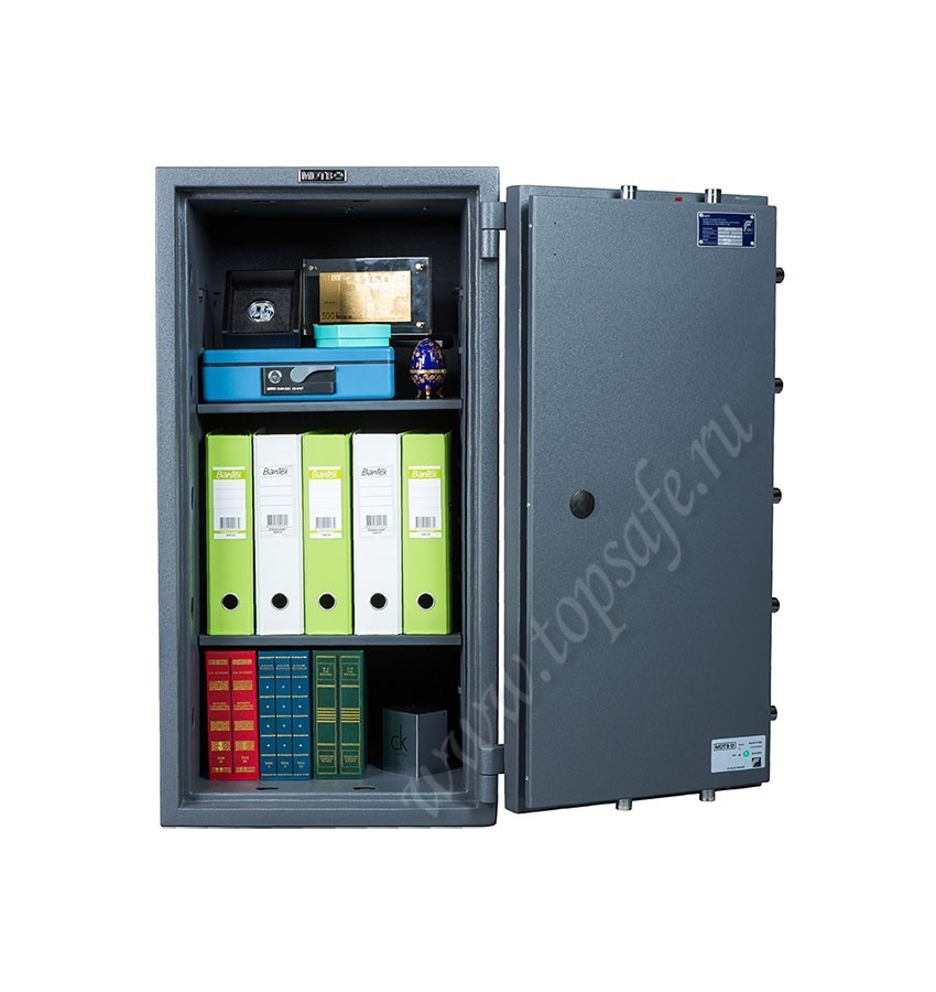 В сейф встроено два ключевых замка KABA MAUER с защитой от высверливания, выжигания и выбивания. Присутствует защита двери от выжигания.