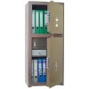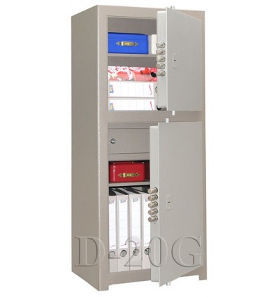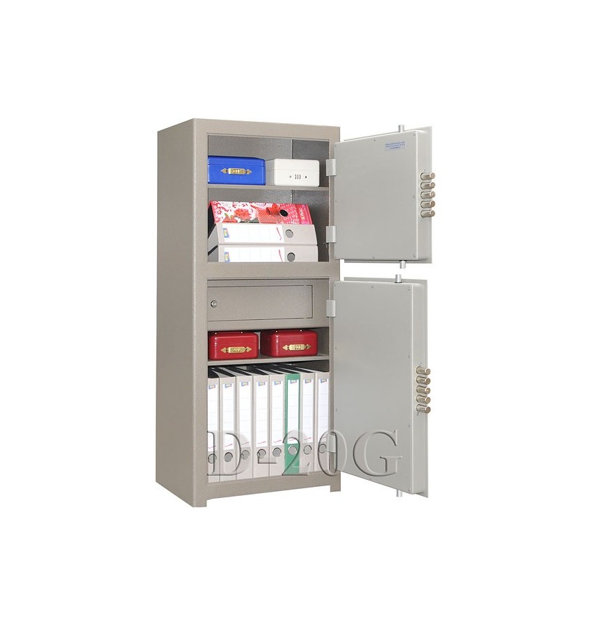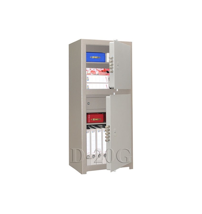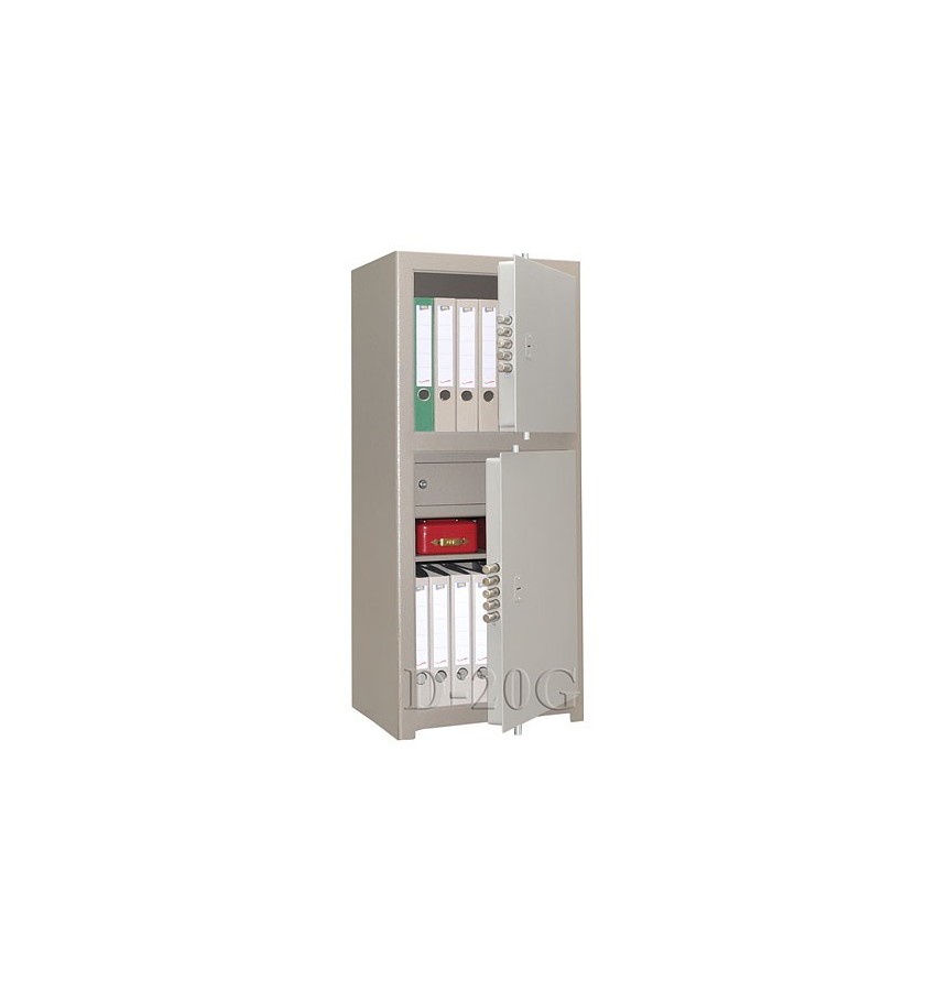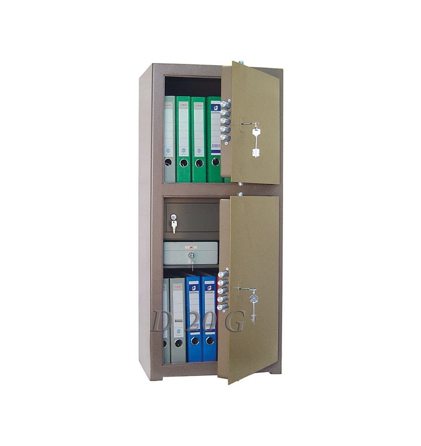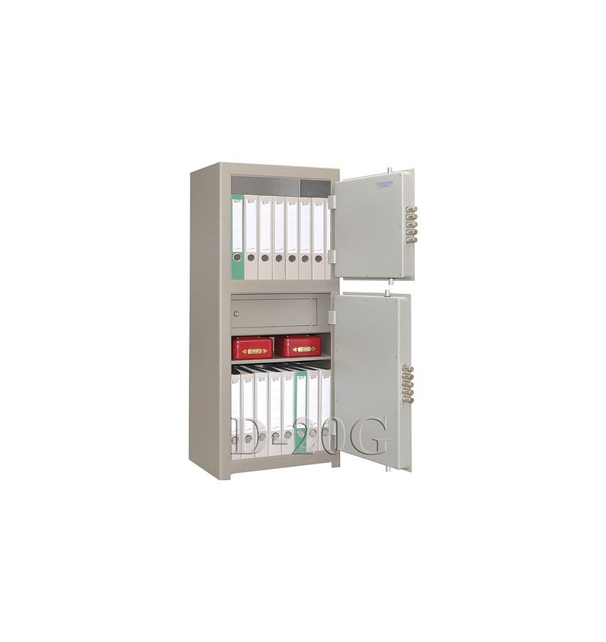 Офисный двухсекционный сейф. Гигиенически безопасное износо- и корозионно-устойчивое полимерное покрытие на основе материалов производства Италии и Германии. Замок Двери усиленные коробчатые, каждая оборудована многоригельной системой с запиранием по 3-м сторонам. Два сертифицированных ключевых замка (произведены совместно с Cisa Италия) 4-го класса!!! повышенной секретности (1.5 миллиона комбинаций) и взломостойкости. Замки различной секретности. Защита Изготовлен из стали 3 мм. Петли внутренние. Внутреннее устройство Верхняя секция оборудована съемной регулируемой по высоте полкой, в нижней секции запираемое кассовое отделение и полка. Помещаются папки типа Корона. Модификации Различные цвета и структуры: под гранит, металлики, антики и д.р.