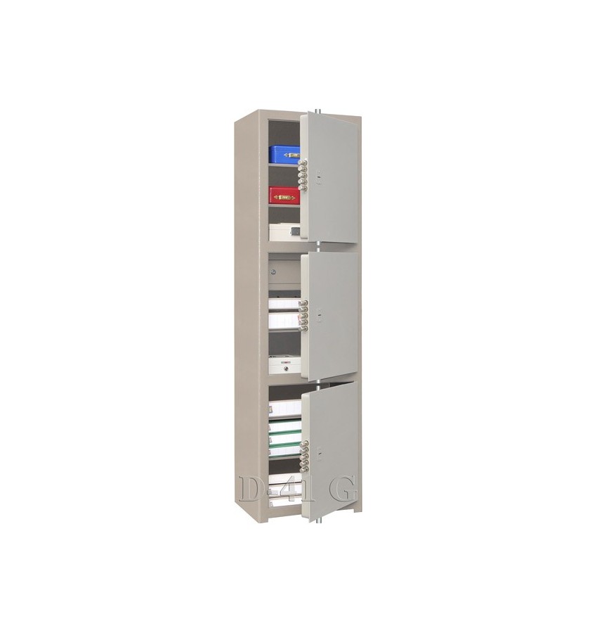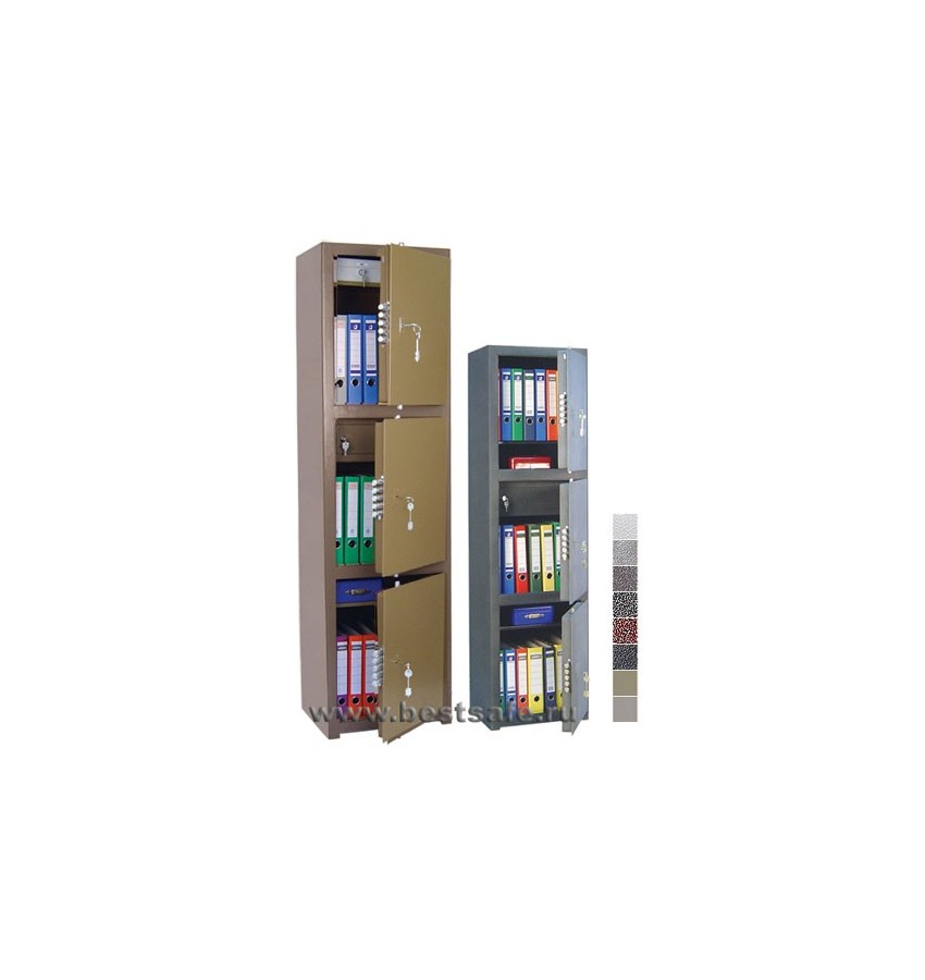 Офисный трех секционный сейф. Гигиенически безопасное износо- и коррозионно-устойчивое полимерное покрытие на основе материалов производства Италии и Германии. Замок Двери усиленные коробчатые, каждая оборудована многоригельной системой с запиранием по 3-м сторонам. Три сертифицированных ключевых замка (производства Россия-Италия) 4-го класса!!! повышенной секретности (1.5 миллиона комбинаций) и взломостойкости. Замки различной секретности. Защита Изготовлен из стали 3 мм. Петли внутренние. Внутреннее устройство В верхней и нижней секциях по 2 съемные полки с регулируемой высотой установки, в средней - запираемое кассовое отделение и полка. Помещаются папки типа Корона. Модификации Различные цвета: под гранит, металлики, антики и д.р.