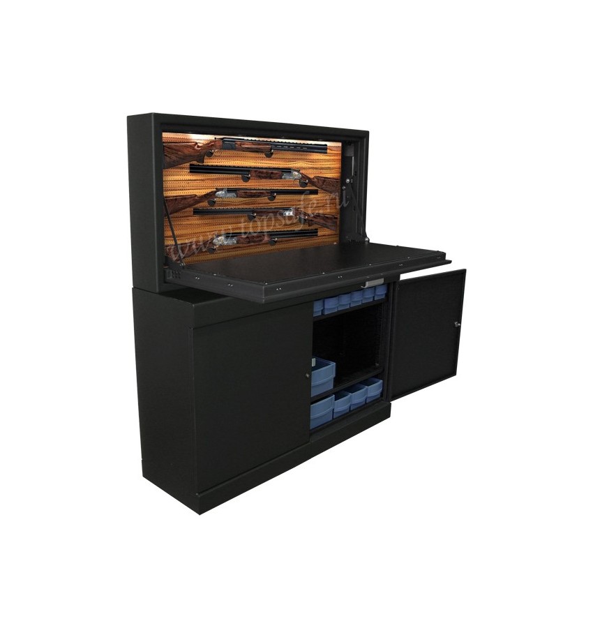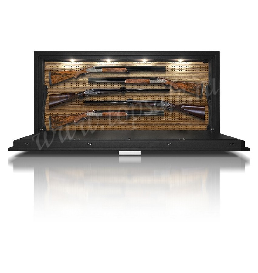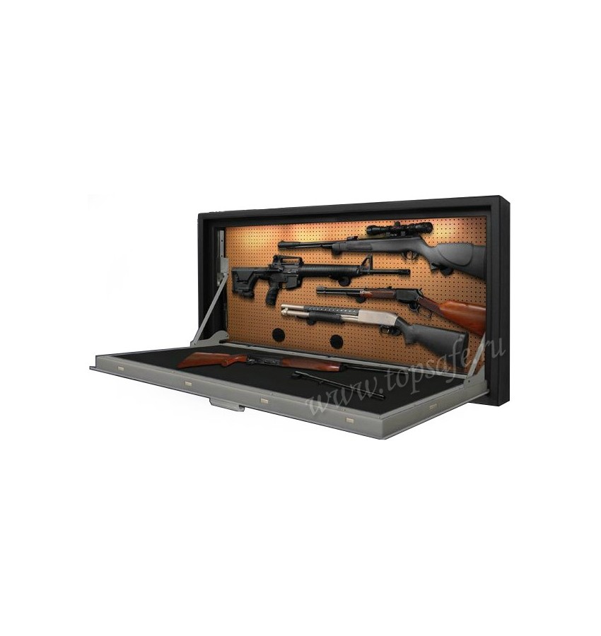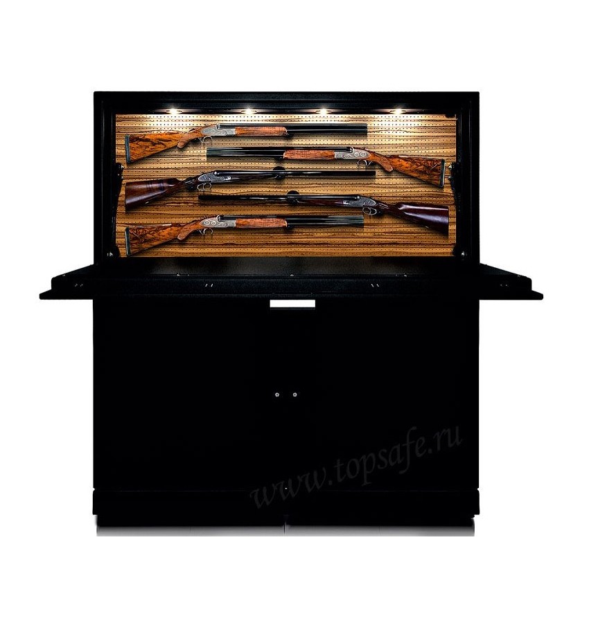 Сейф оснащен электронным замком LaGard и имеет трехстороннюю ригельную систему запирания. Ружья крепятся с помощью крючков (12 крючков в комплекте). Максимальная длина ружья - 1350 мм.