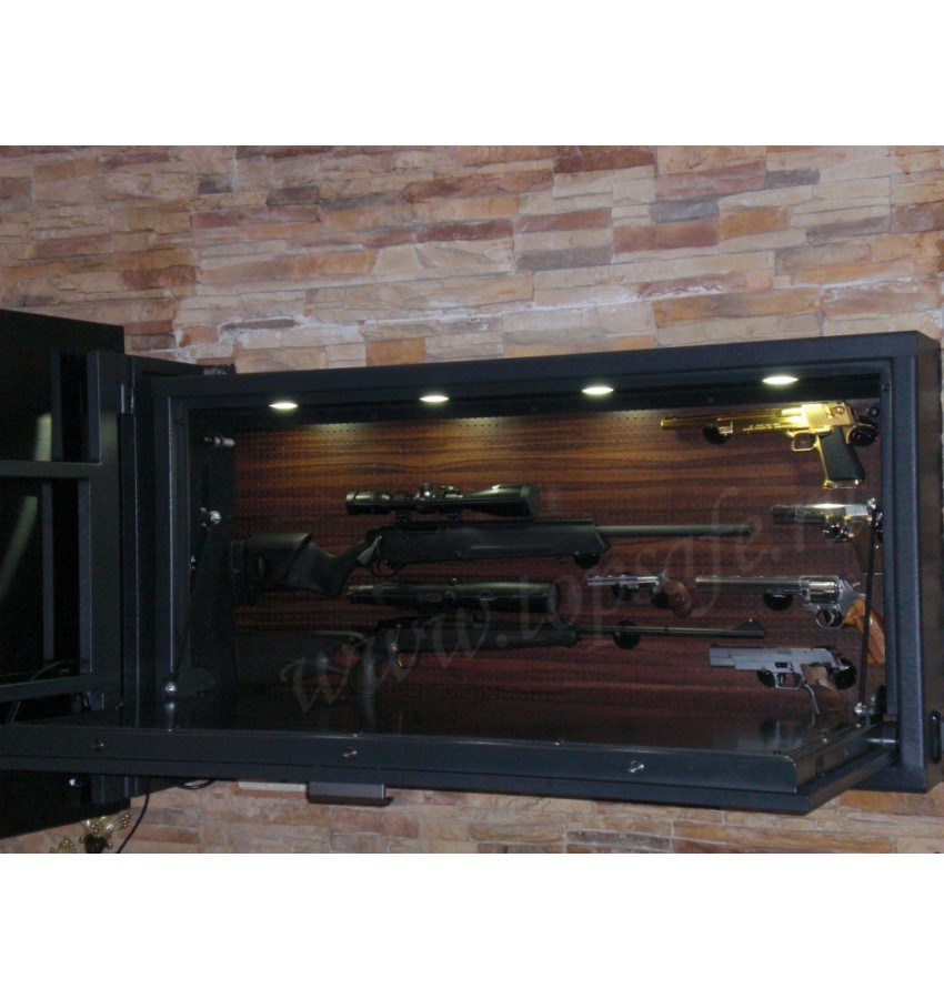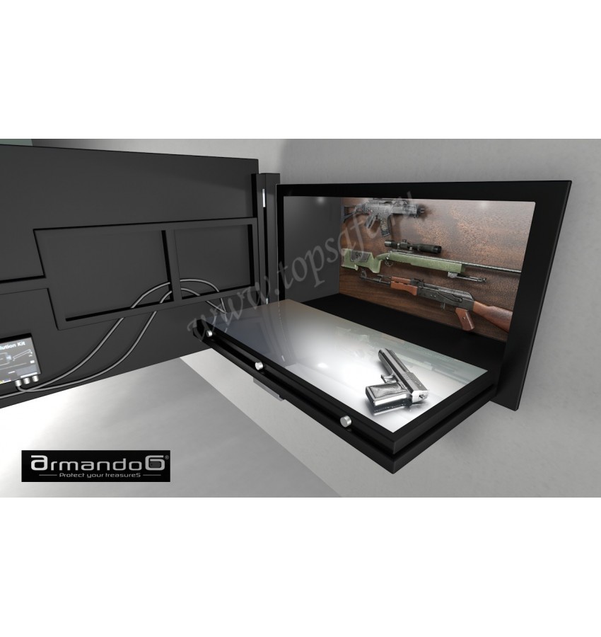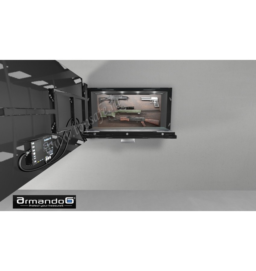 Имеется галогенная подсветка (4 фонаря) с автоматическим режимом работы. Дверца сейфа открывается вниз и вверх на 90 градусов. При открытии вниз дверца может быть использована в качестве рабочей поверхности для чистки оружия, а при открытии вверх возможно подключение других модулей Armando G.