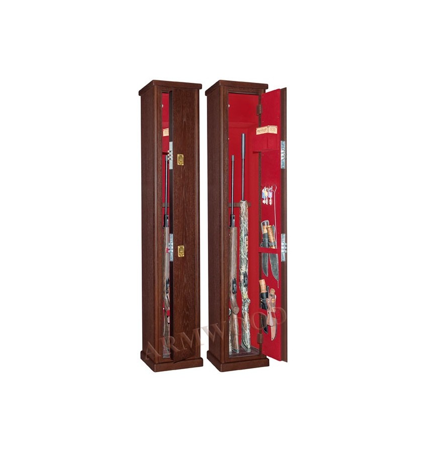 Элитный оружейный сейф с отделкой натуральным деревом. Сейфы полностью удовлетворяют требованиям МВД к хранению оружия. Замок Дверь сейфа оборудована двумя трёхригельными сертифицированными ключевыми замками 3 класса. Замки разработаны совместно с Cisa (Италия). По желанию заказчика возможна поставка сейфов с замками производства Германии: Mauer или Wittkopp. Защита Дверь сейфа имеет коробчатую конструкцию для дополнительного усиления. Петли внутренние из стали 6мм. Усиленный корпус. Внутреннее устройство Внутри сейфа деревянные ложементы на три ствола. На внутренней поверхности двери сейфа имеются: удобный лоток, два держателя для хранения ножей, а также крючки для хранения шомполов, ключей и прочего. Сейф имеет полную внутреннюю мягкую отделку флокированием бархатом (различных цветов по нашему каталогу). Полная внутренняя мягкая отделка защищает Ваше оружие от контакта с металлом, царапин, повреждений и т.п. Установка Предусмотрена возможность крепления сейфа к стене. По желанию заказчика возможна поставка в исполнении, предусматривающем также крепление и к полу. Модификации По желанию заказчика возможно изменение размеров, конструкции, внутреннего устройства и т.п. Возможна замена верхних деревянных ложементов на ложементы других типов (роликовые ложементы-зажимы производства Германии, специальные ложементы для хранения оружия с крупной оптикой и т.п.). Дополнительная информация Имеются различные варианты отделки натуральным деревом сейфов серии Armwood (под различную мебель). Возможна поставка данного сейфа в исполнении универсальный сейф. В этом случае сейф поставляется с дополнительными полками и может использоваться не только как оружейный сейф, но и как личный и офисный сейф.