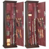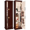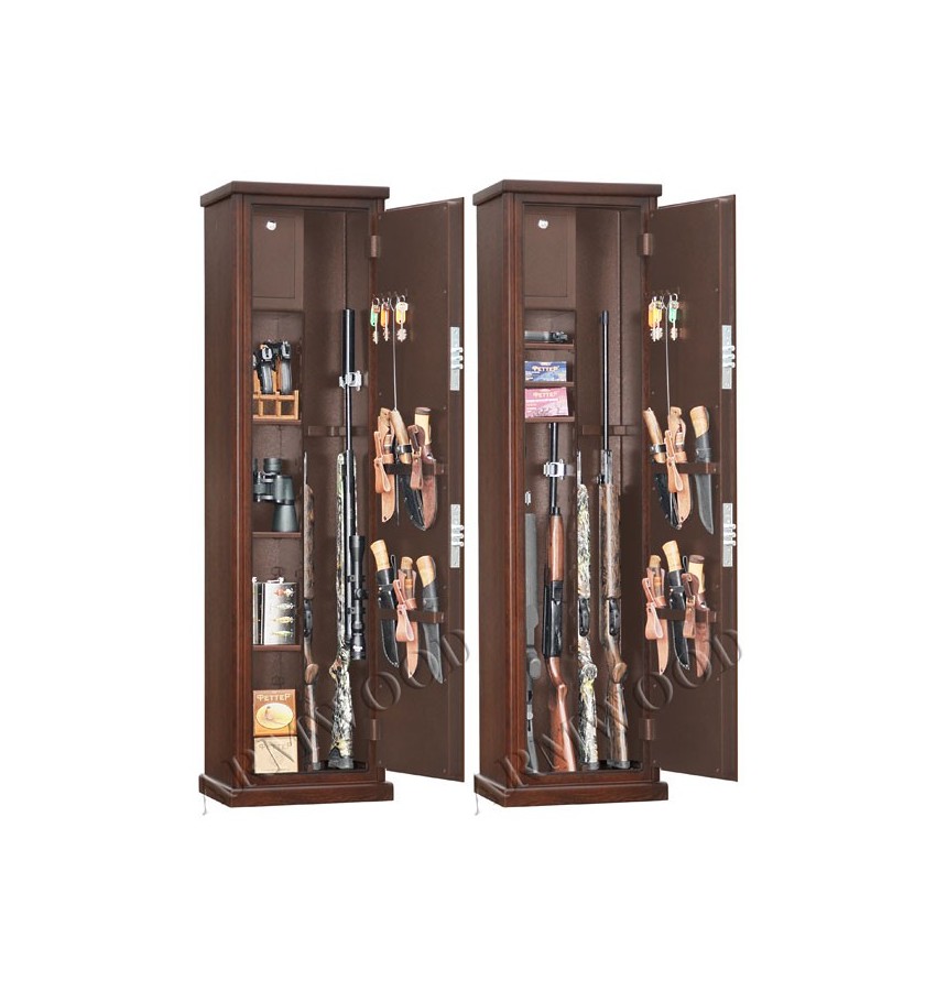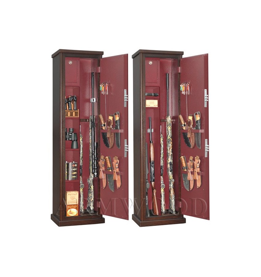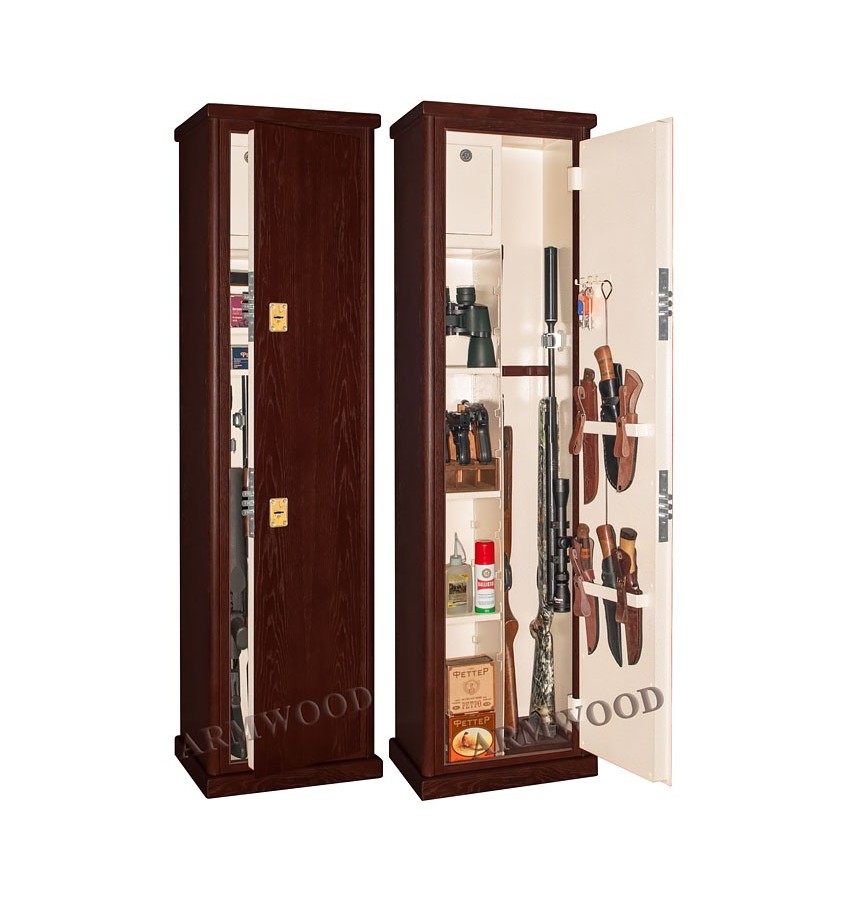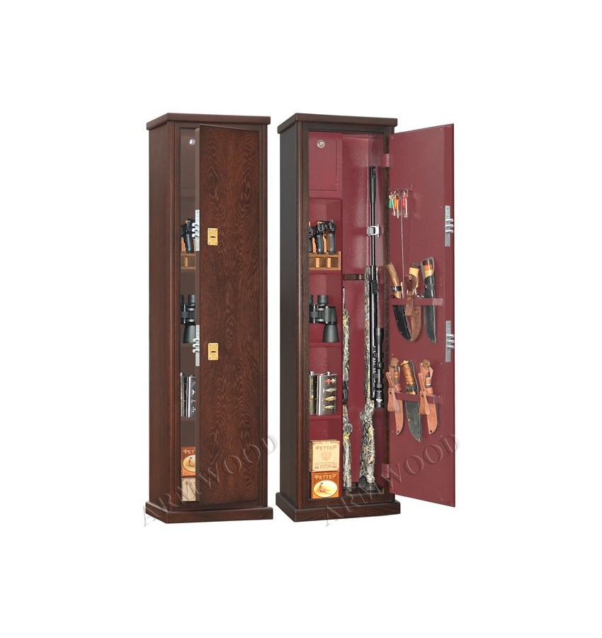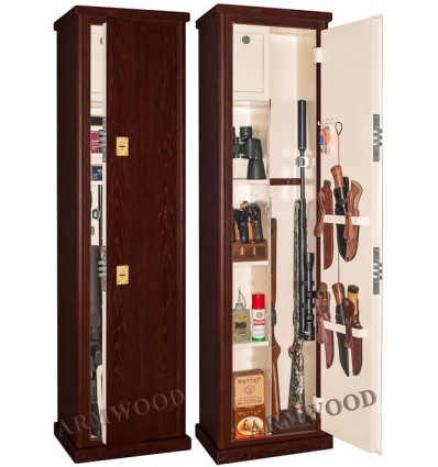 Элитный оружейный сейф с отделкой натуральным деревом. Сейфы полностью удовлетворяют требованиям МВД к хранению оружия. Замок Два сертифицированных трёхригельных ключевых замка 3 класса. Замки разработаны совместно с Cisa (Италия). По желанию заказчика возможна поставка сейфов с замками производства Германии: Mauer или Wittkopp. Защита Дверь сейфа имеет коробчатую конструкцию для дополнительного усиления. Петли внутренние из стали 6мм. Усиленный корпус. Внутреннее устройство Внутри сейфа вертикальная перегородка, которая делит внутреннее пространство сейфа на два отделения. Внутри правого отделения верхние и нижние деревянные ложементы на два ствола. Внутри левого отделения вертикальнорасположенное внутреннее запираемое (патронное) отделение. Ниже запираемого отделения находятся три съёмные полки с регулируемой высотой установки. Если устанавливать не все полки, то на их месте можно хранить третий и четвёртый ствол. Так же в комплект сейфа входит дополнительный роликовый ложемент, который легко устанавливается в любое нужное место сейфа (например этот ложемент можно использовать для более удобного хранения оружия с оптикой). На двери сейфа: два удобных держателя для ножей, а также крючки для шомполов, ключей и пр.. Установка Предусмотрена возможность крепления сейфа к стене. По желанию заказчика возможна поставка в исполнении, предусматривающем также крепление к полу. Модификации Для сейфов Armwood с внутренней отделкой Primary имеется возможность выбрать различные варианты полимерно-порошковых покрытий. Имеются покрытия различных цветов и структур, например на фото в открытом виде покрытие №39 (бордовое). Некоторые варианты полимерно-порошковых покрытий представлены на дополнительном фото. По желанию заказчика возможно изменение размеров, конструкции, внутреннего устройства и т.п. Возможна замена верхних деревянных ложементов на ложементы других типов (роликовые ложементы-зажимы производства Германии, специальные ложементы для хранения оружия с крупной оптикой и т.п.). Металлические детали сейфа имеют гигиенически безопасное износо- и коррозионно-устойчивое полимерно-порошковое покрытие на основе материалов производства Италии или Франции. Имеются покрытия различных цветов и структур: металлики, антики и д.р. Дополнительная информация Имеются различные варианты отделки натуральным деревом сейфов серии Armwood (под различную мебель). Возможна поставка данного сейфа в исполнении универсальный сейф. В этом случае сейф поставляется с дополнительными полками и может использоваться не только как оружейный сейф, но и как личный и офисный сейф.