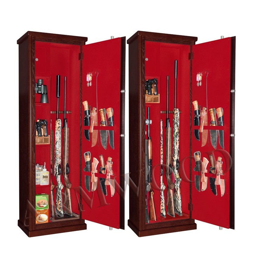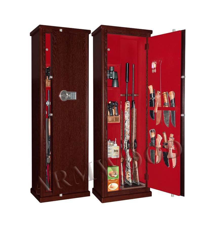 Элитный оружейный сейф с отделкой натуральным деревом. Сейфы полностью удовлетворяют требованиям МВД к хранению оружия. Замок Сейф оборудован высокосекретным сертифицированным электронным кодовым замком. Этот замок Вы можете использовать с одним пользовательским кодом либо с двумя кодами: код руководителя (мастер-код) и рабочий код. Подробная и понятная инструкция на русском языке прилагается. Питание электронного замка от стандартной батарейки. Долгий срок службы батарейки. Простая смена разряженной батарейки. Сейф может поставляться с электронными замками различных типов. Уточните у Вашего менеджера при заказе тип электронного замка и дизайн кодовой панели. Сейф имеет мощную вертикальную и горизонтальную ригельную систему с запиранием по всем сторонам. Внутреннее устройство Внутри сейфа вертикальная перегородка, которая делит внутреннее пространство сейфа на два отделения. Внутри широкого отделения верхние и нижние деревянные ложементы на три ствола. Внутри узкого отделения вертикальнорасположенное внутреннее запираемое (патронное) отделение. Ниже запираемого отделения находятся три съёмные полки с регулируемой высотой установки. Если устанавливать не все полки, то на их месте можно хранить четвёртый и пятый ствол. На двери сейфа: два удобных держателя для ножей, а также крючки для шомполов, ключей и пр. Сейф имеет полную внутреннюю мягкую отделку флокированием бархатом (различных цветов по нашему каталогу). Например на фото в открытом виде флок – бордовый. Некоторые возможные варианты флока представлены на дополнительном фото. Полная внутренняя мягкая отделка защищает Ваше оружие от контакта с металлом, царапин, повреждений и т.п. Установка Предусмотрена возможность крепления сейфа к стене. По желанию заказчика возможна поставка в исполнении, предусматривающем также крепление к полу. Модификации Сейф может быть так же поставлен в базовой модификации Primary. По желанию заказчика возможно изменение размеров, конструкции, внутреннего устройства и т.п. Возможна замена верхних деревянных ложементов на ложементы других типов (роликовые ложементы-зажимы производства Германии, специальные ложементы для хранения оружия с крупной оптикой и т.п.). Дополнительная информация Имеются различные варианты отделки натуральным дубом сейфов серии Armwood (под различную мебель). Возможна поставка данного сейфа в исполнении универсальный сейф. В этом случае сейф поставляется с дополнительными полками и может использоваться не только как оружейный сейф, но и как личный и офисный сейф.