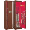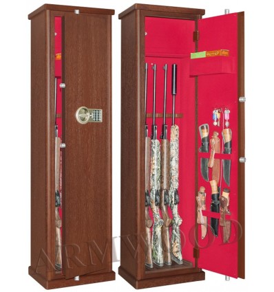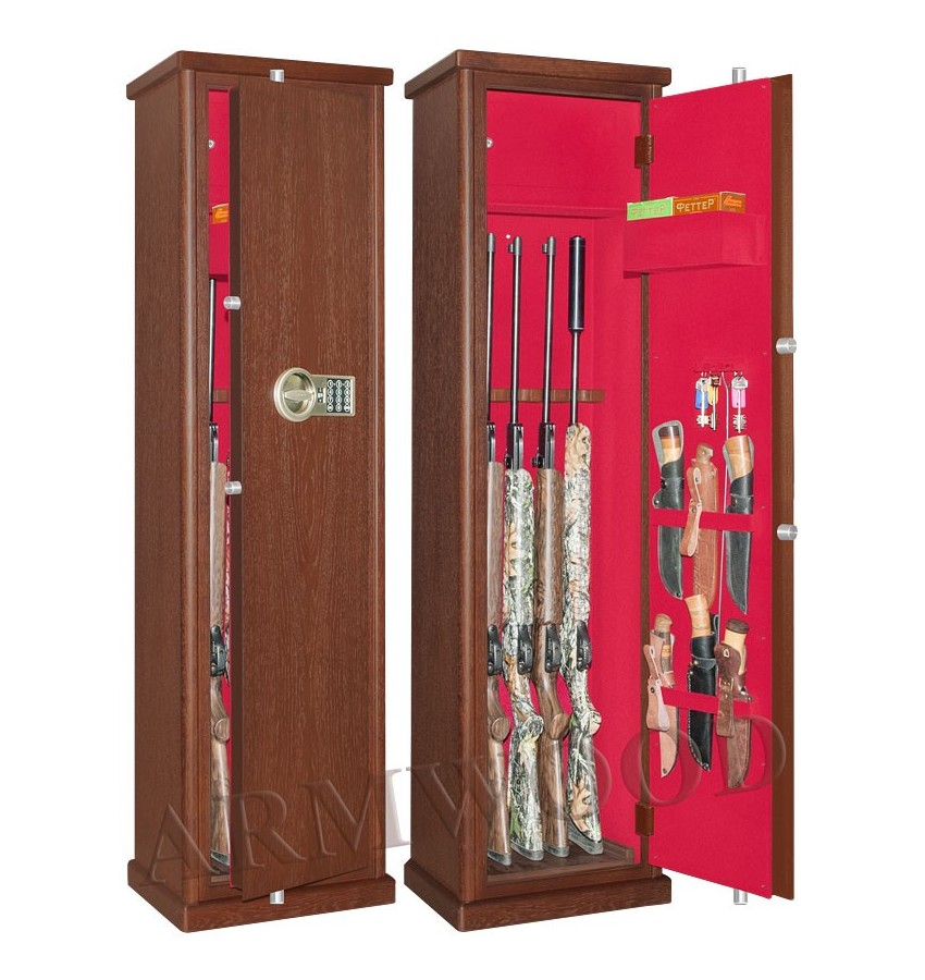 Элитный оружейный сейф с отделкой натуральным деревом. Сейфы полностью удовлетворяют требованиям МВД к хранению оружия. Замок Сейф оборудован высокосекретным сертифицированным электронным кодовым замком. Этот замок Вы можете использовать с одним пользовательским кодом либо с двумя кодами: код руководителя (мастер-код) и рабочий код. Подробная и понятная инструкция на русском языке прилагается. Питание электронного замка от стандартной батарейки. Долгий срок службы батарейки. Простая смена разряженной батарейки. Сейф может поставляться с электронными замками различных типов. Уточните у Вашего менеджера при заказе - тип электронного замка и дизайн кодовой панели. Сейф имеет мощную вертикальную и горизонтальную ригельную систему с запиранием по всем сторонам. Защита Дверь сейфа имеет коробчатую конструкцию для дополнительного усиления. Петли внутренние из стали 6мм. Усиленный корпус. Внутреннее устройство Внутри сейфа вместительное запираемое (патронное) отделение и деревянные ложементы на 5 стволов. На двери сейфа: удобный лоток; крючки для шомполов, ключей и пр.; два удобных держателя для ножей. Сейф имеет полную внутреннюю мягкую отделку флокированием бархатом (различных цветов по нашему каталогу). Например на фото в открытом виде флок – красный. Некоторые возможные варианты флока представлены на дополнительном фото. Полная внутренняя мягкая отделка защищает Ваше оружие от контакта с металлом, царапин, повреждений и т.п. Установка Предусмотрена возможность крепления сейфа к стене. По желанию заказчика возможна поставка в исполнении, предусматривающем также крепление к полу. Модификации Сейф может быть так же поставлен в базовой модификации Primary. По желанию заказчика возможно изменение размеров, конструкции, внутреннего устройства и т.п. Возможна замена верхних деревянных ложементов на ложементы других типов (роликовые ложементы-зажимы производства Германии, специальные ложементы для хранения оружия с крупной оптикой и т.п.). Дополнительная информация Имеются различные варианты отделки натуральным деревом сейфов серии Armwood (под различную мебель). Возможна поставка данного сейфа в исполнении универсальный сейф. В этом случае сейф поставляется с дополнительными полками и может использоваться не только как оружейный сейф, но и как личный и офисный сейф.