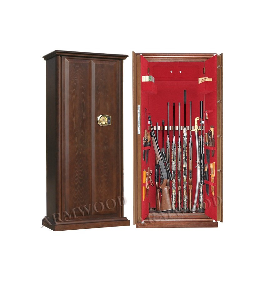 Элитный оружейный сейф с отделкой натуральным деревом. Сейфы полностью удовлетворяют требованиям МВД к хранению оружия. Замок Сейф оборудован высокосекретным сертифицированным электронным кодовым замком La Gard (США). Этот замок Вы можете использовать с одним пользовательским кодом либо с двумя кодами: код руководителя (мастер-код) и рабочий код. Подробная и понятная инструкция на русском языке прилагается. Питание электронного замка от стандартной батарейки. Долгий срок службы батарейки. Простая смена разряженной батарейки. Сейф имеет две мощные вертикальные (для каждой двери) и горизонтальную ригельные системы с запиранием по всем сторонам. Защита Двери сейфа имеют коробчатую конструкцию для дополнительного усиления. Петли внутренние из стали 6мм. Усиленный корпус. Внутреннее устройство Внутри сейфа два запираемых (патронных) отделения. Ложементы деревянные. Также на боковых стенках имеются два съёмных роликовых ложемента-зажима (производства Германии) с регулируемой высотой установки. Дополнительная возможная опция - съемные полки. Внутренняя поверхность каждой двери по Вашему желанию может иметь удобные лотки (для хранения коробок с патронами и др.), крючки (для хранения шомполов, ключей и др.), держатели для ножей и т.п. На внутренней поверхности одной из дверей сейфа имеются удобные крючки и два держателя для хранения ножей и пр. Внутренняя отделка Сейфы ARMWOOD модификации FLOCK имеют престижную полную внутреннюю мягкую отделку флокированием бархатом (различных цветов по нашему каталогу), например на фото – флок бордо. Полная внутренняя мягкая отделка защищает Ваше оружие от контакта с металлом, царапин повреждений и т.п. Некоторые варианты флока представлены на дополнительном фото. Установка Предусмотрена возможность крепления сейфа к стене. По желанию заказчика возможна поставка в исполнении, предусматривающем также крепление к полу. Модификации В зависимости от типа внутренней отделки имеются четыре модификации этих оружейных сейфов. Модификация Primary (базовая) имеет деревянные ложементы отделанные бархатом либо винилискожей либо ложементы «премиум». Модификации Lux и Lux+ имеют дополнительно к базовой - мягкую полную внутреннюю отделку винилискожей или бархатом. Различные варианты цвета бархата и винилискожи по нашему каталогу. New! Поступила винилискожа, имитирующая кожу крокодилов, змей и т.п. Тоже различных цветов! Модификация Lux+ отличается от модификации Lux следующим: дополнительная отделка фасадов внутренних запираемых отделений деревом. Модификация Flock имеет полную внутреннюю мягкую отделку флокированием бархатом (различных цветов по нашему каталогу), а также ложементы «премиум». На основном фото пример сейфа в модификации Flock, цвет флока – красный. Полная внутренняя мягкая отделка защищает Ваше оружие от контакта с металлом, царапин повреждений и т.п. Металлические детали сейфа имеют гигиенически безопасное износо- и коррозионно-устойчивое полимерно-порошковое покрытие на основе материалов производства Италии или Франции. Имеются покрытия различных цветов и структур: металлики, антики и д.р. По желанию заказчика возможно изменение размеров, конструкции, внутреннего устройства и т.п. Возможна замена верхних деревянных ложементов на ложементы других типов (роликовые ложементы-зажимы производства 