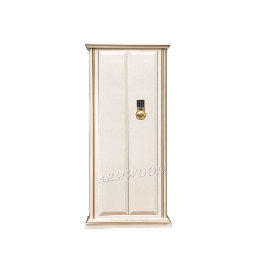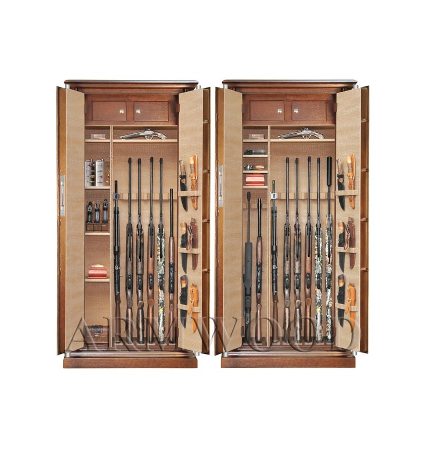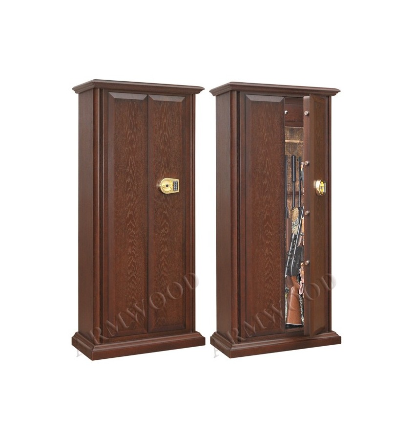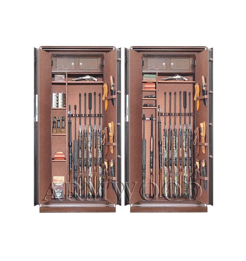 Элитный оружейный сейф с отделкой натуральным деревом. Сейфы полностью удовлетворяют требованиям МВД к хранению оружия. Замок Сейф оборудован высокосекретным сертифицированным электронным кодовым замком La Gard (США). Этот замок Вы можете использовать с одним пользовательским кодом либо с двумя кодами: код руководителя (мастер-код) и рабочий код. Подробная и понятная инструкция на русском языке прилагается. Питание электронного замка от стандартной батарейки. Долгий срок службы батарейки. Простая смена разряженной батарейки. Сейф имеет мощные ригельные системы (две вертикальные и горизонтальную) с запиранием по всем сторонам. Защита Двери сейфа имеют коробчатую конструкцию для дополнительного усиления. Петли внутренние из стали 6мм. Усиленный корпус. Внутреннее устройство Внутреннее устройство сейфа: два запираемых (патронных) отделения и вертикальная перегородка которая делит внутреннее пространство сейфа на две области. Внутри «широкой» области одна либо две длинные съёмные полки и деревянные ложементы на 7 стволов. Кроме того по желанию заказчика дополнительно возможна установка роликового ложемента-зажима (производства Германии), для хранения в широкой области восьмого ствола либо для дополнительной фиксации оружия с оптикой. Внутри «узкой» области четыре короткие съёмные полки и деревянные ложементы на 2 ствола. Все полки с регулируемой высотой установки. По желанию заказчика возможна поставка с дополнительными полками. Ружья можно хранить как в широком, так и в узком отделениях сейфа. На внутренней поверхности одной из дверей сейфа имеются три держателя для хранения ножей и пр. Внутренняя отделка Сейфы ARMWOOD модификации Lux Plus имеют полную внутреннюю мягкую отделку искусственной кожей (различных цветов и рисунков по нашему каталогу). Дополнительная отделка фасадов внутренних запираемых отделений деревом. NEW! Поступила искусственная кожа, имитирующая кожу крокодилов, змей и т.п. Тоже различных цветов! На основном фото пример сейфа с внутренней отделкой «бежевый крокодил». Полная внутренняя мягкая отделка защищает Ваше оружие от контакта с металлом, царапин повреждений и т.п. Некоторые варианты искусственной кожи представлены на дополнительном фото. Установка Предусмотрена возможность крепления сейфа к стене. По желанию заказчика возможна поставка в исполнении, предусматривающем также крепление к полу. Модификации В зависимости от типа внутренней отделки имеются пять модификаций этих оружейных сейфов. Модификация Primary (базовая) имеет деревянные ложементы отделанные бархатом либо винилискожей либо ложементы «премиум». Модификации Lux и Lux Plus имеют дополнительно к базовой - мягкую полную внутреннюю отделку искусственной кожей или бархатом. Различные варианты цвета бархата и искусственной кожи по нашему каталогу. New! Поступила винилискожа, имитирующая кожу крокодилов, змей и т.п. Тоже различных цветов! Модификация Lux Plus отличается от модификации Lux следующим: дополнительная отделка фасадов внутренних запираемых отделений деревом. Модификации Flock и Flock Plus - имеют полную внутреннюю мягкую отделку флокированием бархатом (различных цветов по нашему каталогу) и ложементы «премиум». Модификация Flock Plus отличается от модификации Flock следующим: 1) дополнительная отделка фасадов внутренних запираемых отделений де