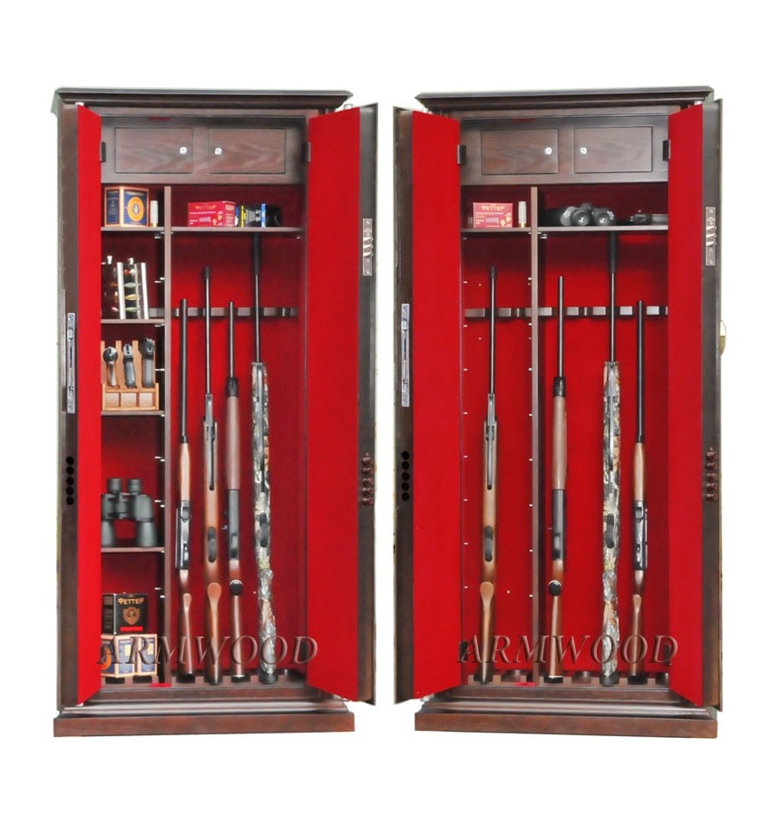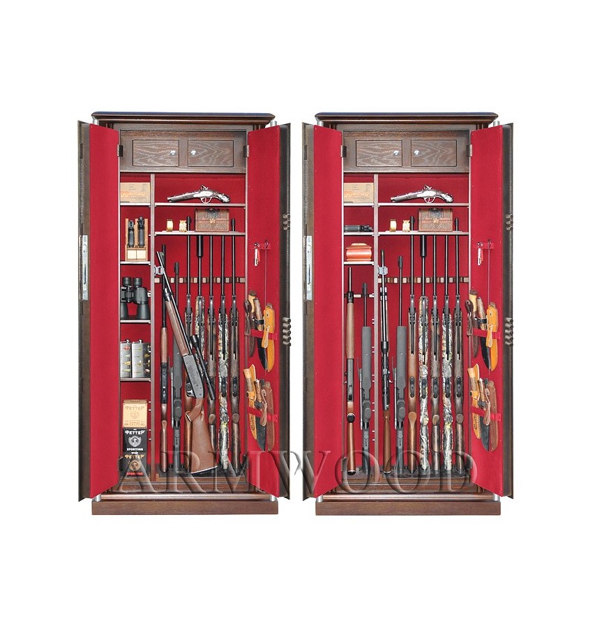 Элитный оружейный сейф с отделкой натуральным деревом. Сейфы полностью удовлетворяют требованиям МВД к хранению оружия. Замок Сейф оборудован двумя сертифицированными ключевыми замками: замок 4-го класса!!! повышенной взломостойкости и секретности (1,5 миллиона комбинаций) плюс замок 3 класса. Замки разработаны Cisa (Италия). По желанию заказчика возможна поставка сейфов с замками производства Германии: Mauer или Wittkopp. Сейф имеет мощные ригельные системы (две вертикальные и горизонтальную) с запиранием по всем сторонам. Защита Двери сейфа имеют коробчатую конструкцию для дополнительного усиления. Петли внутренние из стали 6мм. Усиленный корпус. Внутреннее устройство Внутреннее устройство сейфа: два запираемых (патронных) отделения и вертикальная перегородка которая делит внутреннее пространство сейфа на две области. Внутри «широкой» области одна либо две длинные съёмные полки и деревянные ложементы на 7 стволов. Кроме того по желанию заказчика дополнительно возможна установка роликового ложемента-зажима (производства Германии), для хранения в широкой области восьмого ствола либо для дополнительной фиксации оружия с оптикой. Внутри «узкой» области четыре короткие съёмные полки и деревянные ложементы на 2 ствола. Все полки с регулируемой высотой установки. По желанию заказчика возможна поставка с дополнительными полками. Ружья можно хранить как в широком, так и в узком отделениях сейфа. На внутренней поверхности одной из дверей сейфа имеются удобные крючки и два держателя для хранения ножей и пр. Внутренняя отделка Сейфы ARMWOOD модификации FLOCK+ имеют престижную полную внутреннюю мягкую отделку флокированием бархатом (различных цветов по нашему каталогу), например на фото – флок бордо. Полная внутренняя мягкая отделка защищает Ваше оружие от контакта с металлом, царапин повреждений и т.п. Некоторые варианты флока представлены на дополнительном фото. В модификации FLOCK+ фасады внутренних запираемых отделений имеют отделку деревом. Внутренняя перегородка и полки также выполнены из дерева. Установка Предусмотрена возможность крепления сейфа к стене. По желанию заказчика возможна поставка в исполнении, предусматривающем также крепление к полу. Модификации В зависимости от типа внутренней отделки имеются пять модификаций этих оружейных сейфов. Модификация Primary (базовая) имеет деревянные ложементы отделанные бархатом либо винилискожей либо ложементы «премиум». Модификации Lux и Lux+ имеют дополнительно к базовой - мягкую полную внутреннюю отделку винилискожей или бархатом. Различные варианты цвета бархата и винилискожи по нашему каталогу. New! Поступила винилискожа, имитирующая кожу крокодилов, змей и т.п. Тоже различных цветов! Модификация Lux+ отличается от модификации Lux следующим: дополнительная отделка фасадов внутренних запираемых отделений деревом. Модификации Flock и Flock+ - имеют полную внутреннюю мягкую отделку флокированием бархатом (различных цветов по нашему каталогу) и ложементы «премиум». Модификация Flock+ отличается от модификации Flock следующим: 1) дополнительная отделка фасадов внутренних запираемых отделений деревом, 2) перегородка и полки – деревянные (в модификации Flock – они металлические флокированные). На основном фото – пример сейфа в модификации Flock+, цвет флока – бордо. Полная внутренняя мягкая отделка защ