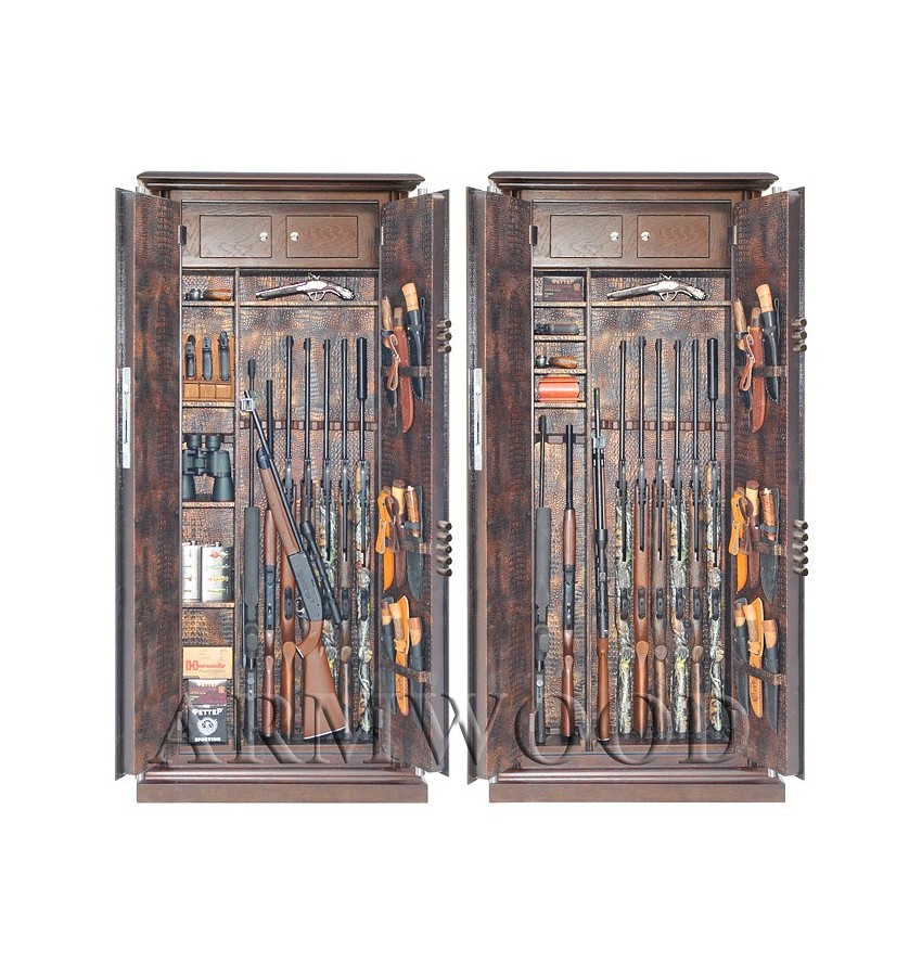 Элитный оружейный сейф с отделкой натуральным деревом. Сейфы полностью удовлетворяют требованиям МВД к хранению оружия. Замок Сейф оборудован двумя сертифицированными ключевыми замками: замок 4-го класса!!! повышенной взломостойкости и секретности (1,5 миллиона комбинаций) плюс замок 3 класса. Замки разработаны Cisa (Италия). По желанию заказчика возможна поставка сейфов с замками производства Германии: Mauer или Wittkopp. Сейф имеет мощные ригельные системы (две вертикальные и горизонтальную) с запиранием по всем сторонам. Защита Двери сейфа имеют коробчатую конструкцию для дополнительного усиления. Петли внутренние из стали 6мм. Усиленный корпус. Внутреннее устройство Внутреннее устройство сейфа: два запираемых (патронных) отделения и вертикальная перегородка которая делит внутреннее пространство сейфа на две области. Внутри «широкой» области одна либо две длинные съёмные полки и деревянные ложементы на 7 стволов. Кроме того по желанию заказчика дополнительно возможна установка роликового ложемента-зажима (производства Германии), для хранения в широкой области восьмого ствола либо для дополнительной фиксации оружия с оптикой. Внутри «узкой» области четыре короткие съёмные полки и деревянные ложементы на 2 ствола. Все полки с регулируемой высотой установки. По желанию заказчика возможна поставка с дополнительными полками. Ружья можно хранить как в широком, так и в узком отделениях сейфа. На внутренней поверхности одной из дверей сейфа имеются три держателя для хранения ножей и пр. Внутренняя отделка Сейфы ARMWOOD модификации Lux Plus имеют полную внутреннюю мягкую отделку искусственной кожей (различных цветов и рисунков по нашему каталогу). Дополнительная отделка фасадов внутренних запираемых отделений деревом. NEW! Поступила искусственная кожа, имитирующая кожу крокодилов, змей и т.п. Тоже различных цветов! На основном фото пример сейфа с внутренней отделкой «бежевый крокодил». Полная внутренняя мягкая отделка защищает Ваше оружие от контакта с металлом, царапин повреждений и т.п. Установка Предусмотрена возможность крепления сейфа к стене. По желанию заказчика возможна поставка в исполнении, предусматривающем также крепление к полу. Модификации В зависимости от типа внутренней отделки имеются пять модификаций этих оружейных сейфов. Модификация Primary (базовая) имеет деревянные ложементы отделанные бархатом либо винилискожей либо ложементы «премиум». Модификации Lux и Lux+ имеют дополнительно к базовой - мягкую полную внутреннюю отделку винилискожей или бархатом. Различные варианты цвета бархата и винилискожи по нашему каталогу. New! Поступила винилискожа, имитирующая кожу крокодилов, змей и т.п. Тоже различных цветов! Модификация Lux+ отличается от модификации Lux следующим: дополнительная отделка фасадов внутренних запираемых отделений деревом. Модификации Flock и Flock+ - имеют полную внутреннюю мягкую отделку флокированием бархатом (различных цветов по нашему каталогу) и ложементы «премиум». Модификация Flock+ отличается от модификации Flock следующим: 1) дополнительная отделка фасадов внутренних запираемых отделений деревом, 2) перегородка и полки – деревянные (в модификации Flock – они металлические флокированные). Полная внутренняя мягкая отделка защищает Ваше оружие от контакта с металлом, царапин, повреждений и т.п. Металлически