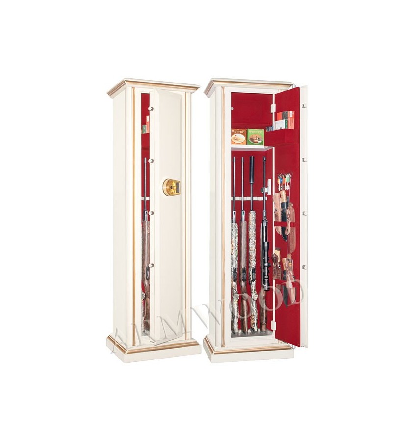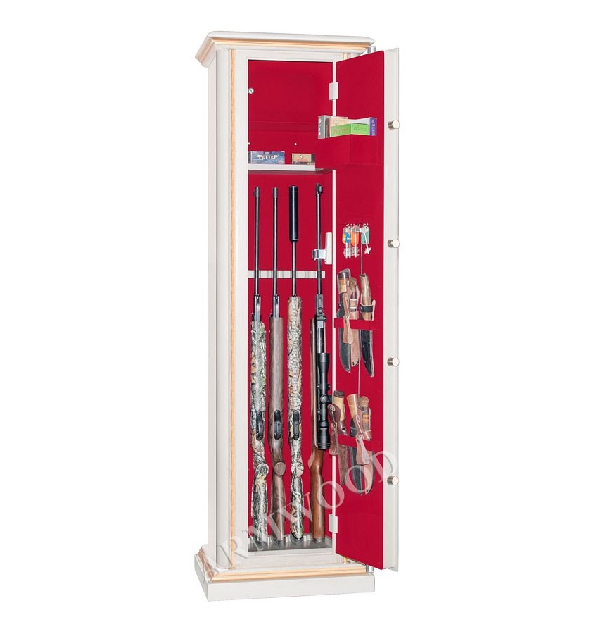Элитный оружейный сейф с отделкой натуральным деревом. Окрашенное дерево (по каталогу RAL) с патинированием. Сейфы полностью удовлетворяют требованиям МВД к хранению оружия. Замок Сейф оборудован высокосекретным сертифицированным электронным кодовым замком La Gard (США). Этот замок Вы можете использовать с одним пользовательским кодом либо с двумя кодами: код руководителя (мастер-код) и рабочий код. Подробная и понятная инструкция на русском языке прилагается. Питание электронного замка от стандартной батарейки. Долгий срок службы батарейки. Простая смена разряженной батарейки. Защита Дверь сейфа имеет коробчатую конструкцию для дополнительного усиления. Петли внутренние из стали 6мм. Усиленный корпус. Внутреннее устройство Внутри сейфа запираемое (патронное) отделение, съёмная полка и деревянные ложементы на пять стволов. Кроме того на одной из боковых стенок сейфа имеется съёмный роликовый ложемент-зажим (производства Германии) с регулируемой высотой установки, который используется для хранения шестого ствола либо для дополнительной фиксации оружия с оптикой. На внутренней поверхности двери сейфа имеются держатели для ножей и крючки для хранения шомполов, ключей и прочего. По желанию заказчика возможна поставка сейфа с дополнительным лотком на внутренней поверхности двери (как на фото). По желанию заказчика возможна поставка с дополнительными полками. На внутренней поверхности одной из дверей сейфа имеются удобные крючки и два держателя для хранения ножей и пр. Внутренняя отделка Сейфы ARMWOOD модификации FLOCK имеют престижную полную внутреннюю мягкую отделку флокированием бархатом (различных цветов по нашему каталогу), например на фото – флок бордо. Полная внутренняя мягкая отделка защищает Ваше оружие от контакта с металлом, царапин повреждений и т.п. Некоторые варианты флока представлены на дополнительном фото. Установка Предусмотрена возможность крепления сейфа к стене. По желанию заказчика возможна поставка в исполнении, предусматривающем также крепление к полу. Модификации В зависимости от типа внутренней отделки имеются четыре модификации этих оружейных сейфов. Модификация Primary(базовая) имеет деревянные ложементы отделанные бархатом либо винилискожей либо ложементы «премиум». Модификации Lux и Lux+ имеют дополнительно к базовой - мягкую полную внутреннюю отделку винилискожей или бархатом. Различные варианты цвета бархата и винилискожи по нашему каталогу. New! Поступила винилискожа, имитирующая кожу крокодилов, змей и т.п. Тоже различных цветов! Модификация Lux+ отличается от модификации Lux следующим: дополнительная отделка фасада внутреннего запираемого отделения деревом. Модификация Flock имеет полную внутреннюю отделку флокированием бархатом (различных цветов по нашему каталогу) и ложементы «премиум». На фотографиях в открытом виде представлены сейфы в модификации Flock (в данном случае флок - бордо). Полная внутренняя мягкая отделка защищает Ваше оружие от контакта с металлом, царапин, повреждений и т.п. Металлические детали сейфа имеют гигиенически безопасное износо- и коррозионно-устойчивое полимерно-порошковое покрытие на основе материалов производства Италии или Франции. Имеются покрытия различных цветов и структур: металлики, антики и д.р. По желанию заказчика возможно изменение размеров, констру