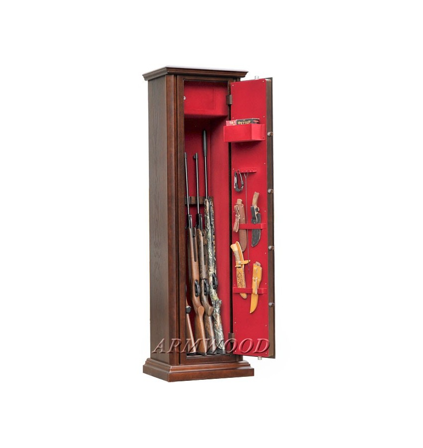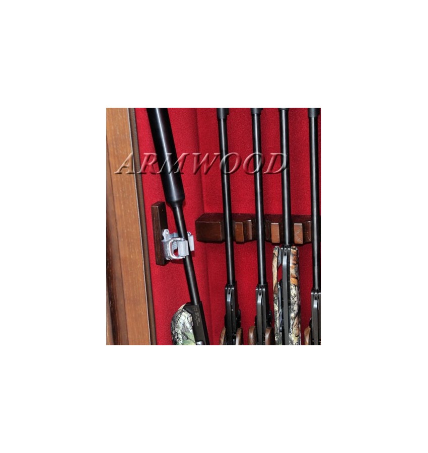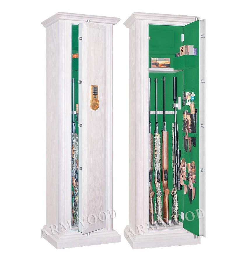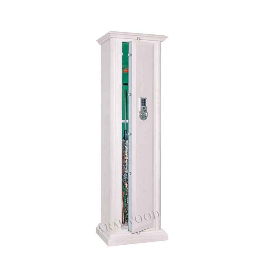Элитный оружейный сейф с отделкой натуральным деревом. Сейфы полностью удовлетворяют требованиям МВД к хранению оружия. Замок Сейф оборудован высокосекретным сертифицированным электронным кодовым замком La Gard (США). Этот замок Вы можете использовать с одним пользовательским кодом либо с двумя кодами: код руководителя (мастер-код) и рабочий код. Подробная и понятная инструкция на русском языке прилагается. Питание электронного замка от стандартной батарейки. Долгий срок службы батарейки. Простая смена разряженной батарейки. Сейф имеет мощную вертикальную и горизонтальную ригельную систему с запиранием по всем сторонам. Защита Дверь сейфа имеет коробчатую конструкцию для дополнительного усиления. Петли внутренние из стали 6мм. Усиленный корпус. Внутреннее устройство Внутри сейфа запираемое (патронное) отделение, съёмная полка и деревянные ложементы на пять стволов. Кроме того на одной из боковых стенок сейфа имеется съёмный роликовый ложемент-зажим (производства Германии) с регулируемой высотой установки, который используется для хранения шестого ствола либо для дополнительной фиксации оружия с оптикой. На внутренней поверхности двери сейфа имеются держатели для ножей и крючки для хранения шомполов, ключей и прочего. По желанию заказчика возможна поставка сейфа с дополнительным лотком на внутренней поверхности двери. По желанию заказчика возможна поставка с дополнительными полками. На внутренней поверхности одной из дверей сейфа имеются удобные крючки и два держателя для хранения ножей и пр. Внутренняя отделка Сейфы ARMWOOD модификации FLOCK имеют престижную полную внутреннюю мягкую отделку флокированием бархатом (различных цветов по нашему каталогу), например на фото – флок бордо. Полная внутренняя мягкая отделка защищает Ваше оружие от контакта с металлом, царапин повреждений и т.п. Некоторые варианты флока представлены на дополнительном фото. Установка Предусмотрена возможность крепления сейфа к стене. По желанию заказчика возможна поставка в исполнении, предусматривающем также крепление к полу. Модификации В зависимости от типа внутренней отделки имеются четыре модификации этих оружейных сейфов. Модификация Primary(базовая) имеет деревянные ложементы отделанные бархатом либо винилискожей либо ложементы «премиум». Модификации Lux и Lux+ имеют дополнительно к базовой - мягкую полную внутреннюю отделку винилискожей или бархатом. Различные варианты цвета бархата и винилискожи по нашему каталогу. New! Поступила винилискожа, имитирующая кожу крокодилов, змей и т.п. Тоже различных цветов! Модификация Lux+ отличается от модификации Lux следующим: дополнительная отделка фасада внутреннего запираемого отделения деревом. Модификация Flock имеет полную внутреннюю отделку флокированием бархатом (различных цветов по нашему каталогу) и ложементы «премиум». На фотографиях в открытом виде представлены сейфы в модификации Flock (в данном случае флок - бордо). Полная внутренняя мягкая отделка защищает Ваше оружие от контакта с металлом, царапин, повреждений и т.п. Металлические детали сейфа имеют гигиенически безопасное износо- и коррозионно-устойчивое полимерно-порошковое покрытие на основе материалов производства Италии или Франции. Имеются покрытия различных цветов и структур: металлики, антики и д.р. По желанию заказчика воз