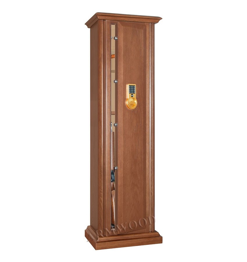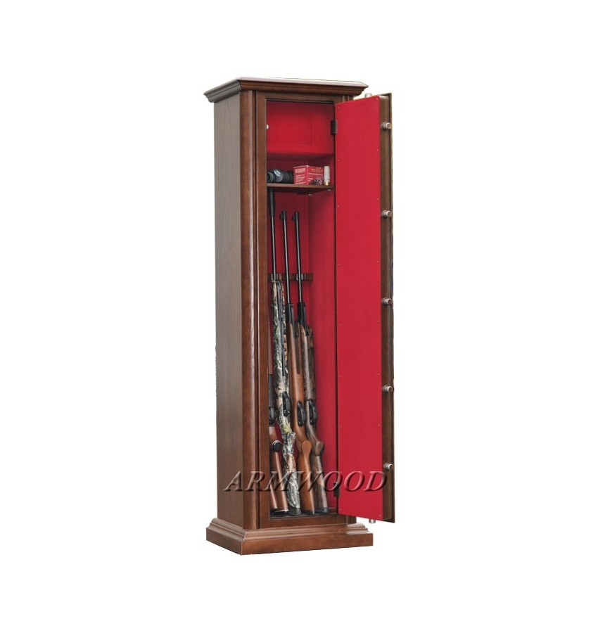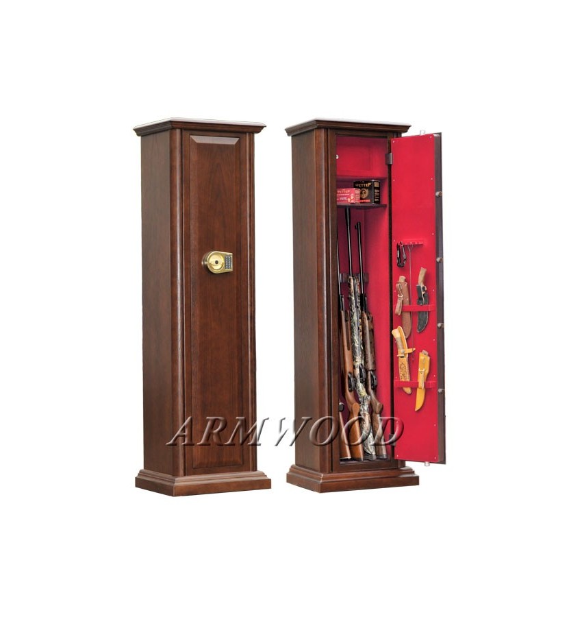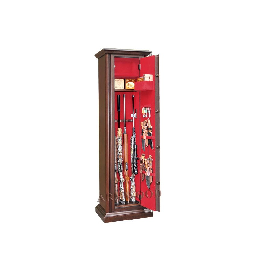Элитный оружейный сейф с отделкой натуральным деревом. Сейфы полностью удовлетворяют требованиям МВД к хранению оружия. Замок Сейф оборудован высокосекретным сертифицированным электронным кодовым замком La Gard (США). Этот замок Вы можете использовать с одним пользовательским кодом либо с двумя кодами: код руководителя (мастер-код) и рабочий код. Подробная и понятная инструкция на русском языке прилагается. Питание электронного замка от стандартной батарейки. Долгий срок службы батарейки. Простая смена разряженной батарейки. Сейф имеет мощную вертикальную и горизонтальную ригельную систему с запиранием по всем сторонам. Защита Дверь сейфа имеет коробчатую конструкцию для дополнительного усиления. Петли внутренние из стали 6мм. Усиленный корпус. Внутреннее устройство Внутри сейфа запираемое (патронное) отделение, съёмная полка и деревянные ложементы на пять стволов. Кроме того на одной из боковых стенок сейфа имеется съёмный роликовый ложемент-зажим (производства Германии) с регулируемой высотой установки, который используется для хранения шестого ствола либо для дополнительной фиксации оружия с оптикой. На внутренней поверхности двери сейфа имеются держатели для ножей и крючки для хранения шомполов, ключей и прочего. По желанию заказчика возможна поставка сейфа с дополнительным лотком на внутренней поверхности двери. По желанию заказчика возможна поставка с дополнительными полками. На внутренней поверхности одной из дверей сейфа имеются удобные крючки и два держателя для хранения ножей и пр. Внутренняя отделка Сейфы ARMWOOD модификации FLOCK имеют престижную полную внутреннюю мягкую отделку флокированием бархатом (различных цветов по нашему каталогу), например на фото – флок бордо. Полная внутренняя мягкая отделка защищает Ваше оружие от контакта с металлом, царапин повреждений и т.п. Некоторые варианты флока представлены на дополнительном фото. Установка Предусмотрена возможность крепления сейфа к стене. По желанию заказчика возможна поставка в исполнении, предусматривающем также крепление к полу. Модификации В зависимости от типа внутренней отделки имеются четыре модификации этих оружейных сейфов. Модификация Primary(базовая) имеет деревянные ложементы отделанные бархатом либо винилискожей либо ложементы «премиум». Модификации Lux и Lux+ имеют дополнительно к базовой - мягкую полную внутреннюю отделку винилискожей или бархатом. Различные варианты цвета бархата и винилискожи по нашему каталогу. New! Поступила винилискожа, имитирующая кожу крокодилов, змей и т.п. Тоже различных цветов! Модификация Lux+ отличается от модификации Lux следующим: дополнительная отделка фасада внутреннего запираемого отделения деревом. Модификация Flock имеет полную внутреннюю отделку флокированием бархатом (различных цветов по нашему каталогу) и ложементы «премиум». На фотографиях в открытом виде представлены сейфы в модификации Flock (в данном случае флок - бордо). Полная внутренняя мягкая отделка защищает Ваше оружие от контакта с металлом, царапин, повреждений и т.п. Металлические детали сейфа имеют гигиенически безопасное износо- и коррозионно-устойчивое полимерно-порошковое покрытие на основе материалов производства Италии или Франции. Имеются покрытия различных цветов и структур: металлики, антики и д.р. По желанию заказчика воз