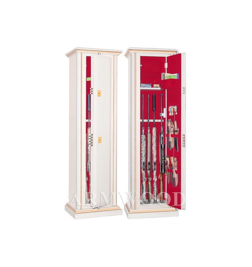 Элитный оружейный сейф с отделкой натуральным деревом. Окрашенное дерево (по каталогу RAL) с патинированием. Сейфы полностью удовлетворяют требованиям МВД к хранению оружия. Замок Сейф оборудован двумя сертифицированными ключевыми замками: замок 4-го класса!!! повышенной взломостойкости и секретности (1,5 миллиона комбинаций) плюс замок 3 класса. Замки разработаны совместно с Cisa (Италия). По желанию заказчика возможна поставка сейфов с замками производства Германии: Mauer или Wittkopp. Сейф имеет мощную вертикальную и горизонтальную ригельную систему с запиранием по всем сторонам. Защита Дверь сейфа имеет коробчатую конструкцию для дополнительного усиления. Петли внутренние из стали 6мм. Усиленный корпус. Внутреннее устройство Внутри сейфа запираемое (патронное) отделение, съёмная полка и деревянные ложементы на пять стволов. Кроме того на одной из боковых стенок сейфа имеется съёмный роликовый ложемент-зажим (производства Германии) с регулируемой высотой установки, который используется для хранения шестого ствола либо для дополнительной фиксации оружия с оптикой. На внутренней поверхности двери сейфа имеются держатели для ножей и крючки для хранения шомполов, ключей и прочего. По желанию заказчика возможна поставка сейфа с дополнительным лотком на внутренней поверхности двери (как на фото). По желанию заказчика возможна поставка с дополнительными полками. На внутренней поверхности одной из дверей сейфа имеются удобные крючки и два держателя для хранения ножей и пр. Внутренняя отделка Сейфы ARMWOOD модификации FLOCK имеют престижную полную внутреннюю мягкую отделку флокированием бархатом (различных цветов по нашему каталогу), например на фото – флок красный. Полная внутренняя мягкая отделка защищает Ваше оружие от контакта с металлом, царапин повреждений и т.п. Некоторые варианты флока представлены на дополнительном фото. Установка Предусмотрена возможность крепления сейфа к стене. По желанию заказчика возможна поставка в исполнении, предусматривающем также крепление к полу. Модификации В зависимости от типа внутренней отделки имеются четыре модификации этих оружейных сейфов. Модификация Primary(базовая) имеет деревянные ложементы отделанные бархатом либо винилискожей либо ложементы «премиум». Модификации Lux и Lux+ имеют дополнительно к базовой - мягкую полную внутреннюю отделку винилискожей или бархатом. Различные варианты цвета бархата и винилискожи по нашему каталогу. New! Поступила винилискожа, имитирующая кожу крокодилов, змей и т.п. Тоже различных цветов! Модификация Lux+ отличается от модификации Lux следующим: дополнительная отделка фасада внутреннего запираемого отделения деревом. Модификация Flock имеет полную внутреннюю отделку флокированием бархатом (различных цветов по нашему каталогу) и ложементы «премиум». На фотографиях в открытом виде представлены сейфы в модификации Flock (в данном случае флок - бордо). Полная внутренняя мягкая отделка защищает Ваше оружие от контакта с металлом, царапин, повреждений и т.п. Металлические детали сейфа имеют гигиенически безопасное износо- и коррозионно-устойчивое полимерно-порошковое покрытие на основе материалов производства Италии или Франции. Имеются покрытия различных цветов и структур: металлики, антики и д.р. По желанию заказчика возможно изменение размеров, конструкци