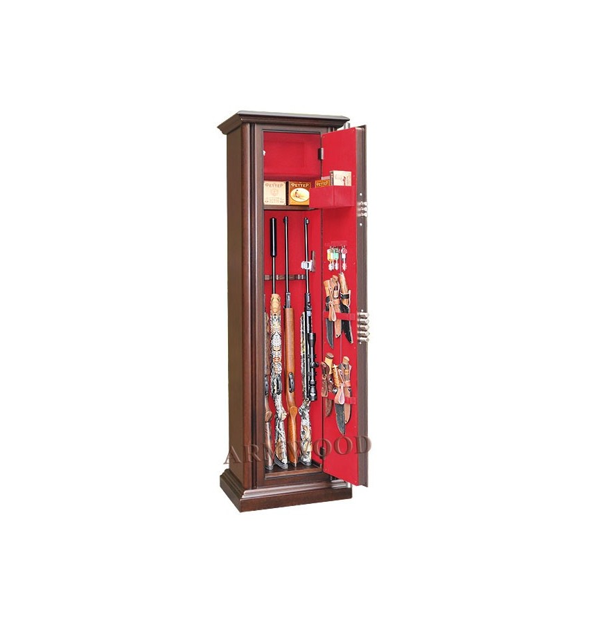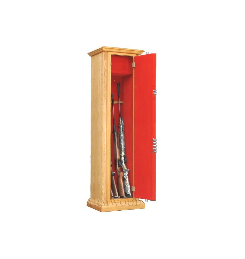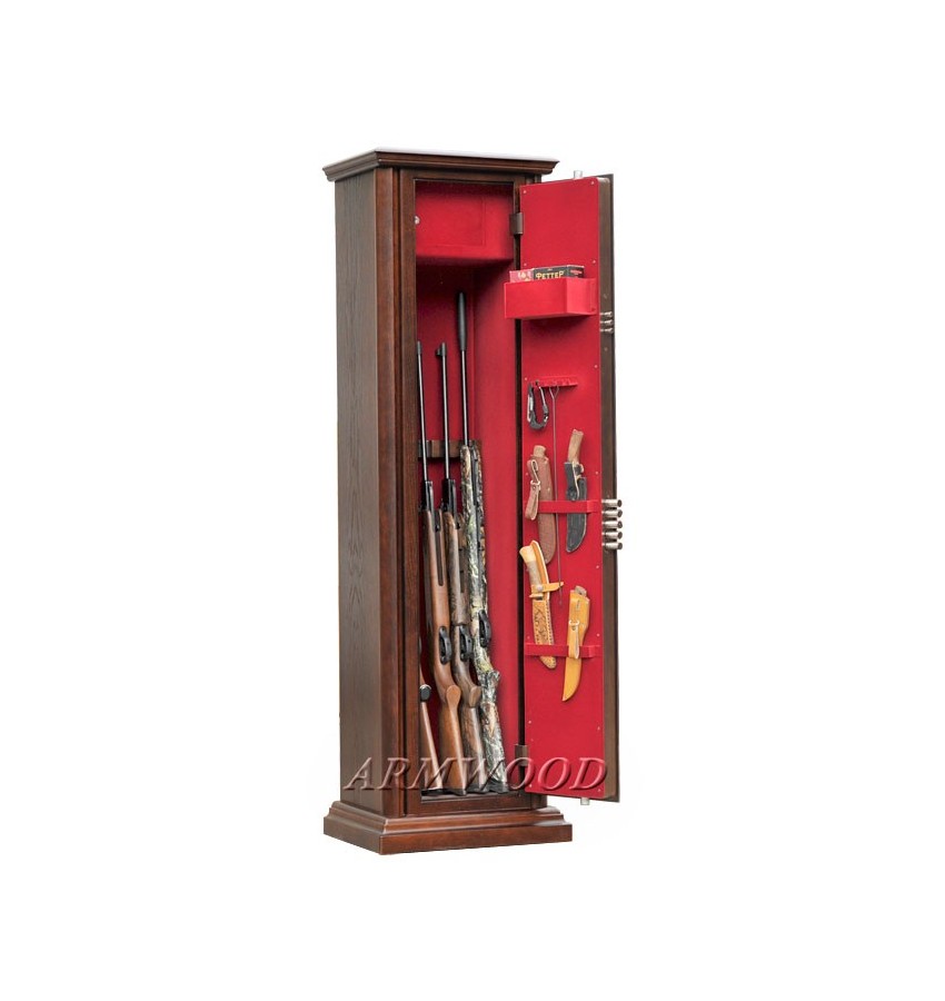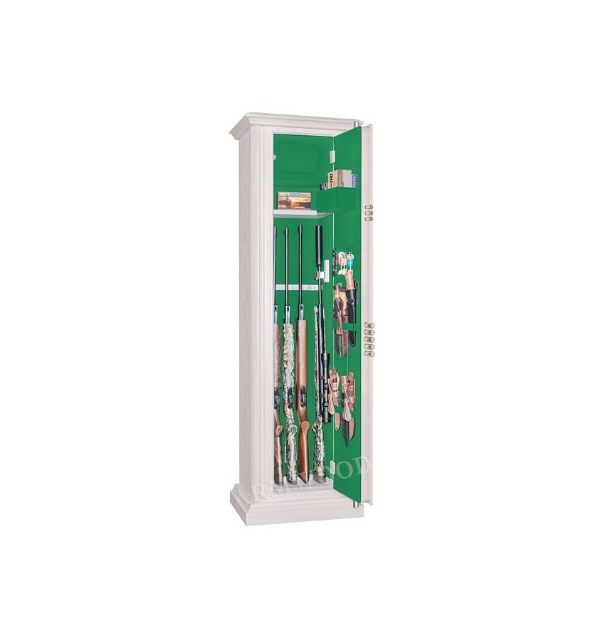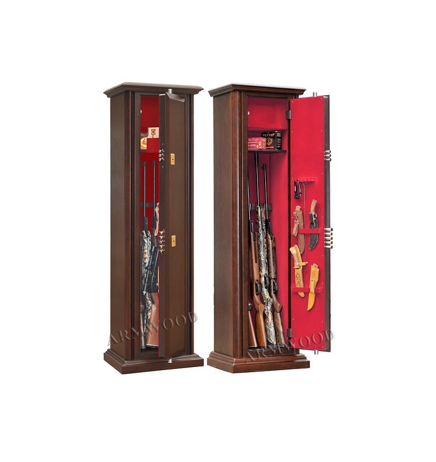 Элитный оружейный сейф с отделкой натуральным деревом. Сейфы полностью удовлетворяют требованиям МВД к хранению оружия. Замок Сейф оборудован двумя сертифицированными ключевыми замками: замок 4-го класса!!! повышенной взломостойкости и секретности (1,5 миллиона комбинаций) плюс замок 3 класса. Замки разработаны совместно с Cisa (Италия). По желанию заказчика возможна поставка сейфов с замками производства Германии: Mauer или Wittkopp. Сейф имеет мощную вертикальную и горизонтальную ригельную систему с запиранием по всем сторонам. Защита Дверь сейфа имеет коробчатую конструкцию для дополнительного усиления. Петли внутренние из стали 6мм. Усиленный корпус. Внутреннее устройство Внутри сейфа запираемое (патронное) отделение, съёмная полка и деревянные ложементы на пять стволов. Кроме того на одной из боковых стенок сейфа имеется съёмный роликовый ложемент-зажим (производства Германии) с регулируемой высотой установки, который используется для хранения шестого ствола либо для дополнительной фиксации оружия с оптикой. На внутренней поверхности двери сейфа имеются держатели для ножей и крючки для хранения шомполов, ключей и прочего. По желанию заказчика возможна поставка сейфа с дополнительным лотком на внутренней поверхности двери. По желанию заказчика возможна поставка с дополнительными полками. На внутренней поверхности одной из дверей сейфа имеются удобные крючки и два держателя для хранения ножей и пр. Внутренняя отделка Сейфы ARMWOOD модификации FLOCK имеют престижную полную внутреннюю мягкую отделку флокированием бархатом (различных цветов по нашему каталогу), например на фото – флок бордо. Полная внутренняя мягкая отделка защищает Ваше оружие от контакта с металлом, царапин повреждений и т.п. Некоторые варианты флока представлены на дополнительном фото. Установка Предусмотрена возможность крепления сейфа к стене. По желанию заказчика возможна поставка в исполнении, предусматривающем также крепление к полу. Модификации В зависимости от типа внутренней отделки имеются четыре модификации этих оружейных сейфов. Модификация Primary(базовая) имеет деревянные ложементы отделанные бархатом либо винилискожей либо ложементы «премиум». Модификации Lux и Lux+ имеют дополнительно к базовой - мягкую полную внутреннюю отделку винилискожей или бархатом. Различные варианты цвета бархата и винилискожи по нашему каталогу. New! Поступила винилискожа, имитирующая кожу крокодилов, змей и т.п. Тоже различных цветов! Модификация Lux+ отличается от модификации Lux следующим: дополнительная отделка фасада внутреннего запираемого отделения деревом. Модификация Flock имеет полную внутреннюю отделку флокированием бархатом (различных цветов по нашему каталогу) и ложементы «премиум». На фотографиях в открытом виде представлены сейфы в модификации Flock (в данном случае флок - бордо). Полная внутренняя мягкая отделка защищает Ваше оружие от контакта с металлом, царапин, повреждений и т.п. Металлические детали сейфа имеют гигиенически безопасное износо- и коррозионно-устойчивое полимерно-порошковое покрытие на основе материалов производства Италии или Франции. Имеются покрытия различных цветов и структур: металлики, антики и д.р. По желанию заказчика возможно изменение размеров, конструкции, внутреннего устройства и т.п. Возможна замена верхних деревянны