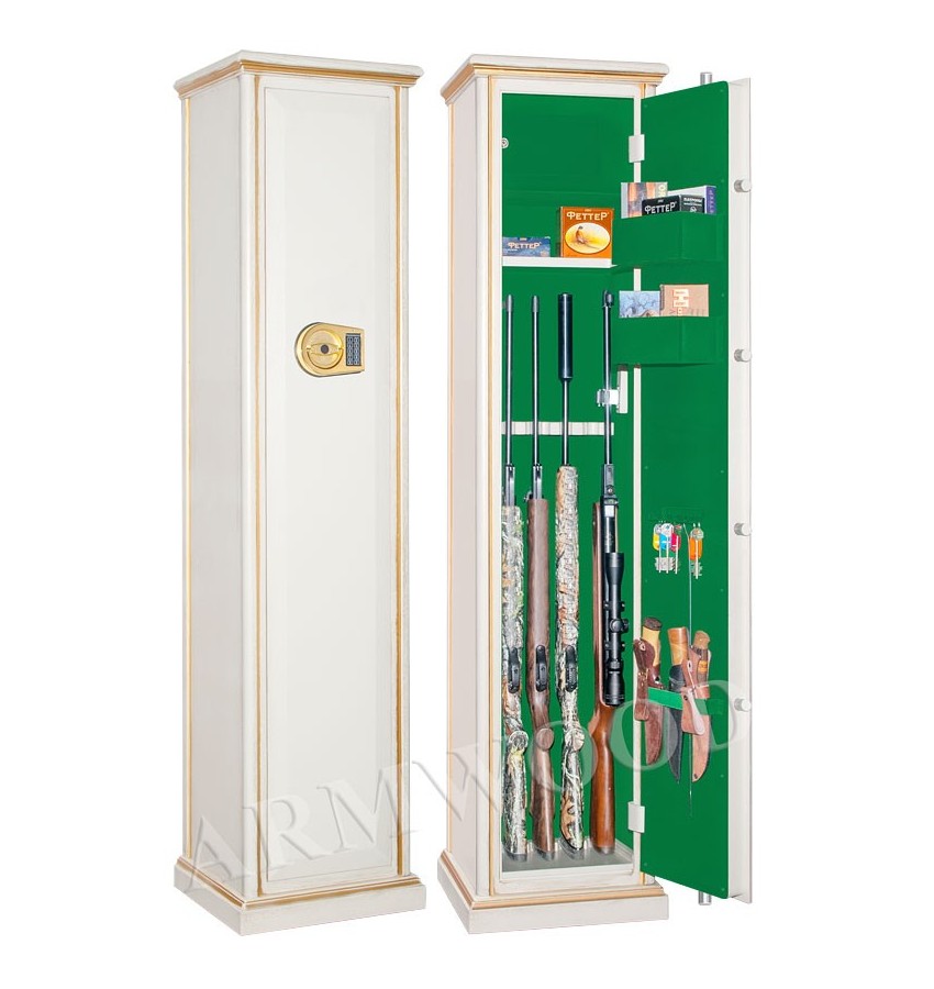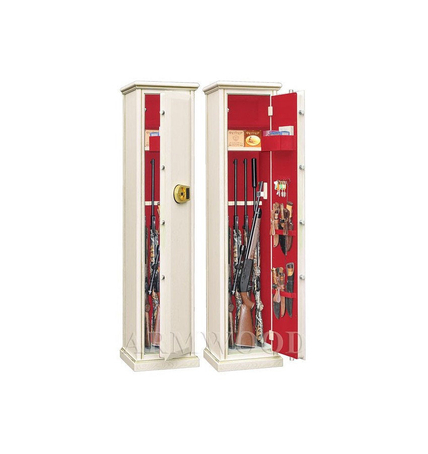 Элитный оружейный сейф с отделкой натуральным деревом. Окрашенное дерево (по каталогу RAL) с патинированием. Сейфы полностью удовлетворяют требованиям МВД к хранению оружия. Замок Сейф оборудован высокосекретным сертифицированным электронным кодовым замком La Gard (США). Этот замок Вы можете использовать с одним пользовательским кодом либо с двумя кодами: код руководителя (мастер-код) и рабочий код. Подробная и понятная инструкция на русском языке прилагается. Питание электронного замка от стандартной батарейки. Долгий срок службы батарейки. Простая смена разряженной батарейки. Сейф имеет мощную вертикальную и горизонтальную ригельную систему с запиранием по всем сторонам. Защита Дверь сейфа имеет коробчатую конструкцию для дополнительного усиления. Петли внутренние из стали 6мм. Усиленный корпус. Внутреннее устройство Внутри сейфа запираемое (патронное) отделение, съёмная полка и деревянные ложементы на пять стволов. Кроме того на одной из боковых стенок сейфа имеется съёмный роликовый ложемент-зажим (производства Германии) с регулируемой высотой установки, который используется для хранения шестого ствола либо для дополнительной фиксации оружия с оптикой. На внутренней поверхности двери сейфа имеются держатели для ножей и крючки для хранения шомполов, ключей и прочего. По желанию заказчика возможна поставка сейфа с дополнительным лотком на внутренней поверхности двери (как на фото в открытом виде). По желанию заказчика возможна поставка с дополнительными полками. На внутренней поверхности одной из дверей сейфа имеются удобные крючки и два держателя для хранения ножей и пр. Внутренняя отделка Сейфы ARMWOOD модификации FLOCK имеют престижную полную внутреннюю мягкую отделку флокированием бархатом (различных цветов по нашему каталогу), например на фото – флок бордо. Полная внутренняя мягкая отделка защищает Ваше оружие от контакта с металлом, царапин повреждений и т.п. Некоторые варианты флока представлены на дополнительном фото. Установка Предусмотрена возможность крепления сейфа к стене. По желанию заказчика возможна поставка в исполнении, предусматривающем также крепление к полу. Модификации В зависимости от типа внутренней отделки имеются четыре модификации этих оружейных сейфов. Модификация Primary(базовая) имеет деревянные ложементы отделанные бархатом либо винилискожей либо ложементы «премиум». Модификации Lux и Lux+ имеют дополнительно к базовой - мягкую полную внутреннюю отделку винилискожей или бархатом. Различные варианты цвета бархата и винилискожи по нашему каталогу. New! Поступила винилискожа, имитирующая кожу крокодилов, змей и т.п. Тоже различных цветов! Модификация Lux+ отличается от модификации Lux следующим: дополнительная отделка фасада внутреннего запираемого отделения деревом. Модификация Flock имеет полную внутреннюю отделку флокированием бархатом (различных цветов по нашему каталогу) и ложементы «премиум». На фотографиях в открытом виде представлены сейфы в модификации Flock (в данном случае флок - бордо). Полная внутренняя мягкая отделка защищает Ваше оружие от контакта с металлом, царапин, повреждений и т.п. Металлические детали сейфа имеют гигиенически безопасное износо- и коррозионно-устойчивое полимерно-порошковое покрытие на основе материалов производства Италии или Франции. Имеются покрыт
