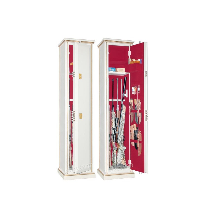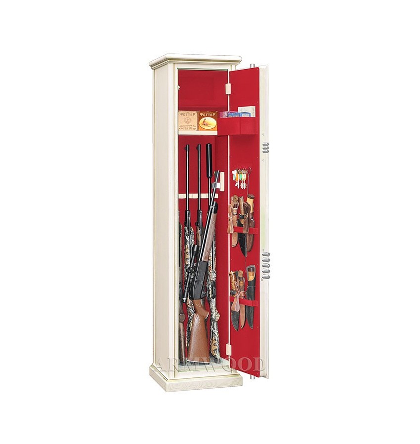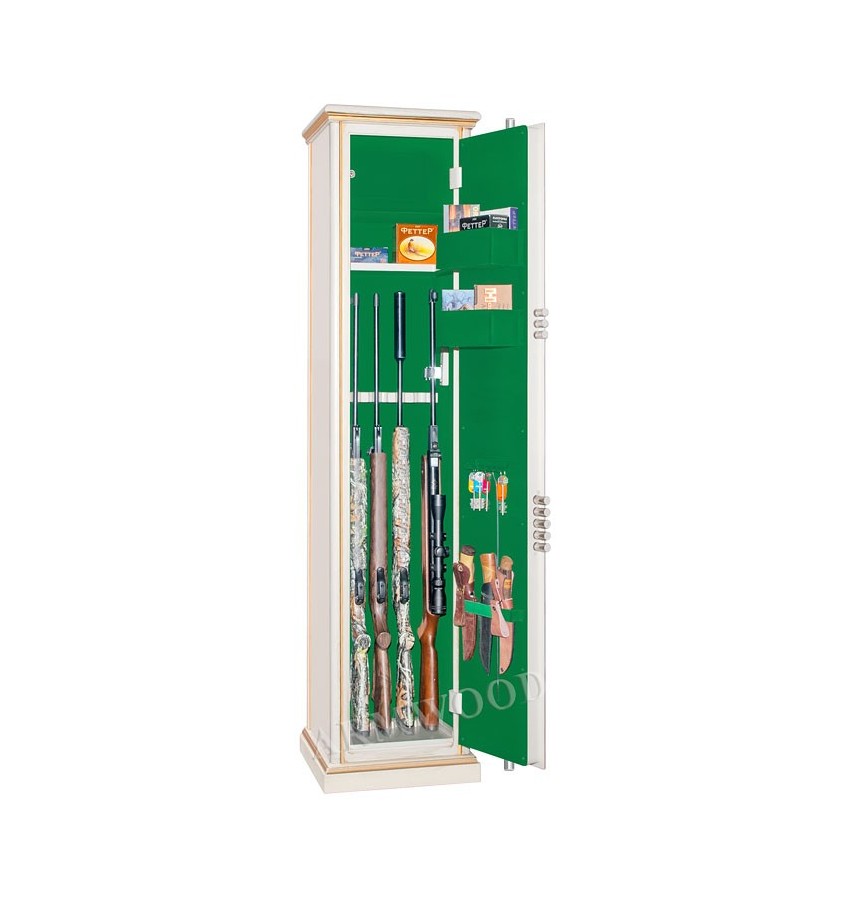 Элитный оружейный сейф с отделкой натуральным деревом. Окрашенное дерево (по каталогу RAL) с патинированием. Сейфы полностью удовлетворяют требованиям МВД к хранению оружия. Замок Сейф оборудован двумя сертифицированными ключевыми замками: замок 4-го класса!!! повышенной взломостойкости и секретности (1,5 миллиона комбинаций) плюс замок 3 класса. Замки разработаны совместно с Cisa (Италия). По желанию заказчика возможна поставка сейфов с замками производства Германии: Mauer или Wittkopp. Сейф имеет мощную вертикальную и горизонтальную ригельную систему с запиранием по всем сторонам. Защита Дверь сейфа имеет коробчатую конструкцию для дополнительного усиления. Петли внутренние из стали 6мм. Усиленный корпус. Внутреннее устройство Внутри сейфа запираемое (патронное) отделение, съёмная полка и деревянные ложементы на пять стволов. Кроме того на одной из боковых стенок сейфа имеется съёмный роликовый ложемент-зажим (производства Германии) с регулируемой высотой установки, который используется для хранения шестого ствола либо для дополнительной фиксации оружия с оптикой. На внутренней поверхности двери сейфа имеются держатели для ножей и крючки для хранения шомполов, ключей и прочего. По желанию заказчика возможна поставка сейфа с дополнительным лотком на внутренней поверхности двери (как на фото). По желанию заказчика возможна поставка с дополнительными полками. На внутренней поверхности одной из дверей сейфа имеются удобные крючки и два держателя для хранения ножей и пр. Внутренняя отделка Сейфы ARMWOOD модификации FLOCK имеют престижную полную внутреннюю мягкую отделку флокированием бархатом (различных цветов по нашему каталогу), например на фото – флок бордо. Полная внутренняя мягкая отделка защищает Ваше оружие от контакта с металлом, царапин повреждений и т.п. Некоторые варианты флока представлены на дополнительном фото. Установка Предусмотрена возможность крепления сейфа к стене. По желанию заказчика возможна поставка в исполнении, предусматривающем также крепление к полу. Модификации В зависимости от типа внутренней отделки имеются четыре модификации этих оружейных сейфов. Модификация Primary(базовая) имеет деревянные ложементы отделанные бархатом либо винилискожей либо ложементы «премиум». Модификации Lux и Lux+ имеют дополнительно к базовой - мягкую полную внутреннюю отделку винилискожей или бархатом. Различные варианты цвета бархата и винилискожи по нашему каталогу. New! Поступила винилискожа, имитирующая кожу крокодилов, змей и т.п. Тоже различных цветов! Модификация Lux+ отличается от модификации Lux следующим: дополнительная отделка фасада внутреннего запираемого отделения деревом. Модификация Flock имеет полную внутреннюю отделку флокированием бархатом (различных цветов по нашему каталогу) и ложементы «премиум». На фотографиях в открытом виде представлены сейфы в модификации Flock (в данном случае флок - бордо). Полная внутренняя мягкая отделка защищает Ваше оружие от контакта с металлом, царапин, повреждений и т.п. Металлические детали сейфа имеют гигиенически безопасное износо- и коррозионно-устойчивое полимерно-порошковое покрытие на основе материалов производства Италии или Франции. Имеются покрытия различных цветов и структур: металлики, антики и д.р. По желанию заказчика возможно изменение размеров, конструкции, 