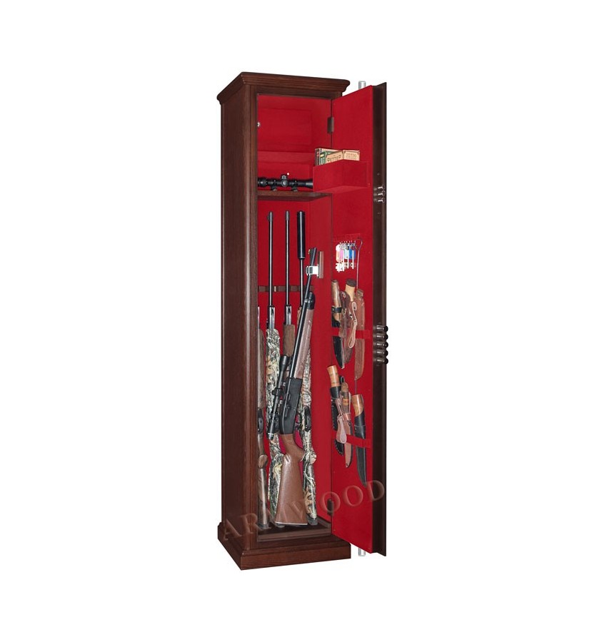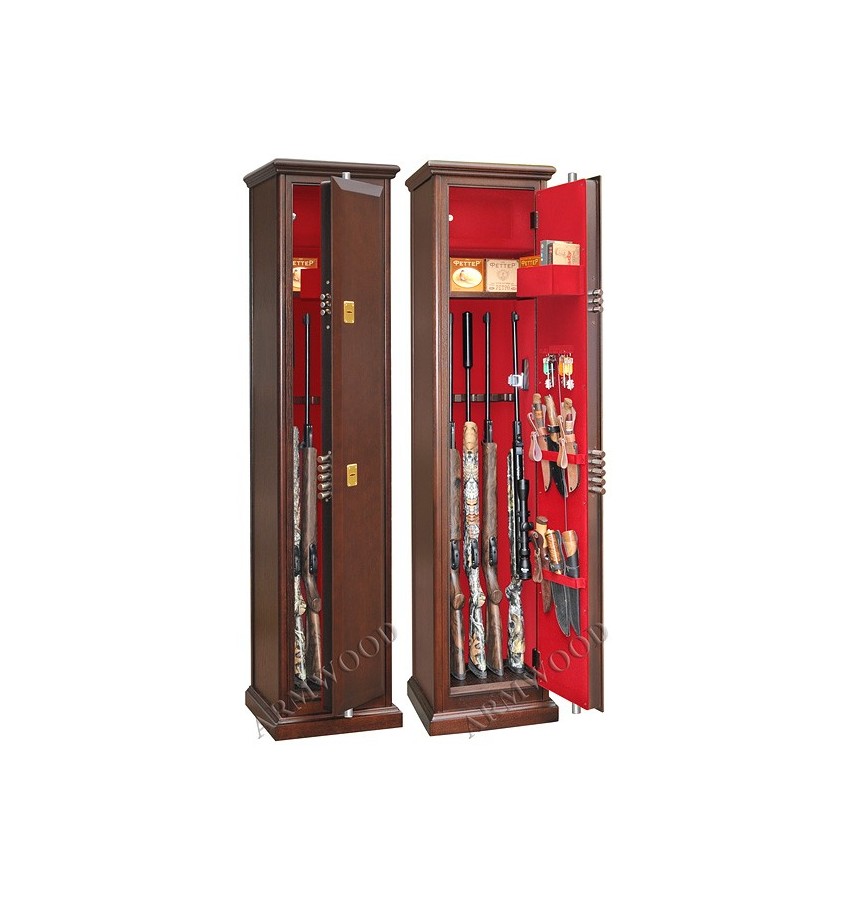 Элитный оружейный сейф с отделкой натуральным деревом. Сейфы полностью удовлетворяют требованиям МВД к хранению оружия. Замок Сейф оборудован двумя сертифицированными ключевыми замками: замок 4-го класса!!! повышенной взломостойкости и секретности (1,5 миллиона комбинаций) плюс замок 3 класса. Замки разработаны совместно с Cisa (Италия). По желанию заказчика возможна поставка сейфов с замками производства Германии: Mauer или Wittkopp. Сейф имеет мощную вертикальную и горизонтальную ригельную систему с запиранием по всем сторонам. Защита Дверь сейфа имеет коробчатую конструкцию для дополнительного усиления. Петли внутренние из стали 6мм. Усиленный корпус. Внутреннее устройство Внутри сейфа запираемое (патронное) отделение, съёмная полка и деревянные ложементы на пять стволов. Кроме того на одной из боковых стенок сейфа имеется съёмный роликовый ложемент-зажим (производства Германии) с регулируемой высотой установки, который используется для хранения шестого ствола либо для дополнительной фиксации оружия с оптикой. На внутренней поверхности двери сейфа имеются держатели для ножей и крючки для хранения шомполов, ключей и прочего. По желанию заказчика возможна поставка сейфа с дополнительным лотком на внутренней поверхности двери (как на фото). По желанию заказчика возможна поставка с дополнительными полками. На внутренней поверхности одной из дверей сейфа имеются удобные крючки и два держателя для хранения ножей и пр. Внутренняя отделка Сейфы ARMWOOD модификации FLOCK имеют престижную полную внутреннюю мягкую отделку флокированием бархатом (различных цветов по нашему каталогу), например на фото – флок бордо. Полная внутренняя мягкая отделка защищает Ваше оружие от контакта с металлом, царапин повреждений и т.п. Некоторые варианты флока представлены на дополнительном фото. Установка Предусмотрена возможность крепления сейфа к стене. По желанию заказчика возможна поставка в исполнении, предусматривающем также крепление к полу. Модификации В зависимости от типа внутренней отделки имеются четыре модификации этих оружейных сейфов. Модификация Primary(базовая) имеет деревянные ложементы отделанные бархатом либо винилискожей либо ложементы «премиум». Модификации Lux и Lux+ имеют дополнительно к базовой - мягкую полную внутреннюю отделку винилискожей или бархатом. Различные варианты цвета бархата и винилискожи по нашему каталогу. New! Поступила винилискожа, имитирующая кожу крокодилов, змей и т.п. Тоже различных цветов! Модификация Lux+ отличается от модификации Lux следующим: дополнительная отделка фасада внутреннего запираемого отделения деревом. Модификация Flock имеет полную внутреннюю отделку флокированием бархатом (различных цветов по нашему каталогу) и ложементы «премиум». На фотографиях в открытом виде представлены сейфы в модификации Flock (в данном случае флок - бордо). Полная внутренняя мягкая отделка защищает Ваше оружие от контакта с металлом, царапин, повреждений и т.п. Металлические детали сейфа имеют гигиенически безопасное износо- и коррозионно-устойчивое полимерно-порошковое покрытие на основе материалов производства Италии или Франции. Имеются покрытия различных цветов и структур: металлики, антики и д.р. По желанию заказчика возможно изменение размеров, конструкции, внутреннего устройства и т.п. Возможна замена верхн