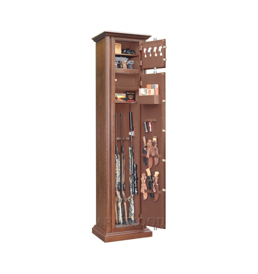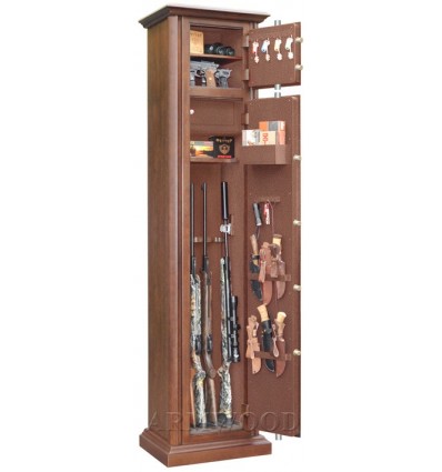 Элитный оружейный сейф с отделкой натуральным деревом. Сейфы полностью удовлетворяют требованиям МВД к хранению оружия. Замок Каждая из дверей сейфа (дверь верхней секции и дверь нижней секции) имеет собственный электронный замок, а так же вертикальную и горизонтальную ригельную систему с запиранием по всем сторонам. Применяются высокосекретные сертифицированные электронные кодовые замки La Gard (США). Такой замок Вы можете использовать с одним пользовательским кодом либо с двумя кодами: код руководителя (мастер-код) и рабочий код. Подробная и понятная инструкция на русском языке прилагается. Питание электронного замка от стандартной батарейки. Долгий срок службы батарейки. Простая смена разряженной батарейки. Защита Двери сейфа имеют коробчатую конструкцию для дополнительного усиления. Петли внутренние из стали 6мм. Усиленный корпус. Внутреннее устройство Внутри нижней секции сейфа запираемое (патронное) отделение, съёмная полка и деревянные ложементы на пять стволов. Кроме того на одной из боковых стенок нижней секции сейфа имеется съёмный роликовый ложемент-зажим (производства Германии) с регулируемой высотой установки, который используется для хранения шестого ствола либо для дополнительной фиксации оружия с оптикой. На внутренней поверхности двери нижней секции имеются: удобный лоток, держатели для ножей и крючки для хранения шомполов, ключей и прочего. По желанию заказчика возможна поставка с дополнительными полками. Внутри верхней секции – съёмная полка. На внутренней поверхности двери верхней секции имеются удобные крючки (8 штук). Внутренняя отделка Для сейфов ARMWOOD модификации PRIMARY имеется возможность выбрать различные варианты полимерно-порошковых покрытий. Имеются покрытия различных цветов и структур. Некоторые варианты полимерно-порошковых покрытий представлены на дополнительном фото. Установка Предусмотрена возможность крепления сейфа к стене. По желанию заказчика возможна поставка в исполнении, предусматривающем также крепление к полу. Модификации В зависимости от типа внутренней отделки имеются четыре модификации этих оружейных сейфов. Модификация Primary(базовая) имеет деревянные ложементы отделанные бархатом либо винилискожей либо ложементы «премиум». Модификации Lux и Lux+ имеют дополнительно к базовой - мягкую полную внутреннюю отделку винилискожей или бархатом. Различные варианты цвета бархата и винилискожи по нашему каталогу. New! Поступила винилискожа, имитирующая кожу крокодилов, змей и т.п. Тоже различных цветов! Модификация Lux+ отличается от модификации Lux следующим: дополнительная отделка фасада внутреннего запираемого отделения деревом. Модификация Flock имеет полную внутреннюю отделку флокированием бархатом (различных цветов по нашему каталогу) и ложементы «премиум». Металлические детали сейфа имеют гигиенически безопасное износо- и коррозионно-устойчивое полимерно-порошковое покрытие на основе материалов производства Италии или Франции. Имеются покрытия различных цветов и структур: металлики, антики и д.р. По желанию заказчика возможно изменение размеров, конструкции, внутреннего устройства, типа и количества замков (например, сочетание электронных и ключевых замков) и т.п. По желанию заказчика возможна поставка сейфов с электронными замками Mauer (Германия) вместо La Gard (США). Д