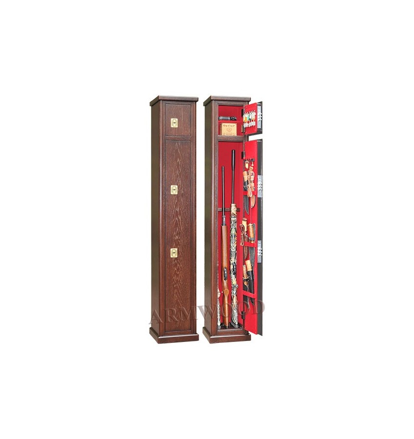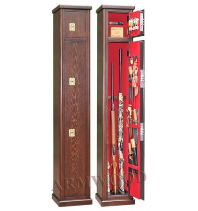 Элитный оружейный сейф с отделкой натуральным деревом. Сейфы полностью удовлетворяют требованиям МВД к хранению оружия. Замок Дверь нижней секции сейфа оборудована двумя трёхригельными сертифицированными ключевыми замками 3 класса. Дверь верхней секции сейфа оборудована сертифицированным трёхригельным замком 3 класса. Замки разработаны совместно с Cisa (Италия). По желанию заказчика возможна поставка сейфов с замками производства Германии: Mauer или Wittkopp. Защита Двери сейфа имеют коробчатую конструкцию для дополнительного усиления. Петли внутренние из стали 6мм. Усиленный корпус. Внутреннее устройство Внутри нижней секции сейфа деревянные ложементы на три ствола. На внутренней поверхности двери нижней секции имеются: держатели для ножей и крючки для хранения шомполов, ключей и прочего. По желанию заказчика возможна поставка с дополнительными полками. Внутри верхней секции – съёмная полка. На внутренней поверхности двери верхней секции сейфа имеются удобные крючки (5 штук). Сейф имеет полную внутреннюю мягкую отделку флокированием бархатом (различных цветов по нашему каталогу). Например на фото в открытом виде флок – бордо. Некоторые возможные варианты флока представлены на дополнительном фото. Полная внутренняя мягкая отделка защищает Ваше оружие от контакта с металлом, царапин, повреждений и т.п. Установка Предусмотрена возможность крепления сейфа к стене. По желанию заказчика возможна поставка в исполнении, предусматривающем также крепление к полу. Модификации Сейф может быть так же поставлен в базовой модификации Primary. По желанию заказчика возможно изменение размеров, конструкции, внутреннего устройства и т.п. Возможна замена верхних деревянных ложементов на ложементы других типов (роликовые ложементы-зажимы производства Германии, специальные ложементы для хранения оружия с крупной оптикой и т.п.). Дополнительная информация Уникальная двухсекционная конструкция этого сейфа имеет следующие дополнительные преимущества: возможность эксплуатации сейфа как одним, так и двумя пользователями, оригинальный неповторимый дизайн и др. Имеются различные варианты отделки натуральным деревом сейфов серии Armwood (под различную мебель). Возможна поставка данного сейфа в исполнении универсальный сейф. В этом случае сейф поставляется с дополнительными полками и может использоваться не только как оружейный сейф, но и как личный и офисный сейф.