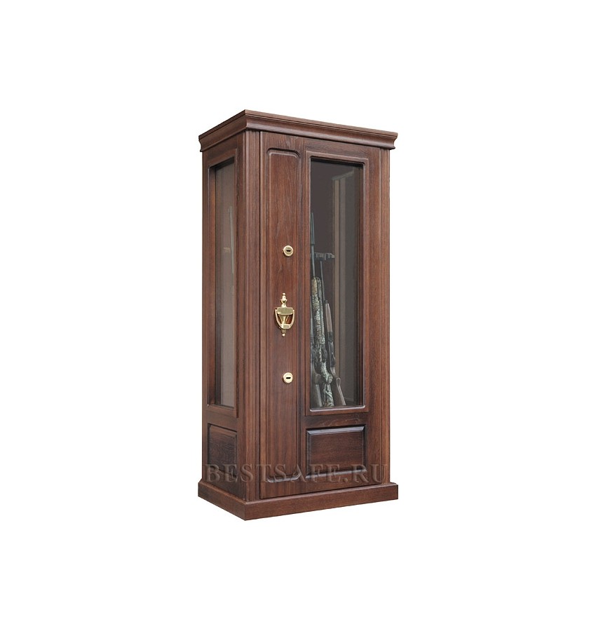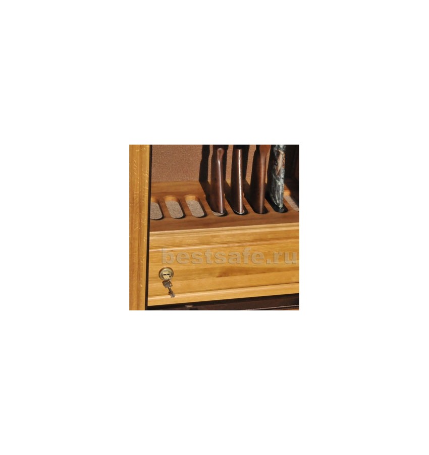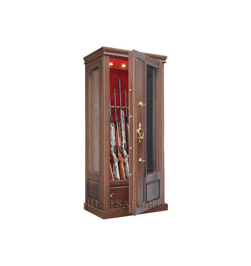 Полностью удовлетворяет требованиям МВД. Наружная поверхность сейфа отделана массивом ценных пород дерева (в базовом варианте массив дуба). Имеются различные варианты цвета деревянной отделки, а так же возможность изготовления по образцу Вашей мебели либо по нашему каталогу образцов дерева (всего более 15-и вариантов). Внутренняя поверхность сейфа отделана массивом ценных пород дерева и искусственным ковровым покрытием. Деревянные ложементы ручной работы. Сейф оборудован бронестеклами 2класса пулестойкости и подсветкой галогенными светильниками.