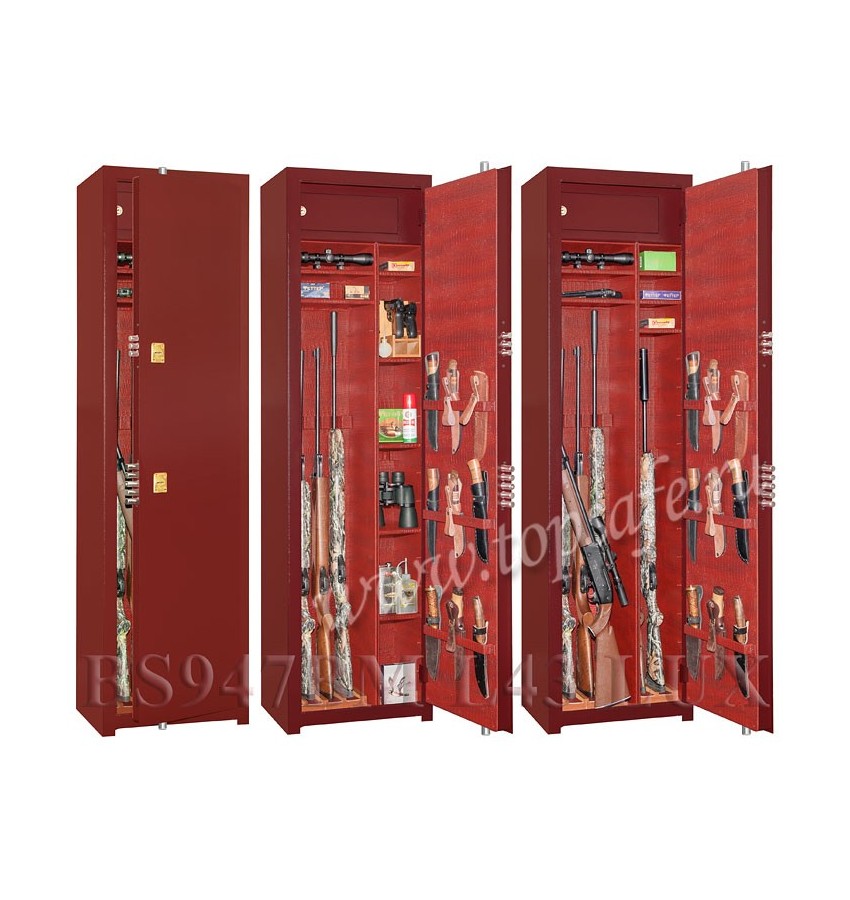 Внутри узкой области пять съёмных полок с регулируемой высотой установки, а также деревянные нижние и верхние ложементы на 2 ствола.