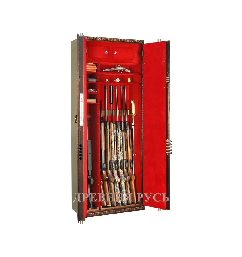 Внутри «широкой» области две длинные съёмные полки и деревянные ложементы на 6 или 7 стволов. Дополнительно возможна установка роликового ложемента-зажима для более удобного хранения оружия с оптикой либо для размещения дополнительного ствола. Обсудите это заранее при заказе со своим менеджером.