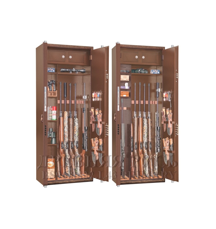 Внутри «широкой» области две длинные съёмные полки и деревянные ложементы на 6 или 7 стволов. Дополнительно возможна установка роликового ложемента-зажима для более удобного хранения оружия с оптикой либо для размещения дополнительного ствола. Обсудите это заранее при заказе со своим менеджером.